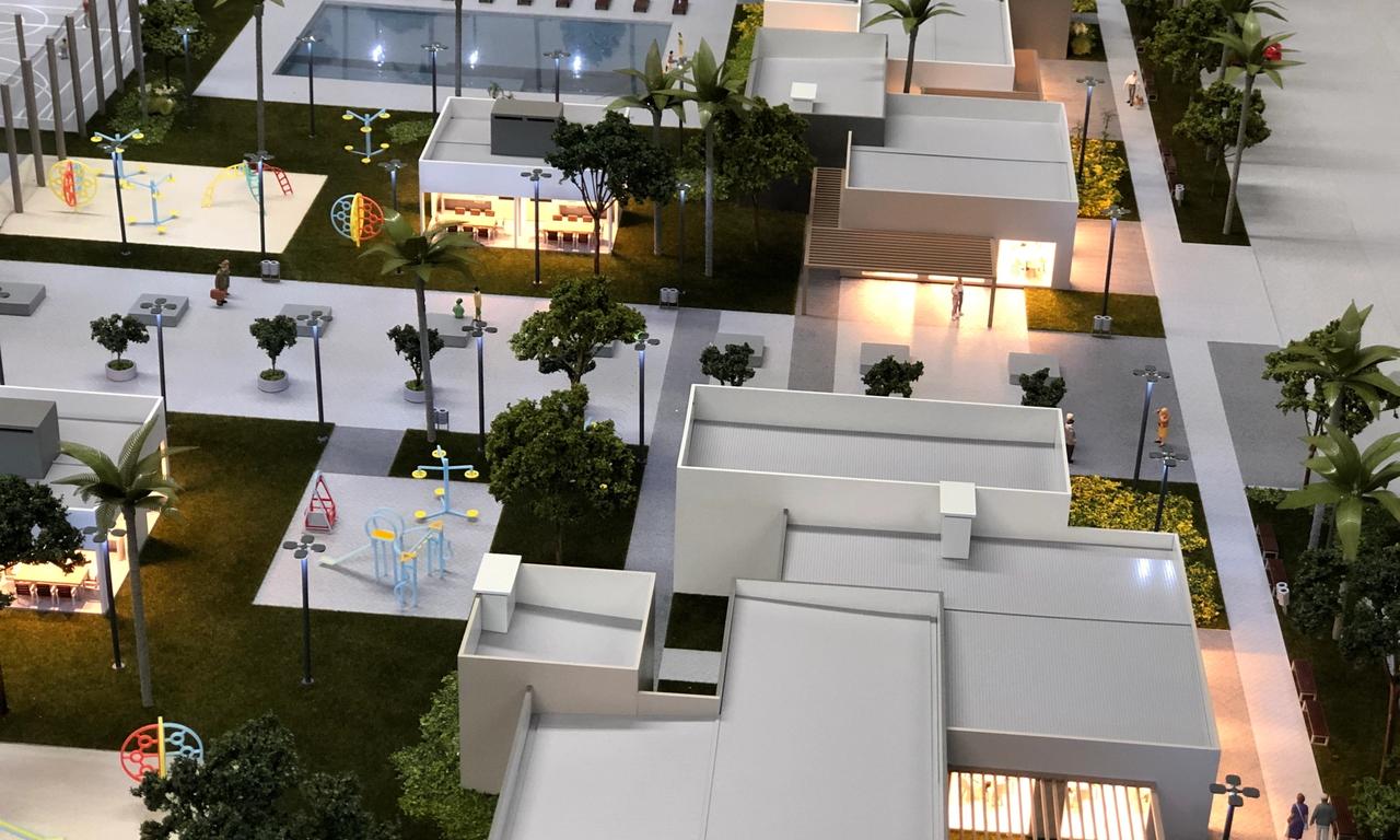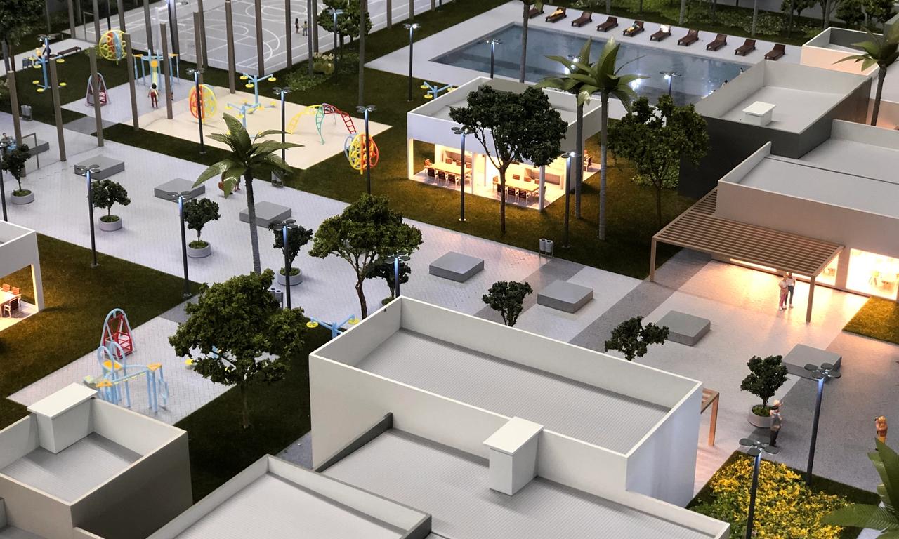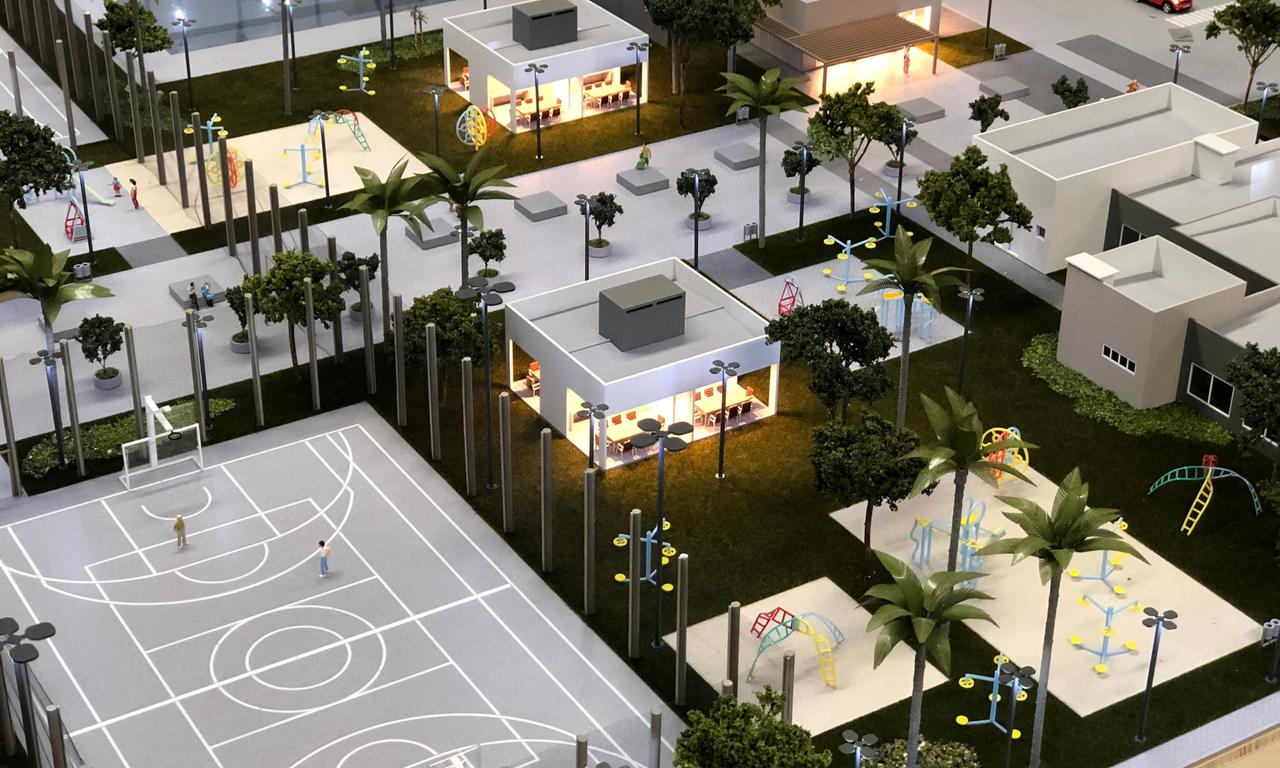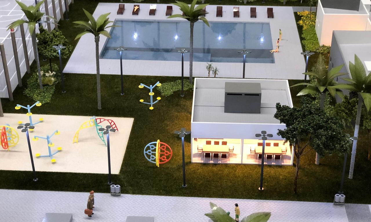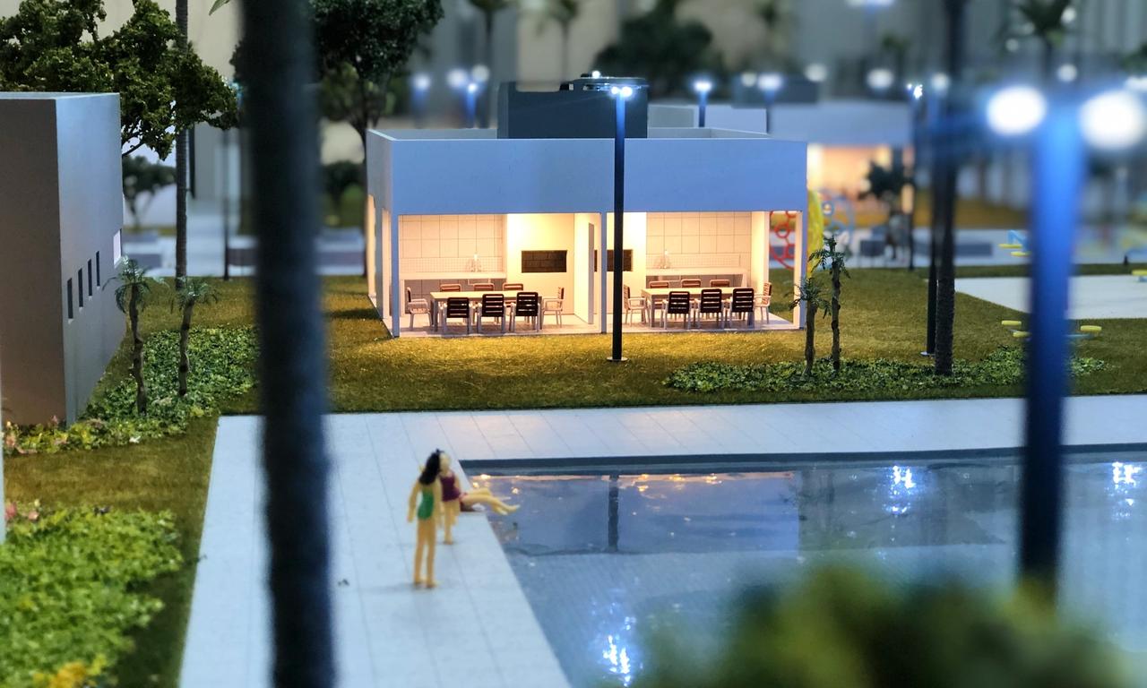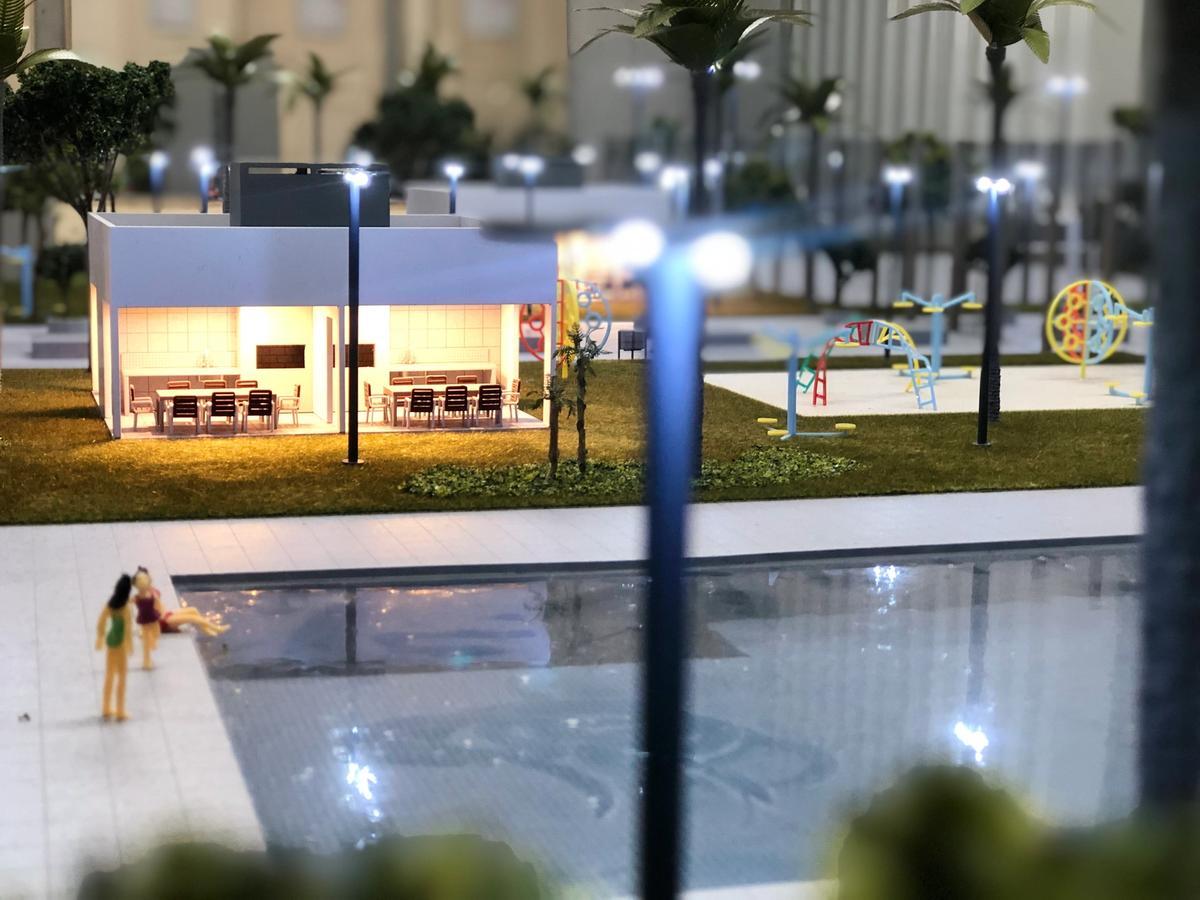 Esta maquete representa parte da área das torres, mas seu foco maior é para a área de lazer. Buscamos representar de forma a destacar muito bem os ambientes, tanto internos como externos, através do paisagismo, mobiliários e neste caso específico, a iluminação ficou sensacional.