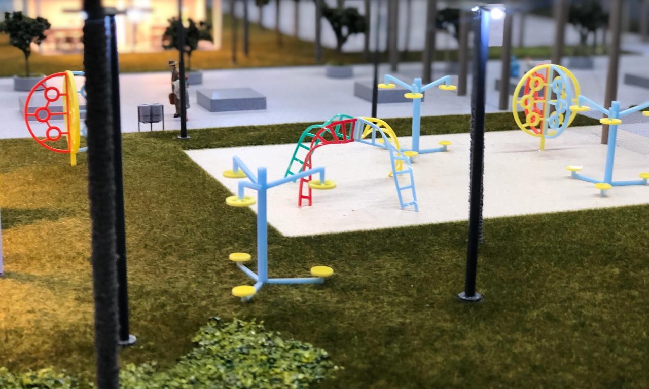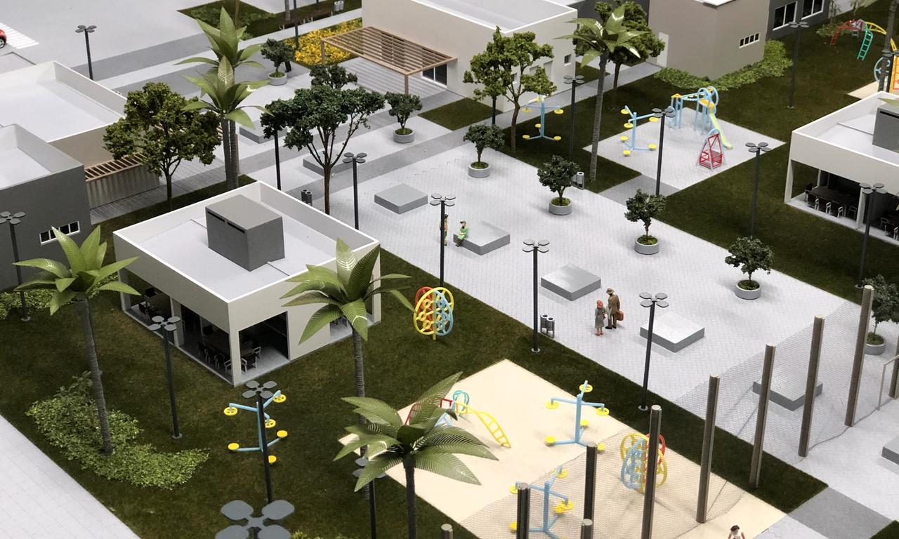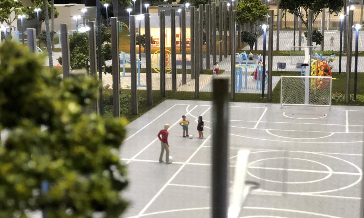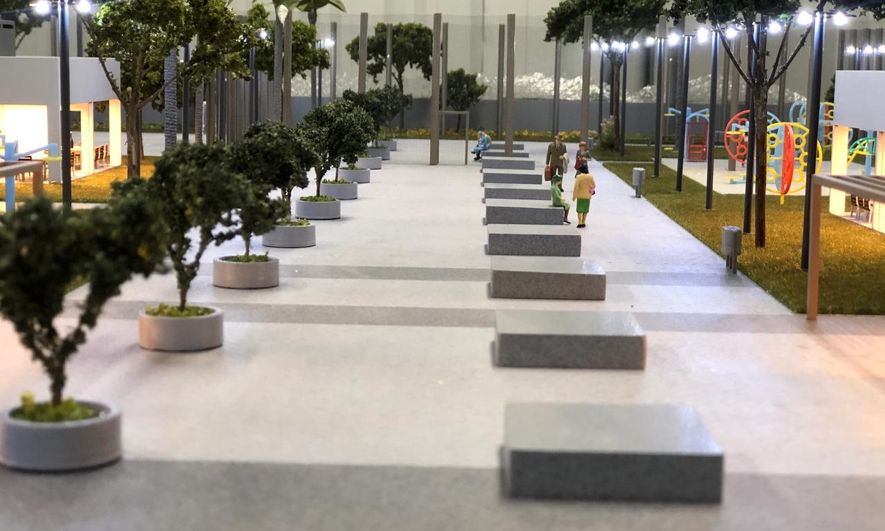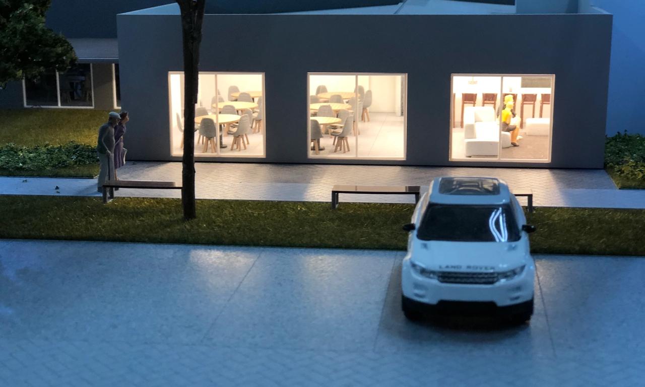 Esta maquete representa parte da área das torres, mas seu foco maior é para a área de lazer. Buscamos representar de forma a destacar muito bem os ambientes, tanto internos como externos, através do paisagismo, mobiliários e neste caso específico, a iluminação ficou sensacional.
