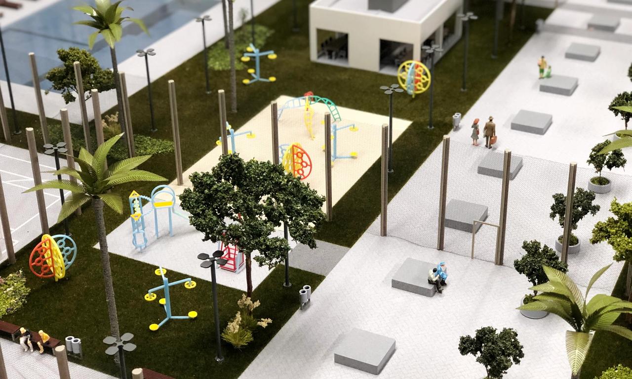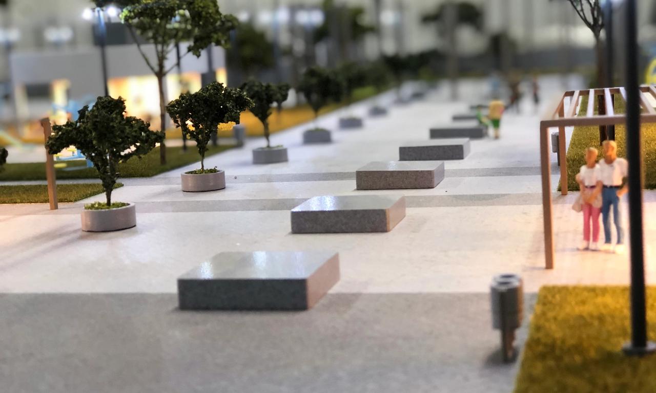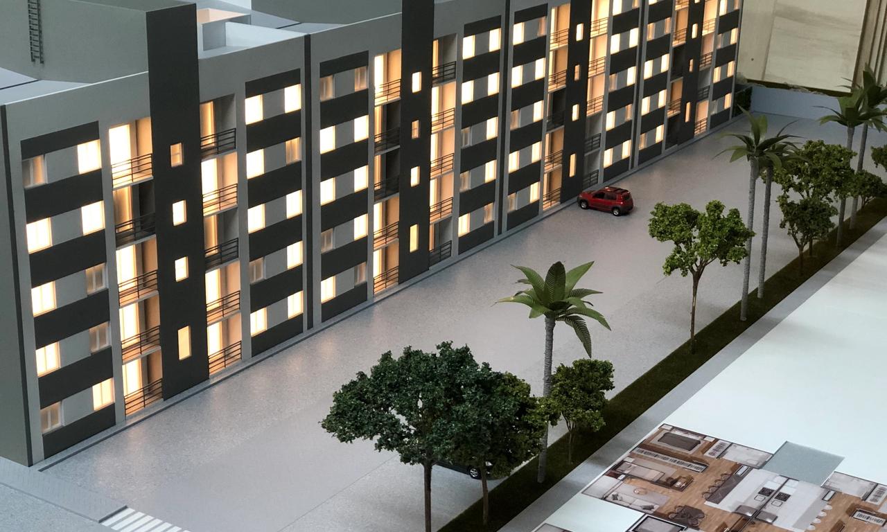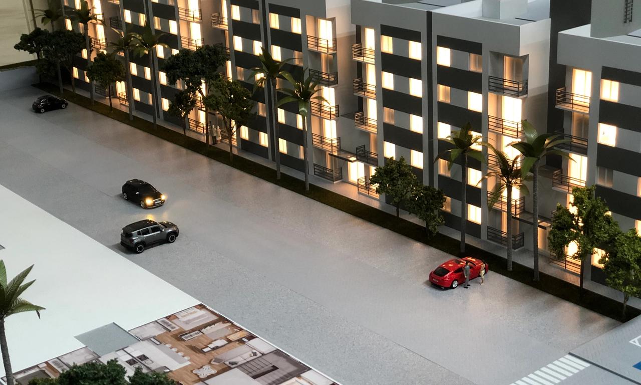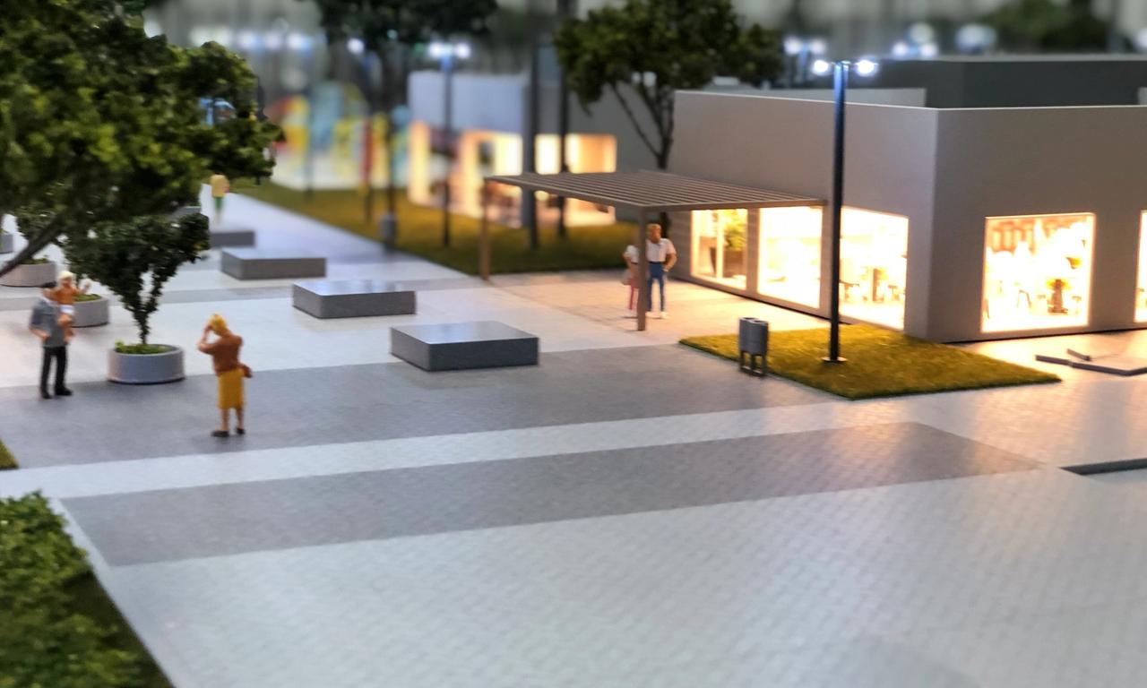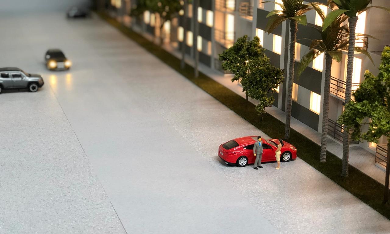 Esta maquete representa parte da área das torres, mas seu foco maior é para a área de lazer. Buscamos representar de forma a destacar muito bem os ambientes, tanto internos como externos, através do paisagismo, mobiliários e neste caso específico, a iluminação ficou sensacional.