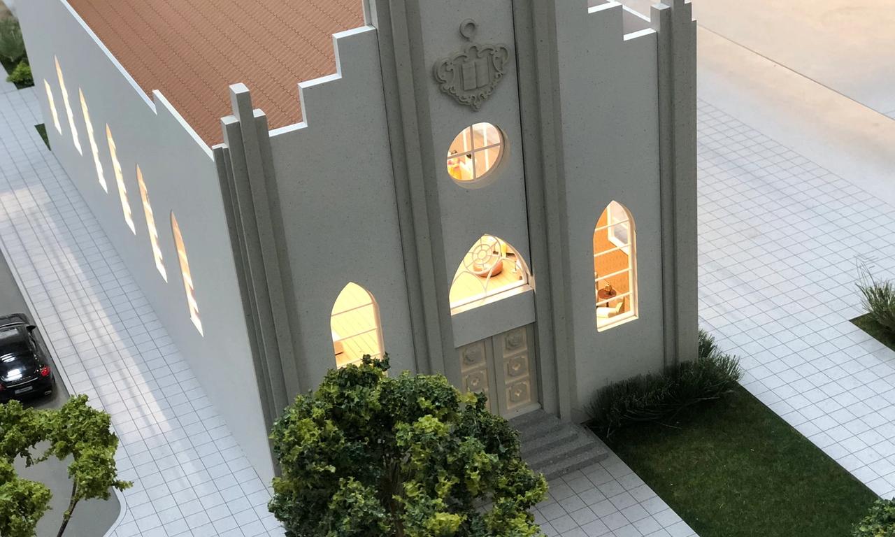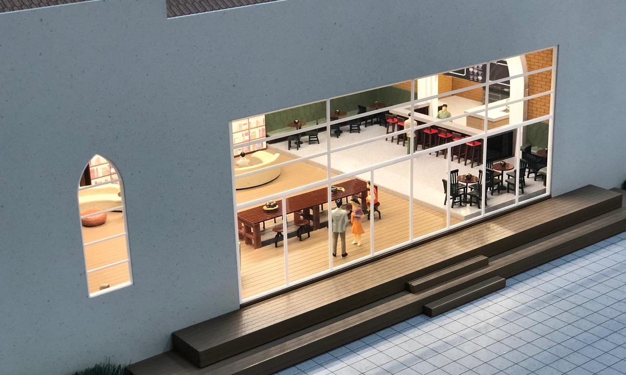 Foi um desafio reproduzir com alto grau de detalhamento as edificações históricas que serão mantidas no projeto. A capela recebeu uma atenção especial e nela representamos seu interior que passou a abrigar um café com espaço para exposição.