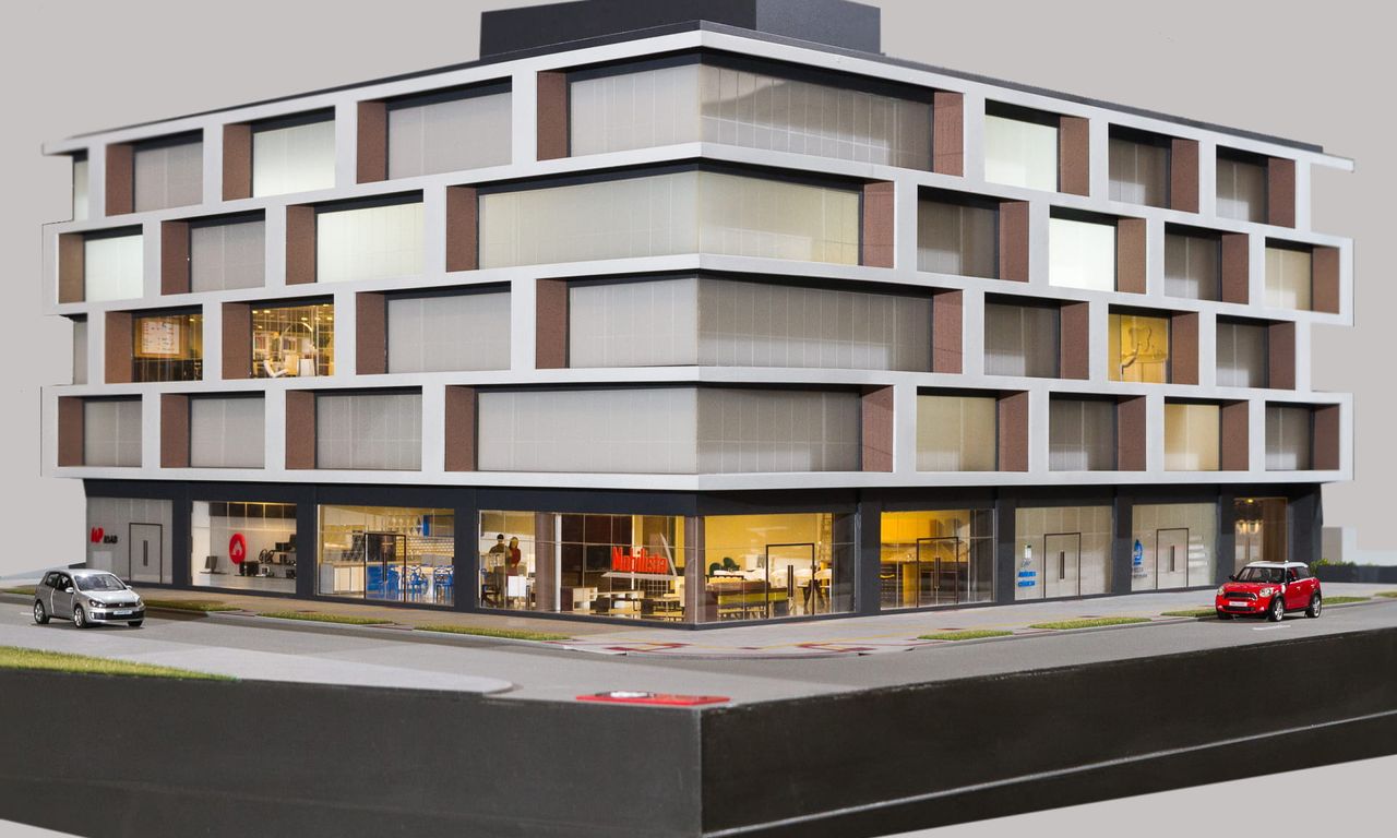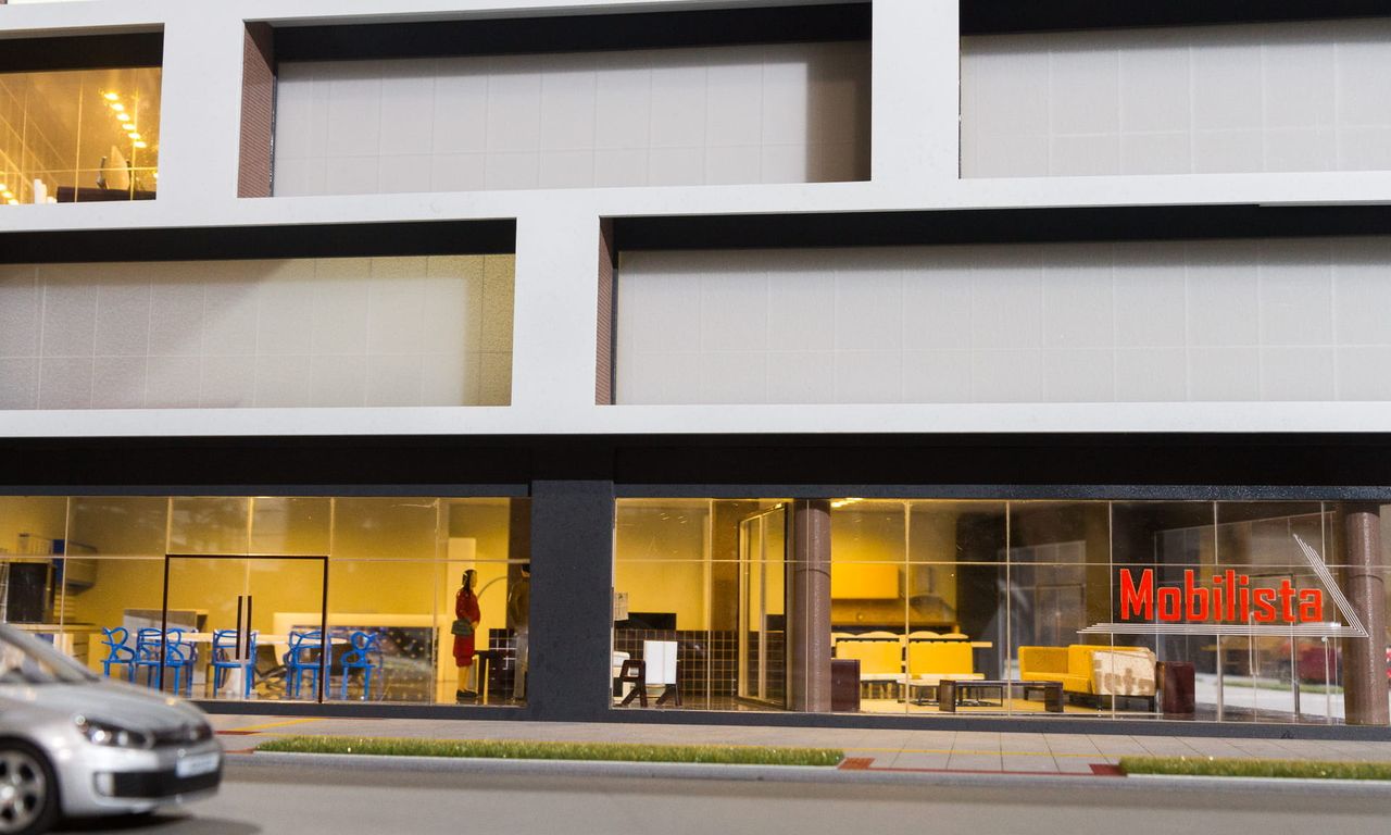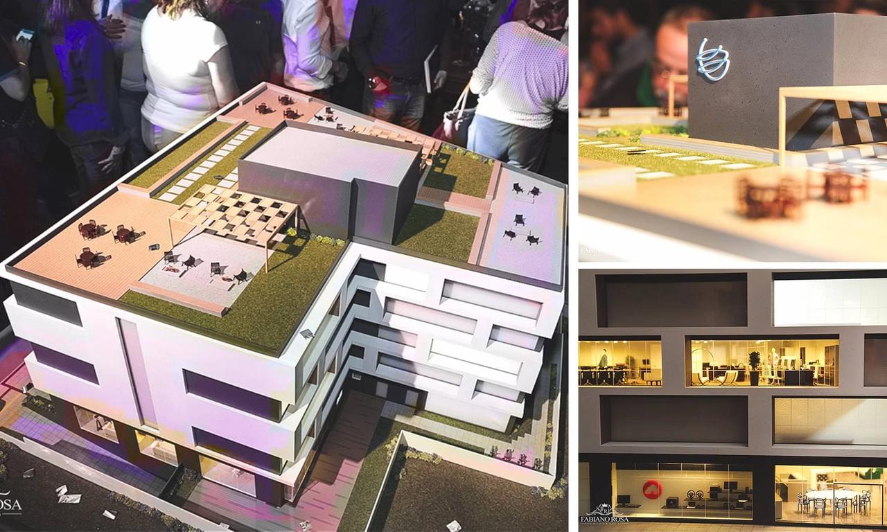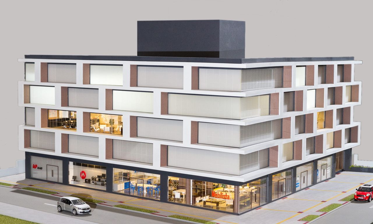 Esta maquete tem um conceito de arquitetura contemporânea monolítica, com uma plástica obtida através da composição entre cheios e vazios. Devido a sua escala generosa, proporcionou a inserção de escritórios bem detalhados no interior da torre, um hall de entrada com grande fidelidade e um painel iluminado que destaca o nome do conjunto.