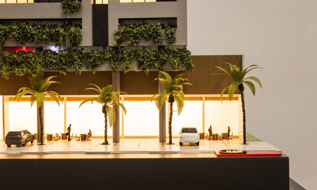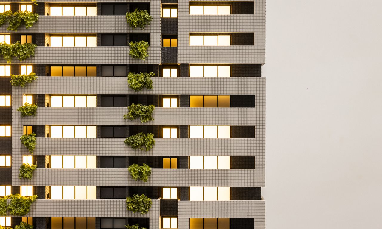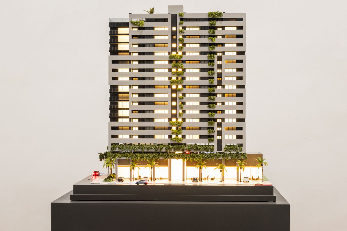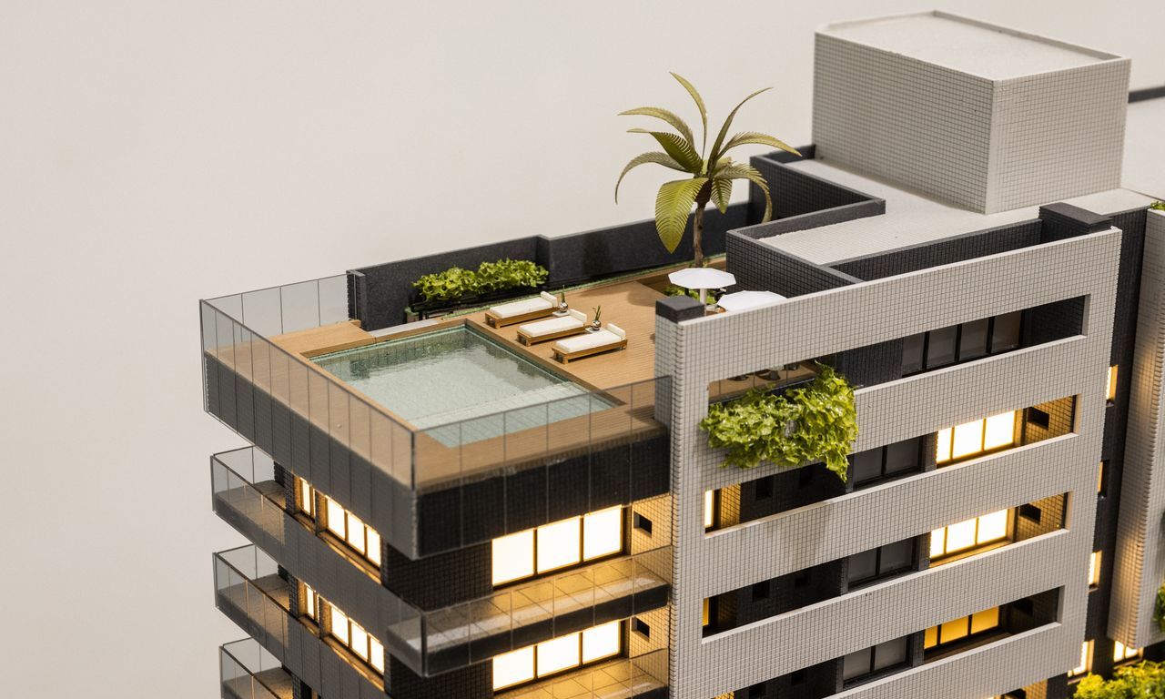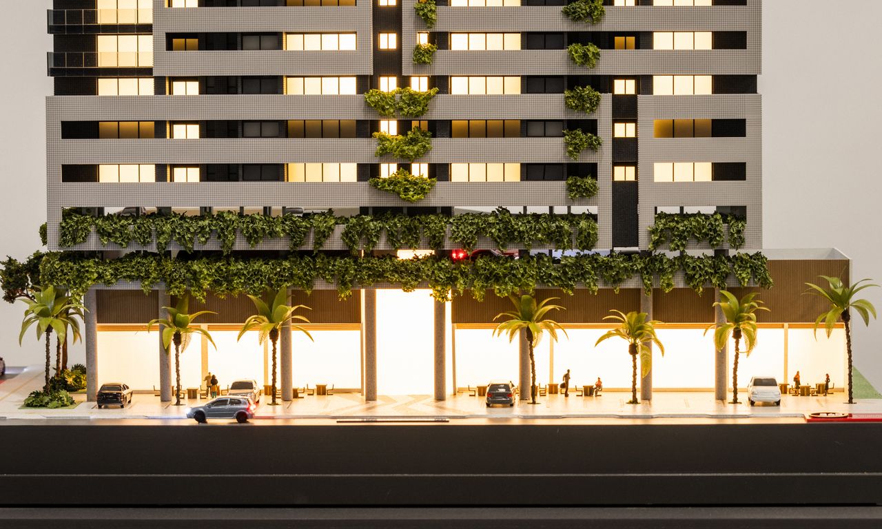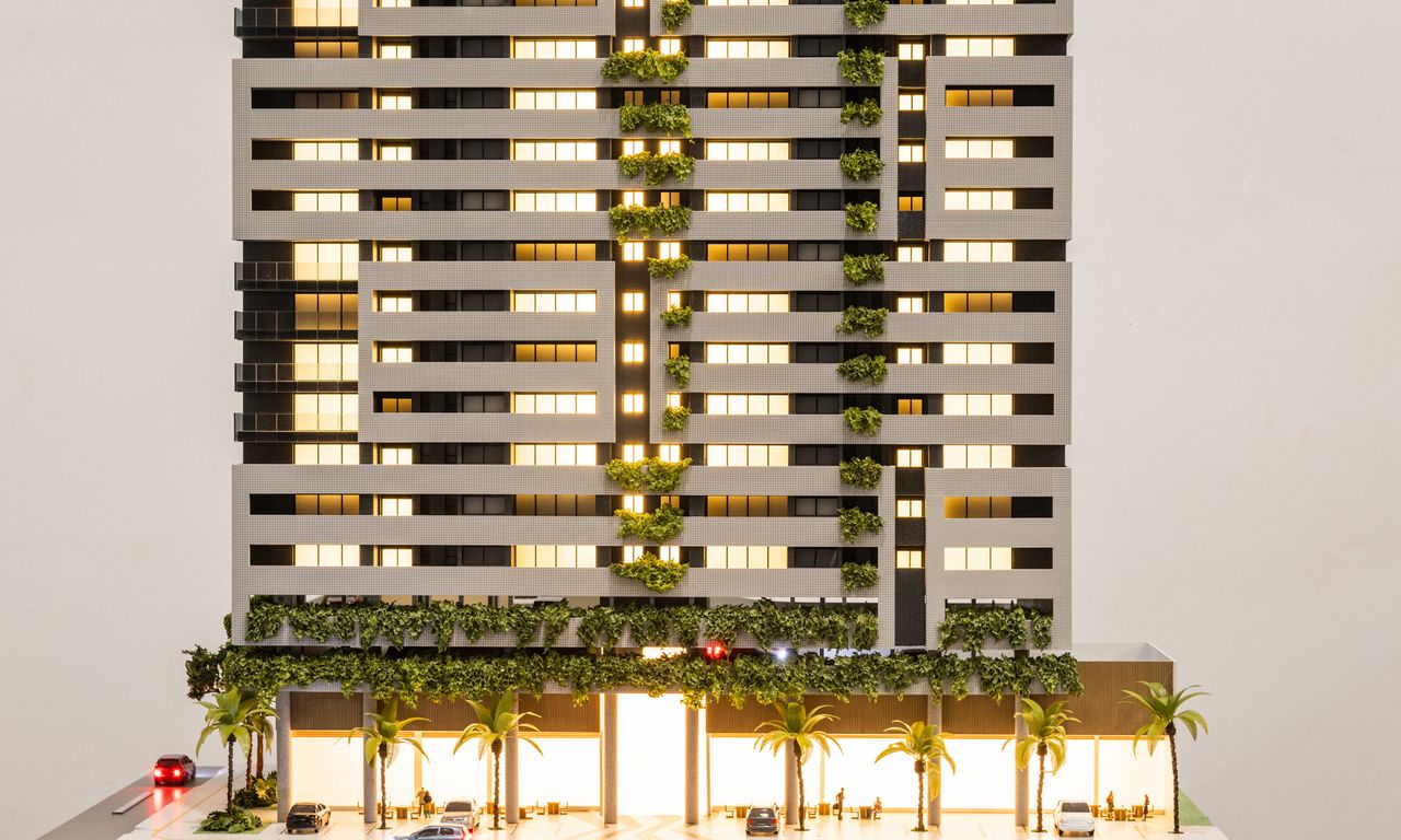 Apesar de não ter os ambientes internos mobiliados, o projeto se destaca pelos jogos de volumes de cheios e vazios, alternando entre sacadas e fachadas lisas, e pelo uso cuidadoso da vegetação que realça a estética da maquete. O rooftop, visível em sua totalidade, agrega valor ao conjunto, enquanto a presença de palmeiras na calçada reforça o caráter praiano do empreendimento.