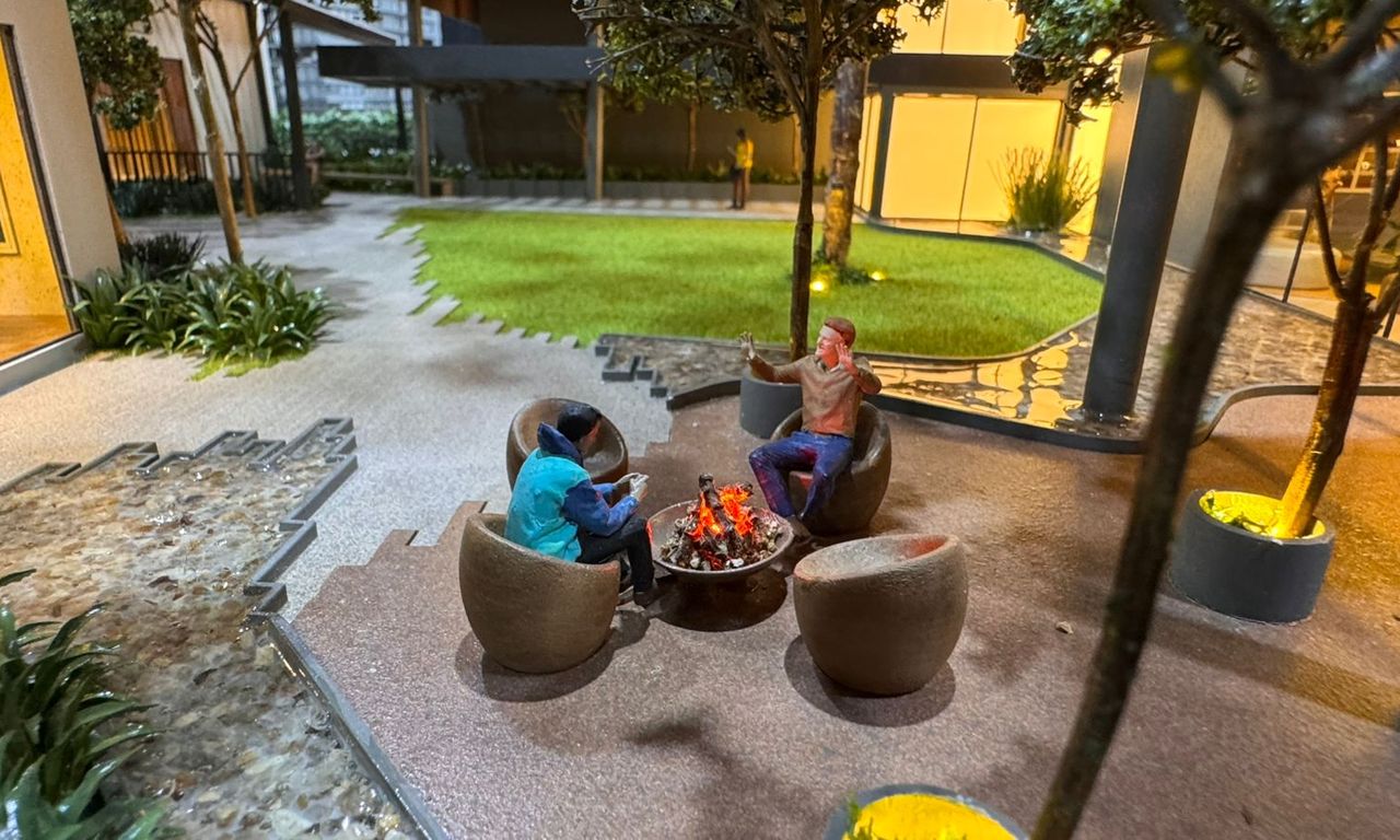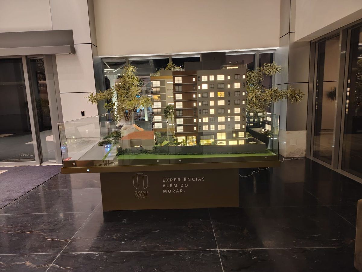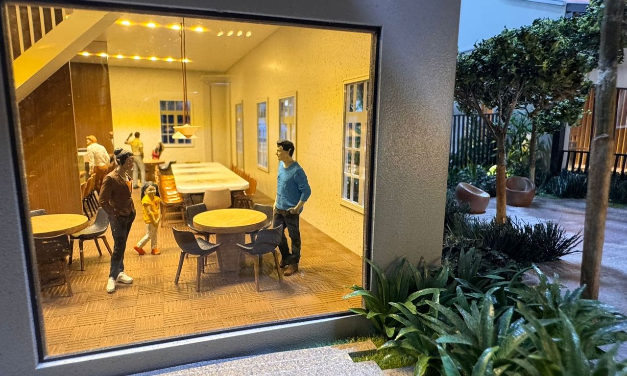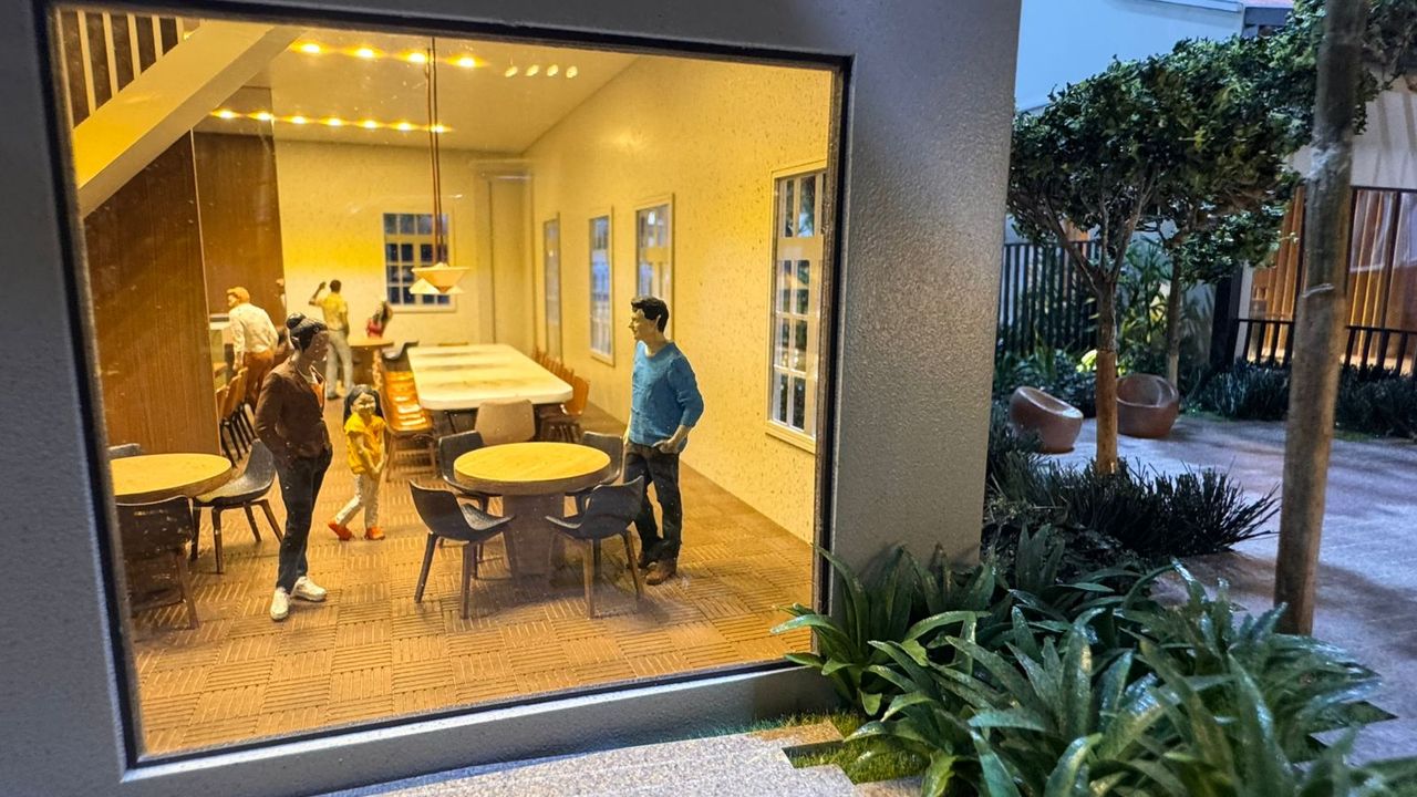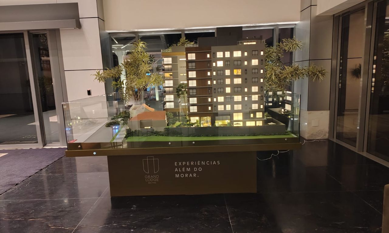 Nas áreas condominiais, a maquete se destaca pela ambientação humanizada, com destaque para um fireplace com tecnologia de simulação de fogo real, além da vegetação cuidadosamente representada — incluindo uma araucária preservada, símbolo da região.