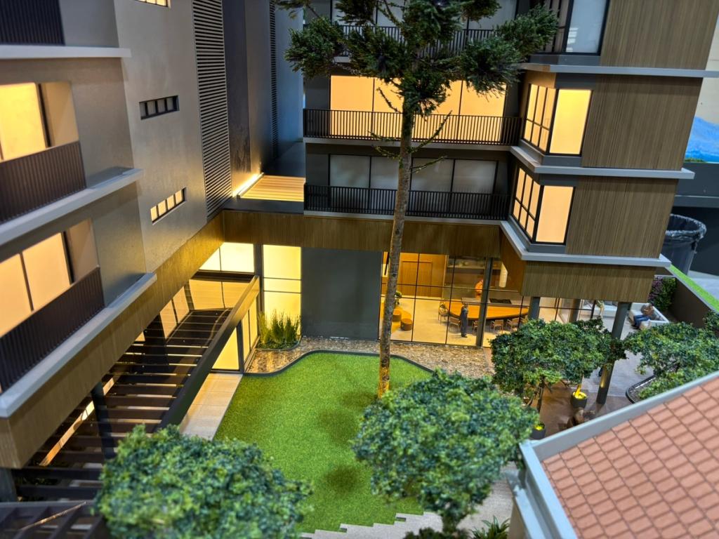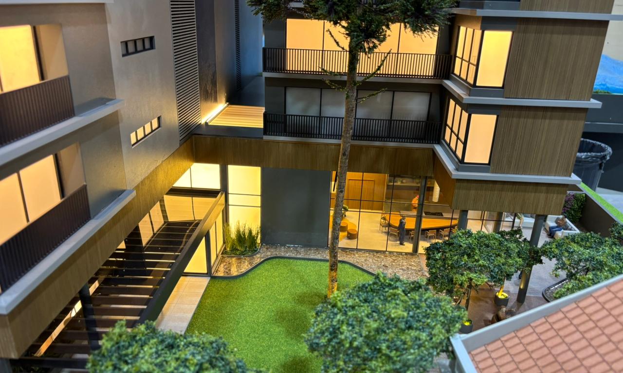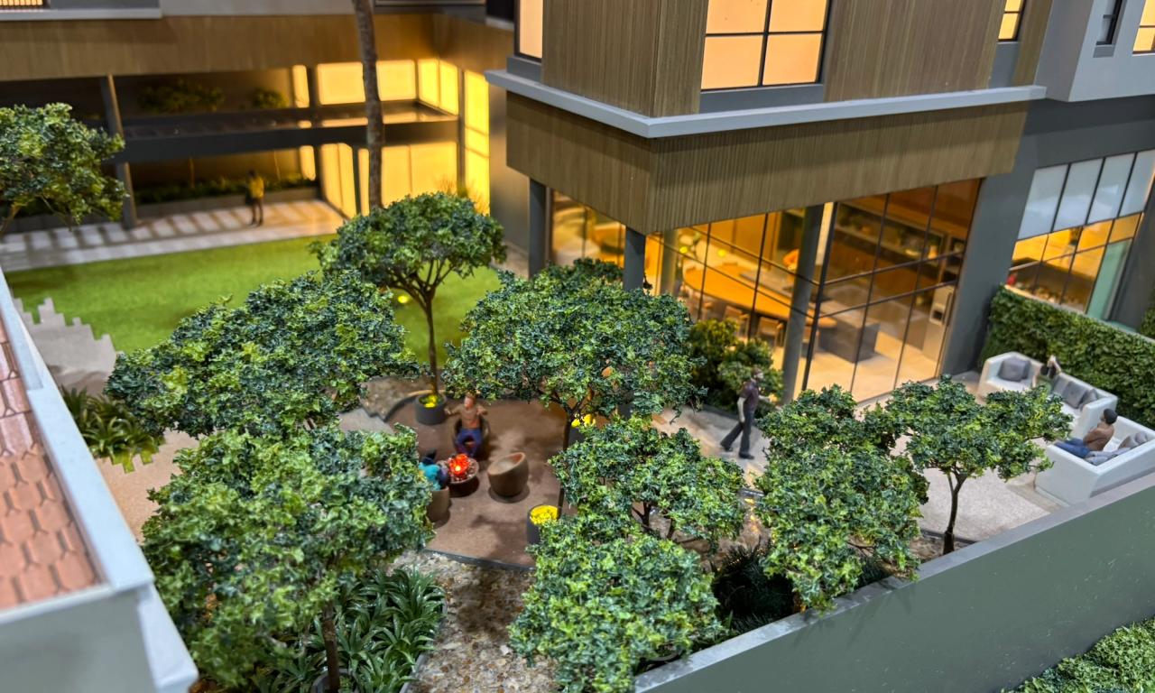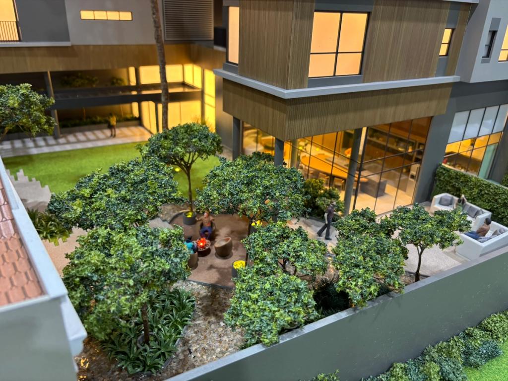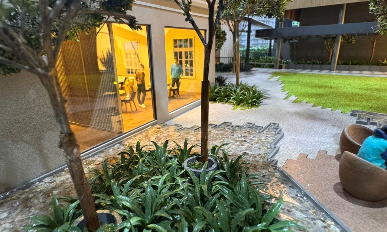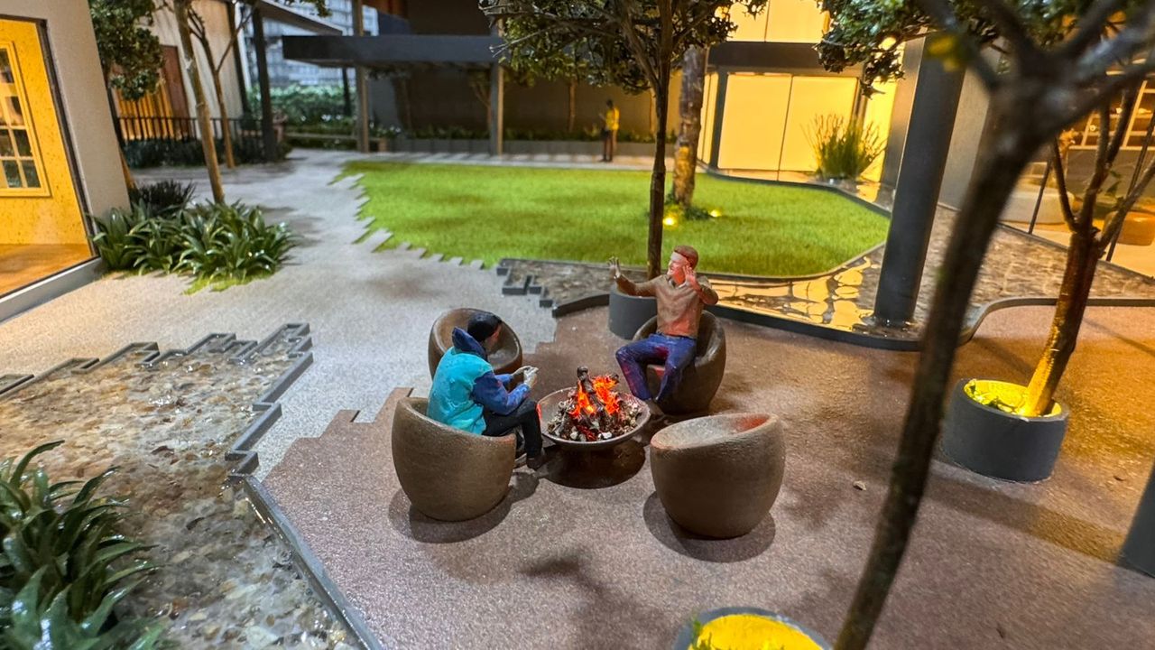 Nas áreas condominiais, a maquete se destaca pela ambientação humanizada, com destaque para um fireplace com tecnologia de simulação de fogo real, além da vegetação cuidadosamente representada — incluindo uma araucária preservada, símbolo da região.