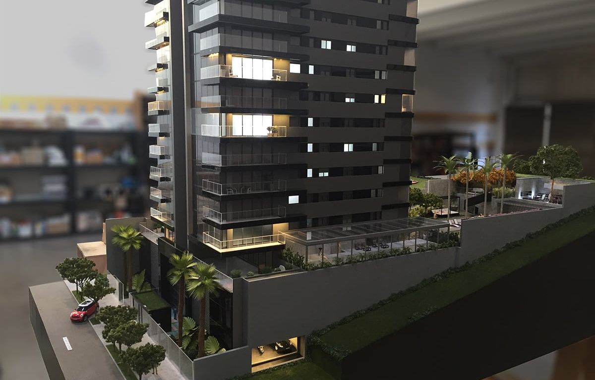 Seguindo o conceito dessa torre, os detalhes e acabamentos foram o ponto de atenção nesse projeto. As fachadas compostas de granitos, ACM, pastilhas e pintura, exigiram um processo diferenciado de montagem, pinturas e aplicações dos acabamentos. A maquete acompanha o nível do empreendimento que é de alto padrão.