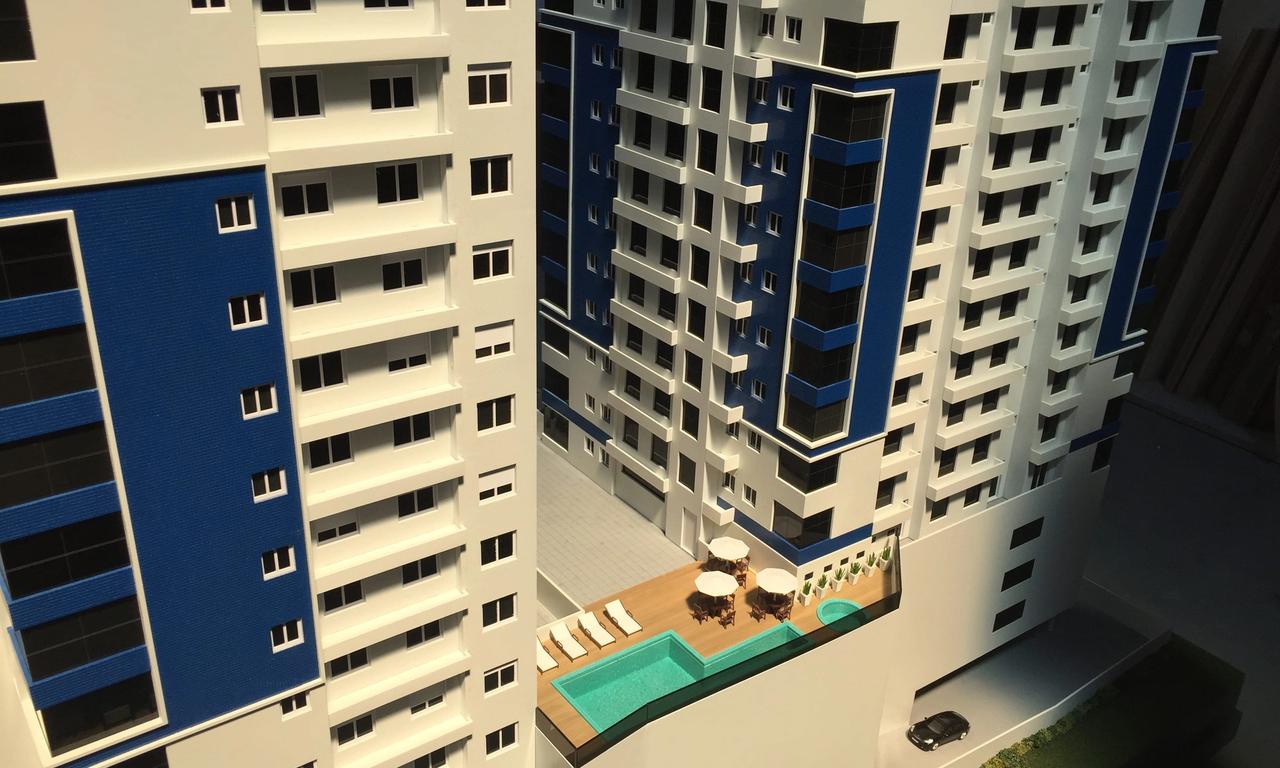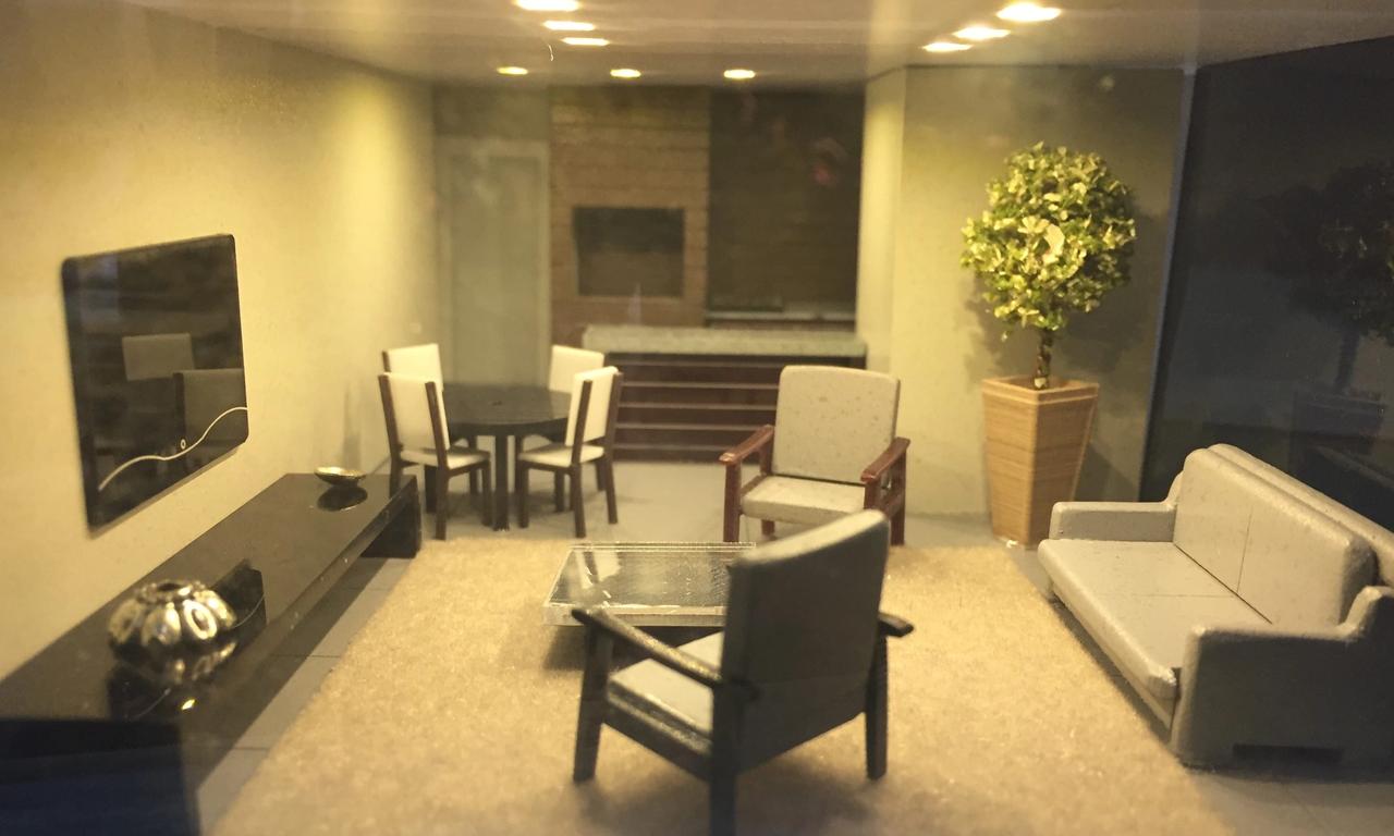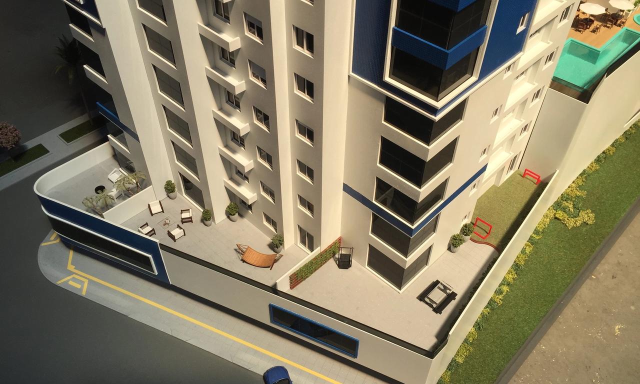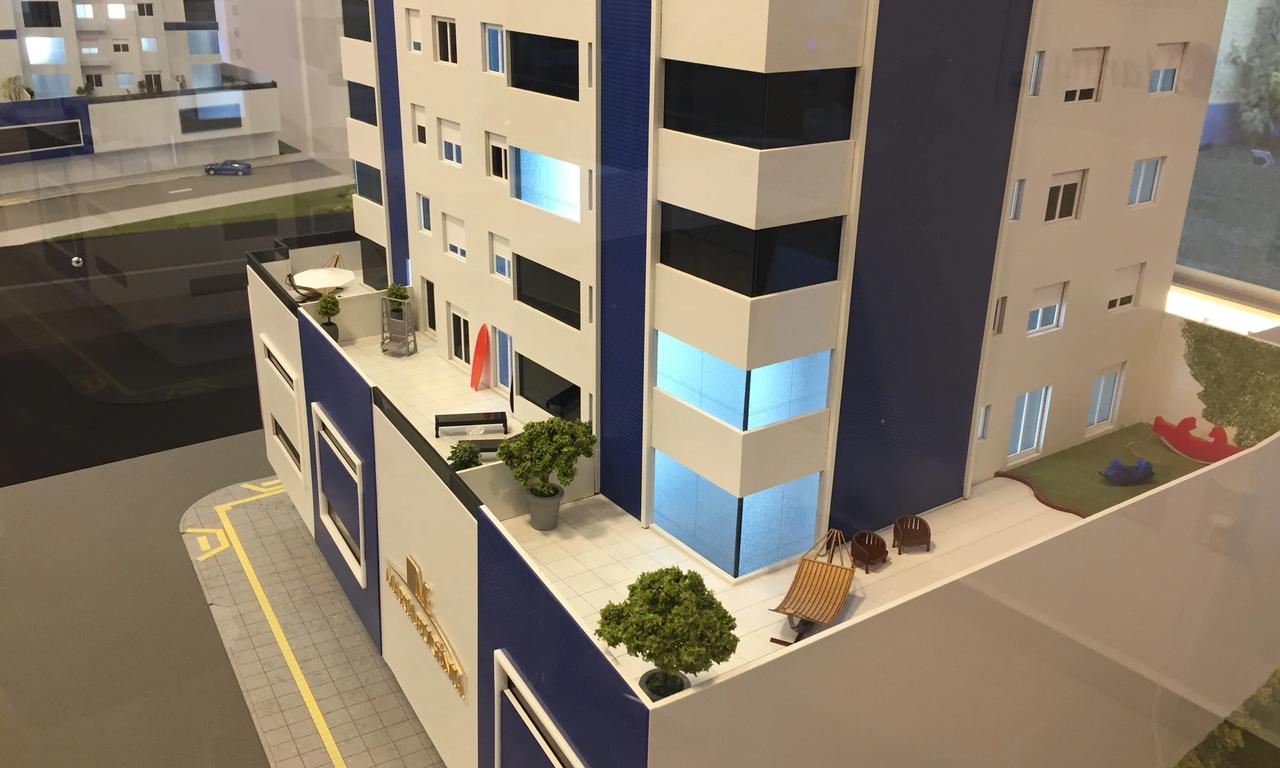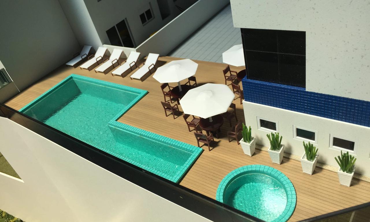 Nas maquetes, vocês podem ver que algumas partes condominiais e privativas estão mobiliadas, decoradas e iluminadas, além de produzirmos alguns apartamentos no interior das torres demonstrando os layouts. No revestimento azul foram utilizadas pastilhas para reproduzir fielmente o acabamento dos empreendimentos.