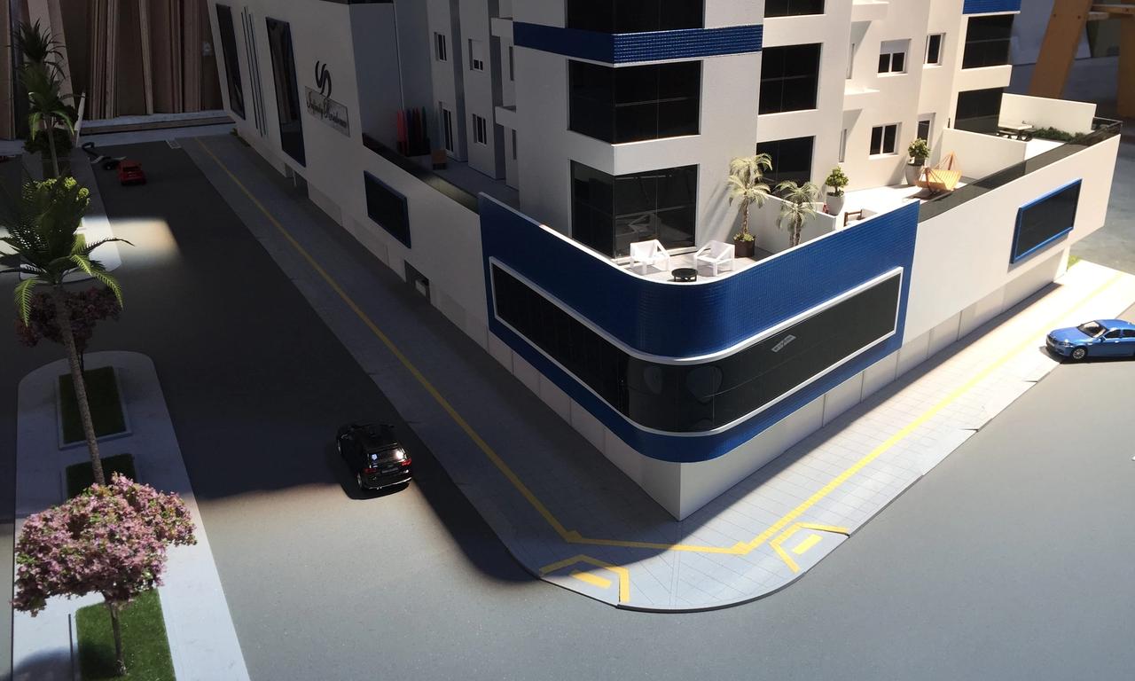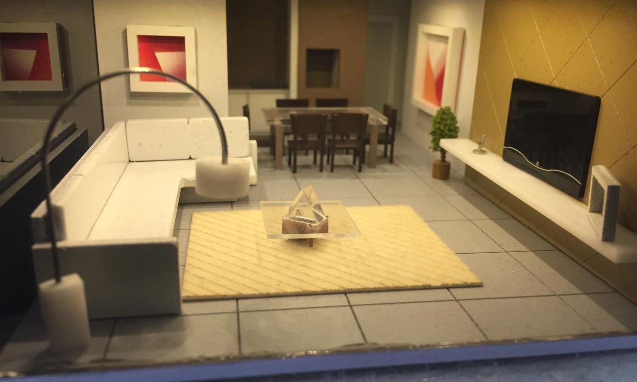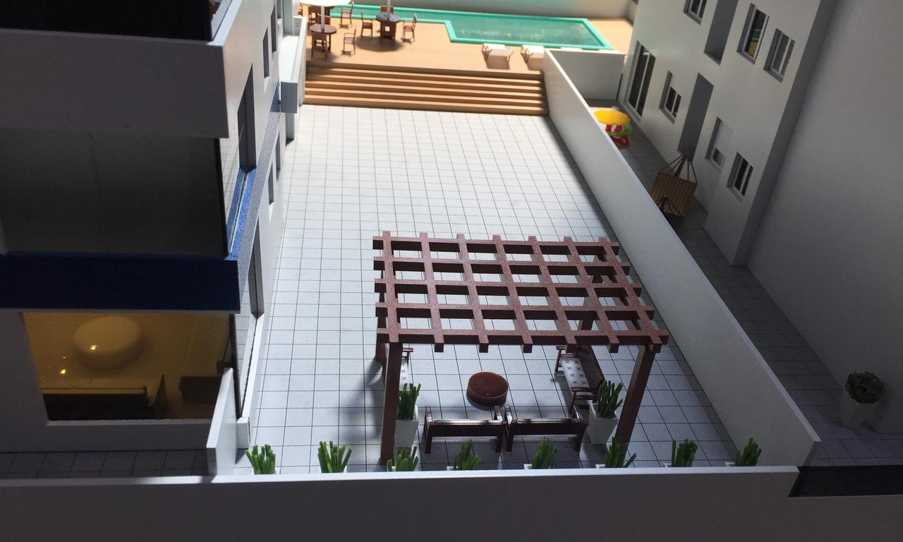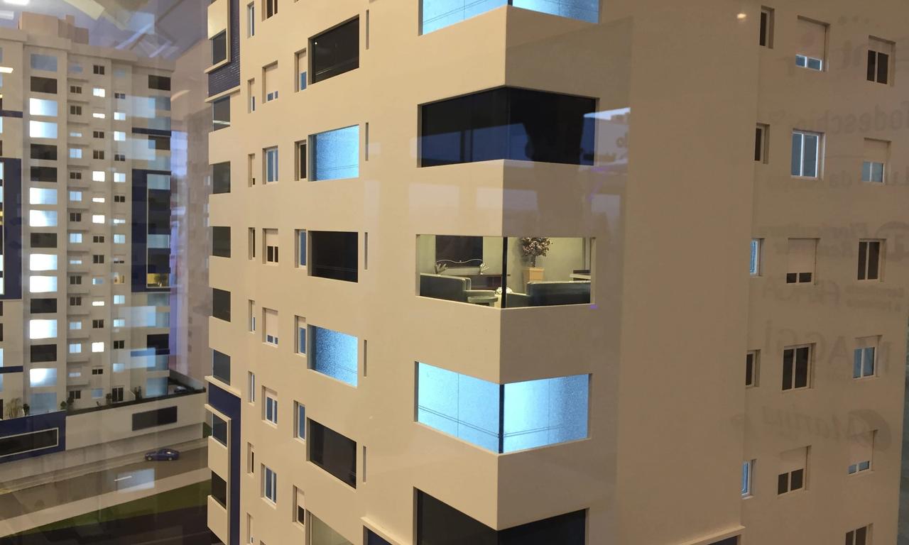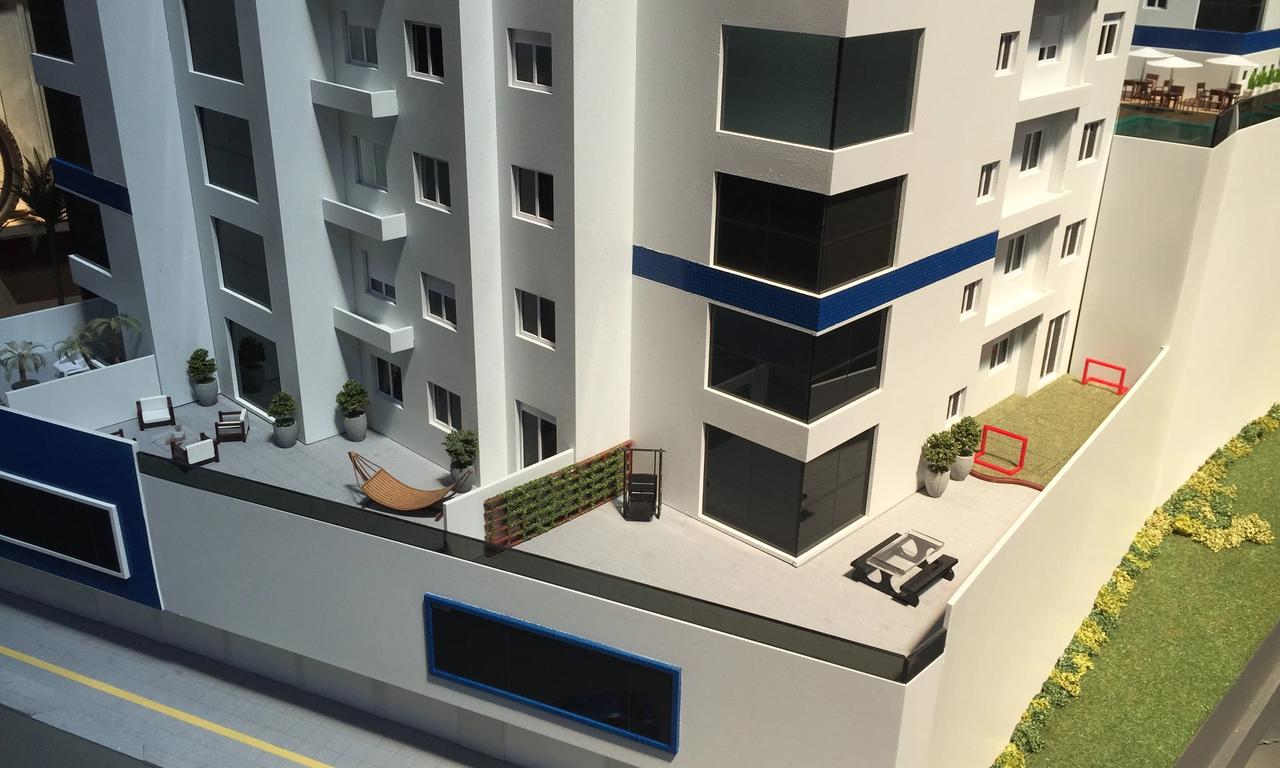 Nas maquetes, vocês podem ver que algumas partes condominiais e privativas estão mobiliadas, decoradas e iluminadas, além de produzirmos alguns apartamentos no interior das torres demonstrando os layouts. No revestimento azul foram utilizadas pastilhas para reproduzir fielmente o acabamento dos empreendimentos.