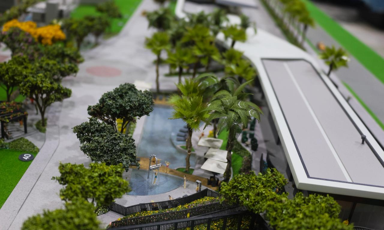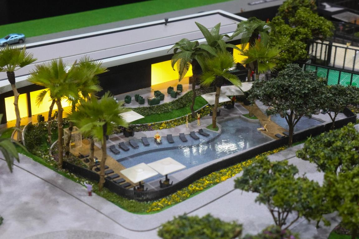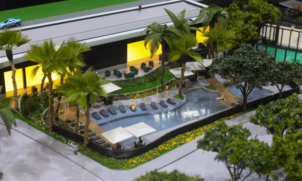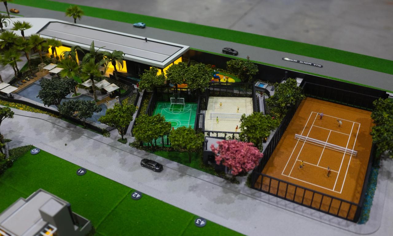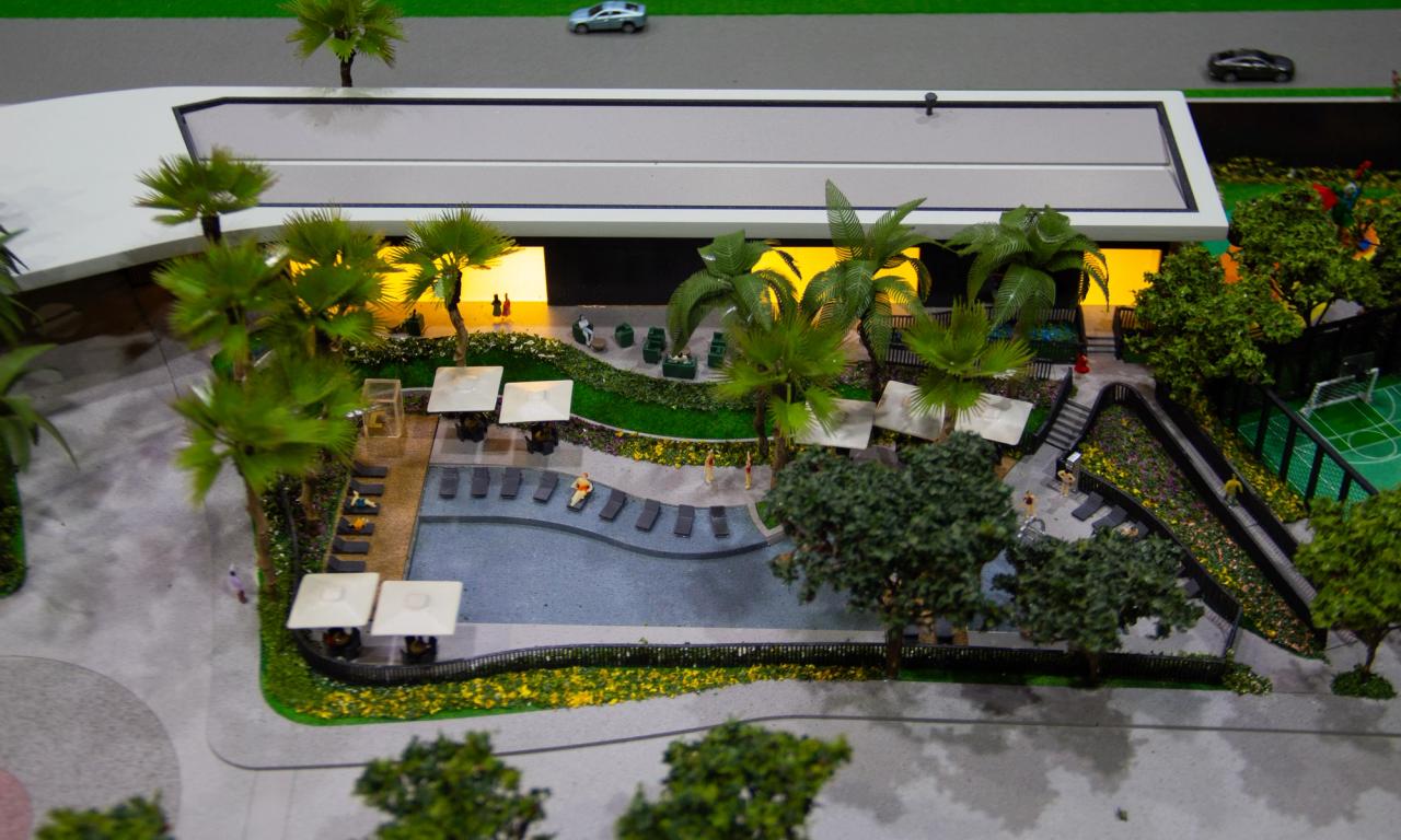 A piscina, que também acompanha essa forma orgânica, é um dos pontos de maior riqueza visual e humanização na maquete. Outro diferencial está na pintura das vias, que inclui faixas e caminhos exclusivos para pedestres, representados com cores e vegetação que dão ritmo e realismo à composição.
