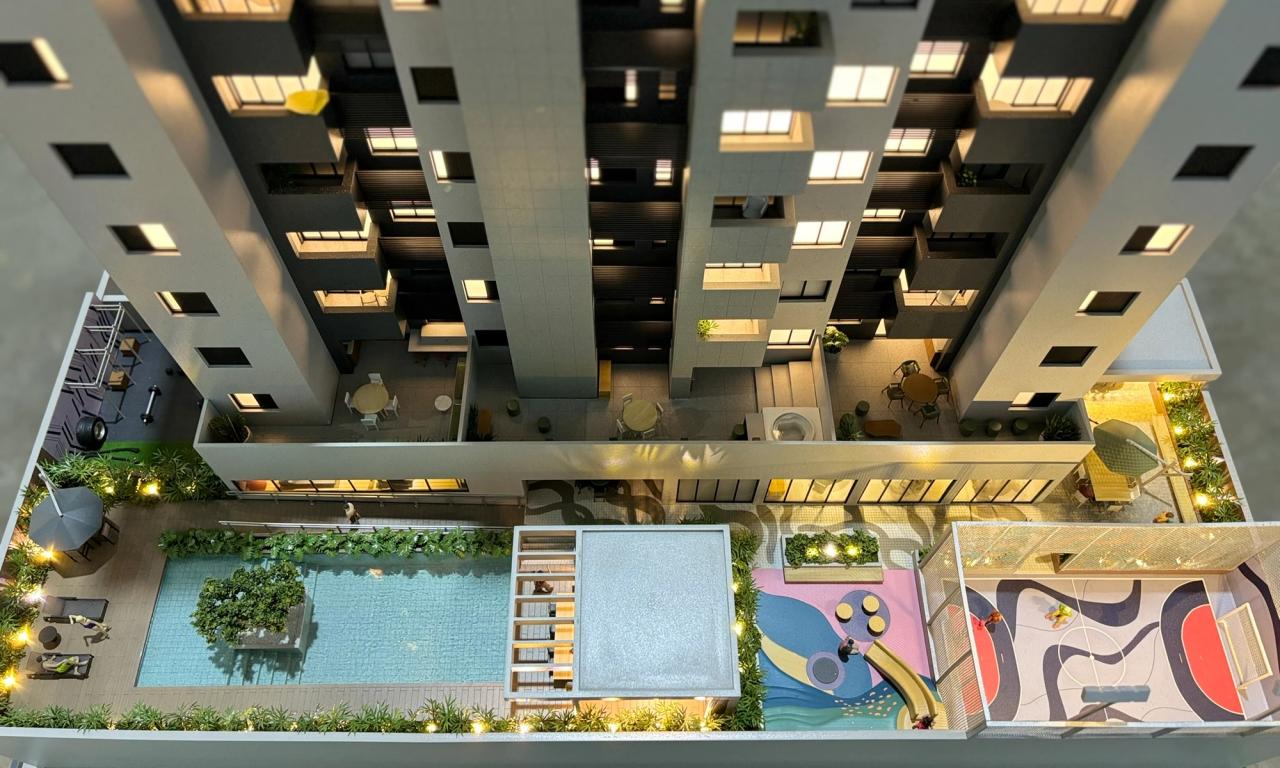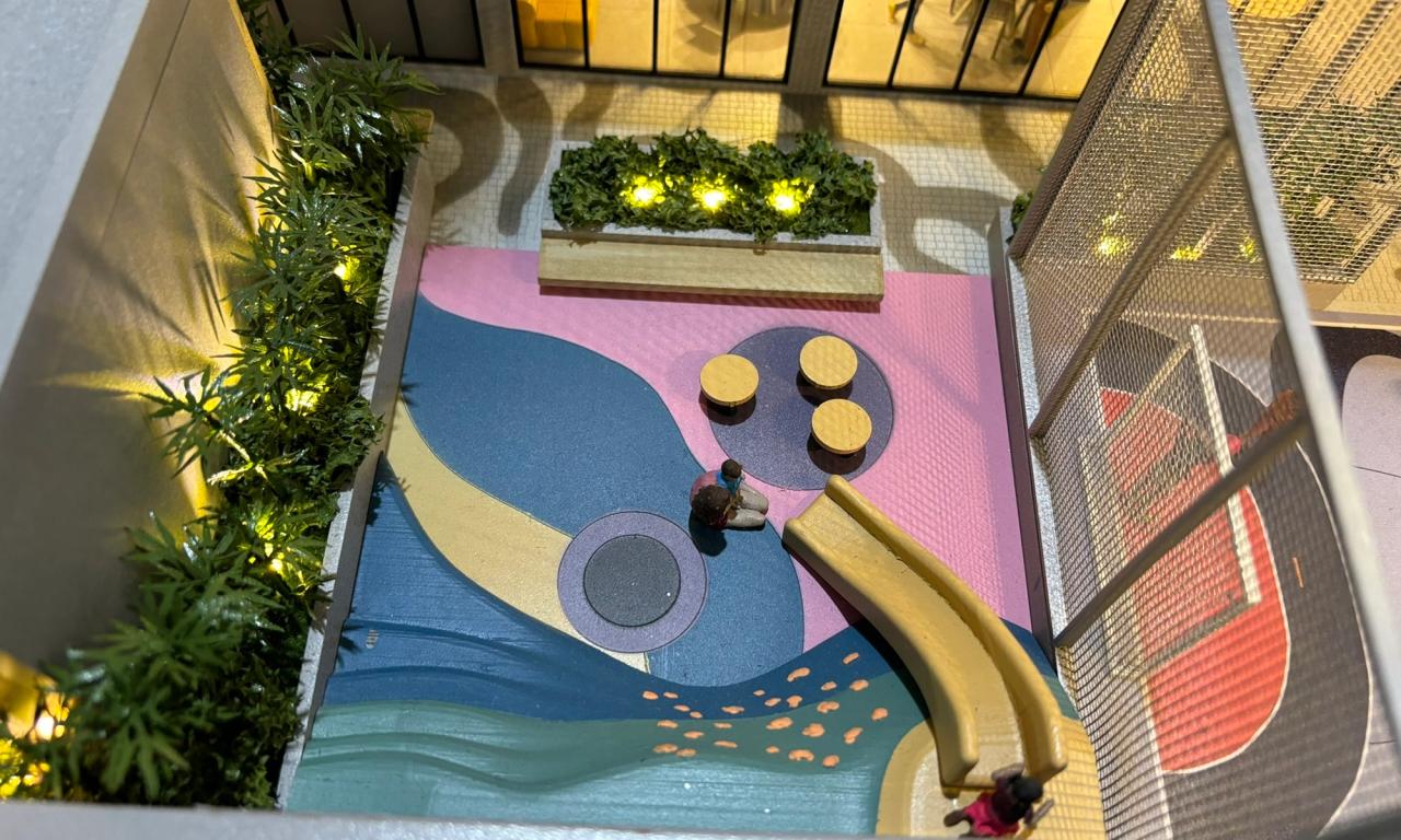 O projeto também conta com áreas condominiais vibrantes, que incluem piscinas, playgrounds e quadras, todas com formas orgânicas e cores vivas, criando um ambiente agradável e convidativo. Além disso, os gardens espalhados pela maquete trazem ainda mais vida e beleza ao conjunto.
