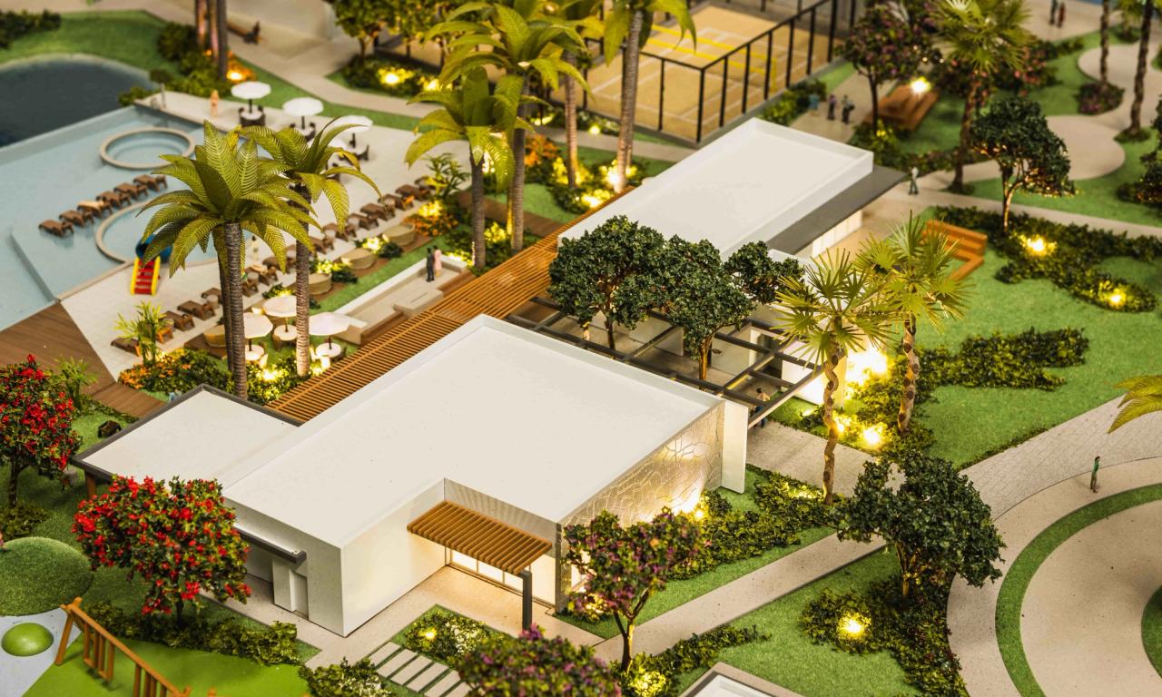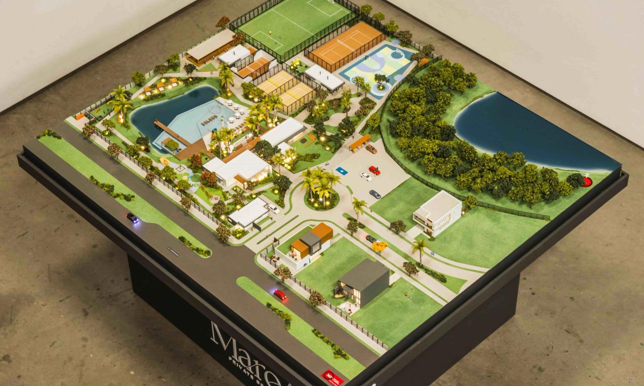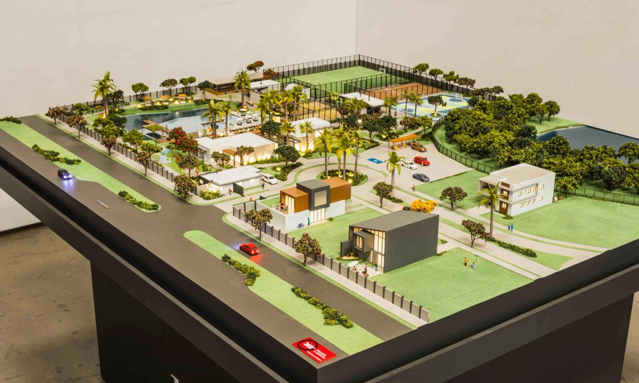Neste projeto o cliente optou por uma escala intermediária que permitiu representar com muito mais detalhes toda a área de lazer e do clube do empreendimento, assim como algumas casas, a vegetação e até mesmo alguns detalhes de decoração. O resultado final foi uma maquete muito rica em detalhes, que transmite com fidelidade a vida e o movimento que serão encontrados no empreendimento.