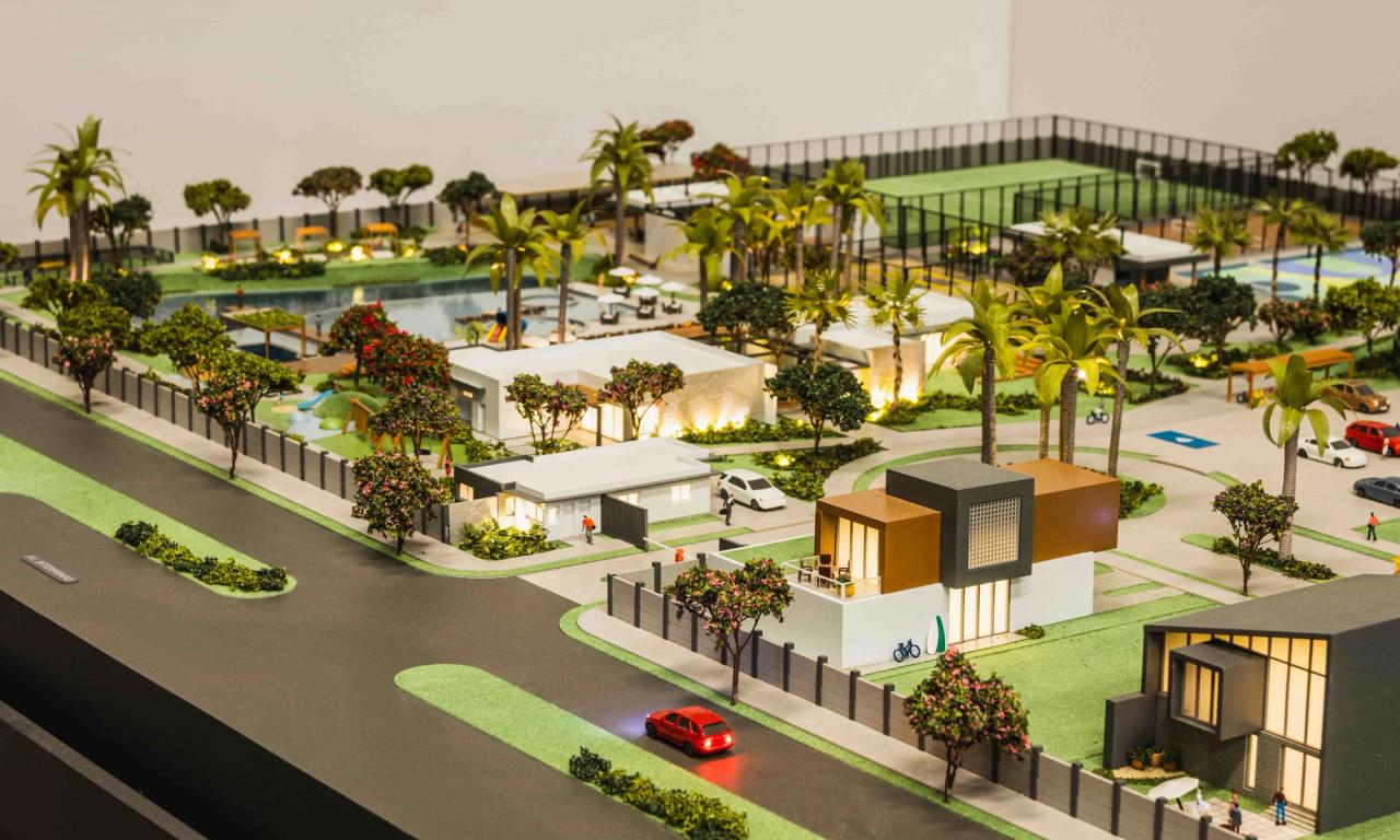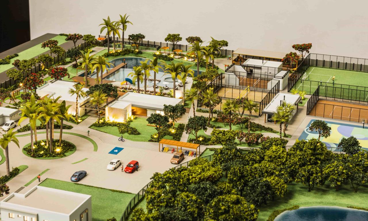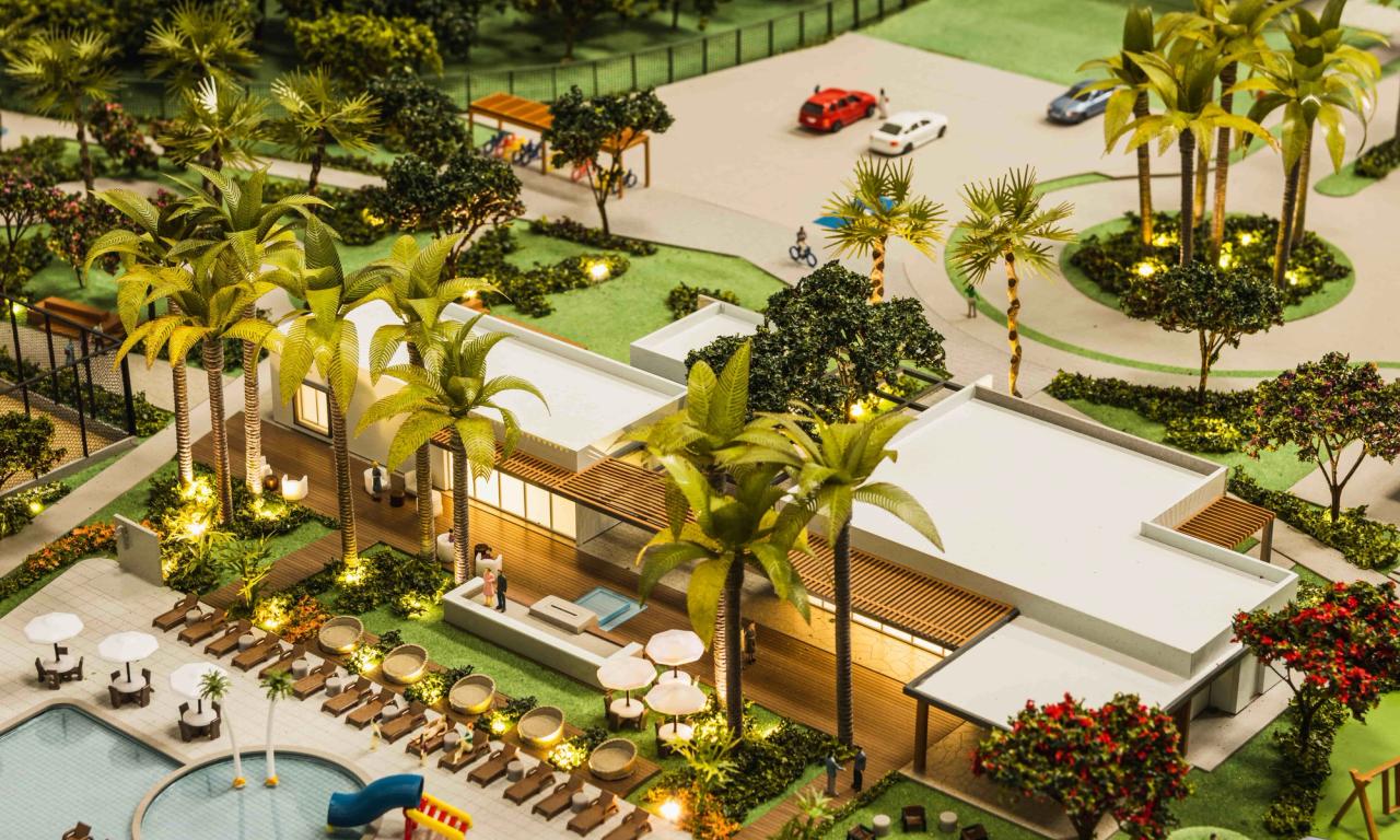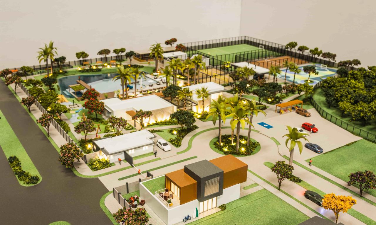 Neste projeto o cliente optou por uma escala intermediária que permitiu representar com muito mais detalhes toda a área de lazer e do clube do empreendimento, assim como algumas casas, a vegetação e até mesmo alguns detalhes de decoração. O resultado final foi uma maquete muito rica em detalhes, que transmite com fidelidade a vida e o movimento que serão encontrados no empreendimento.