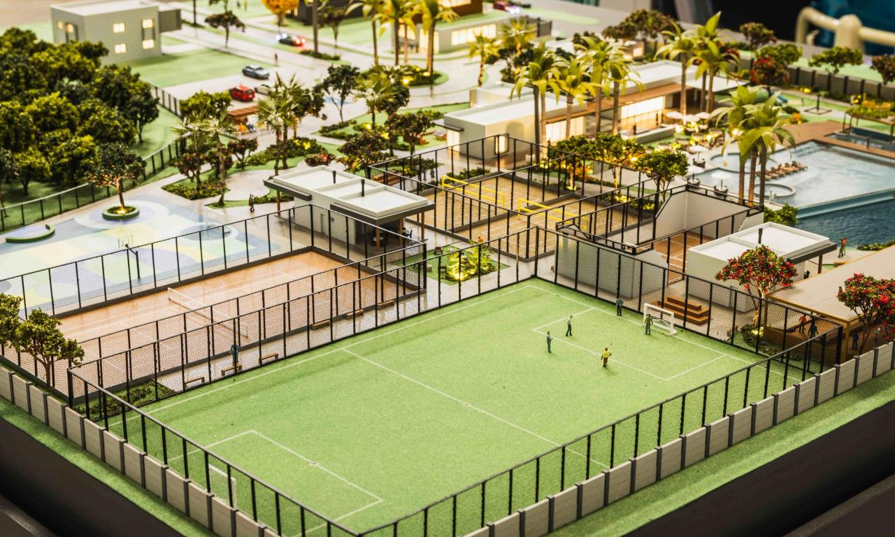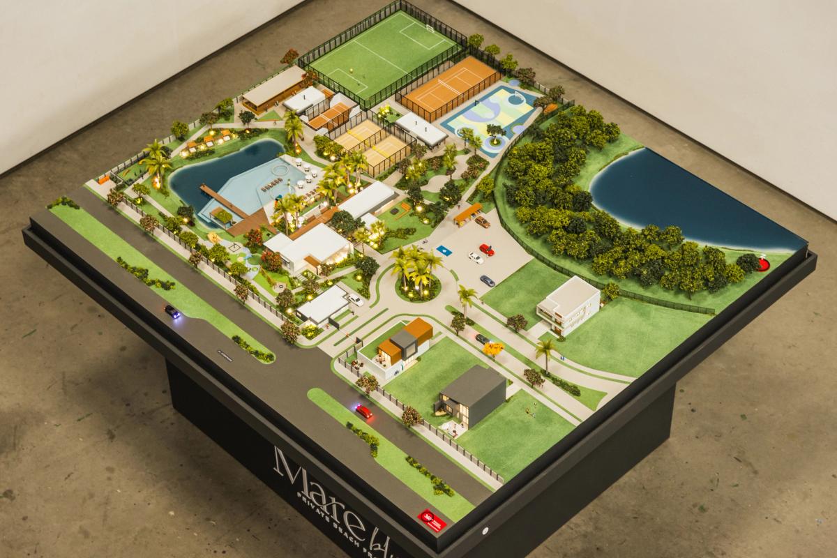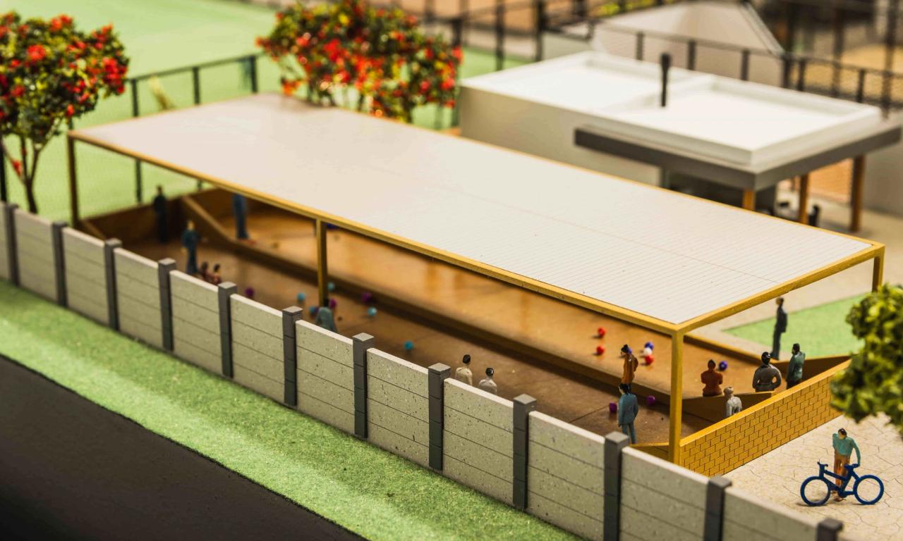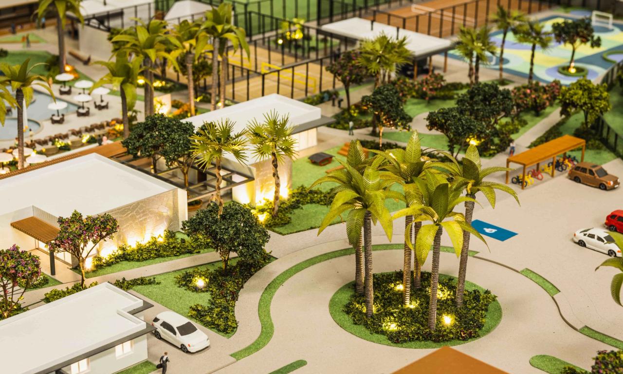 Nós nos atentamos a cada cantinho do projeto para recriar cenas do dia a dia. É possível ver pessoas jogando na quadra de bocha, algumas bicicletas encostadas nos muros das casas, pranchas de surf e muito mais. O objetivo é dar vida à maquete e fazer com que as pessoas se encantem com ela e se identifiquem com o projeto.