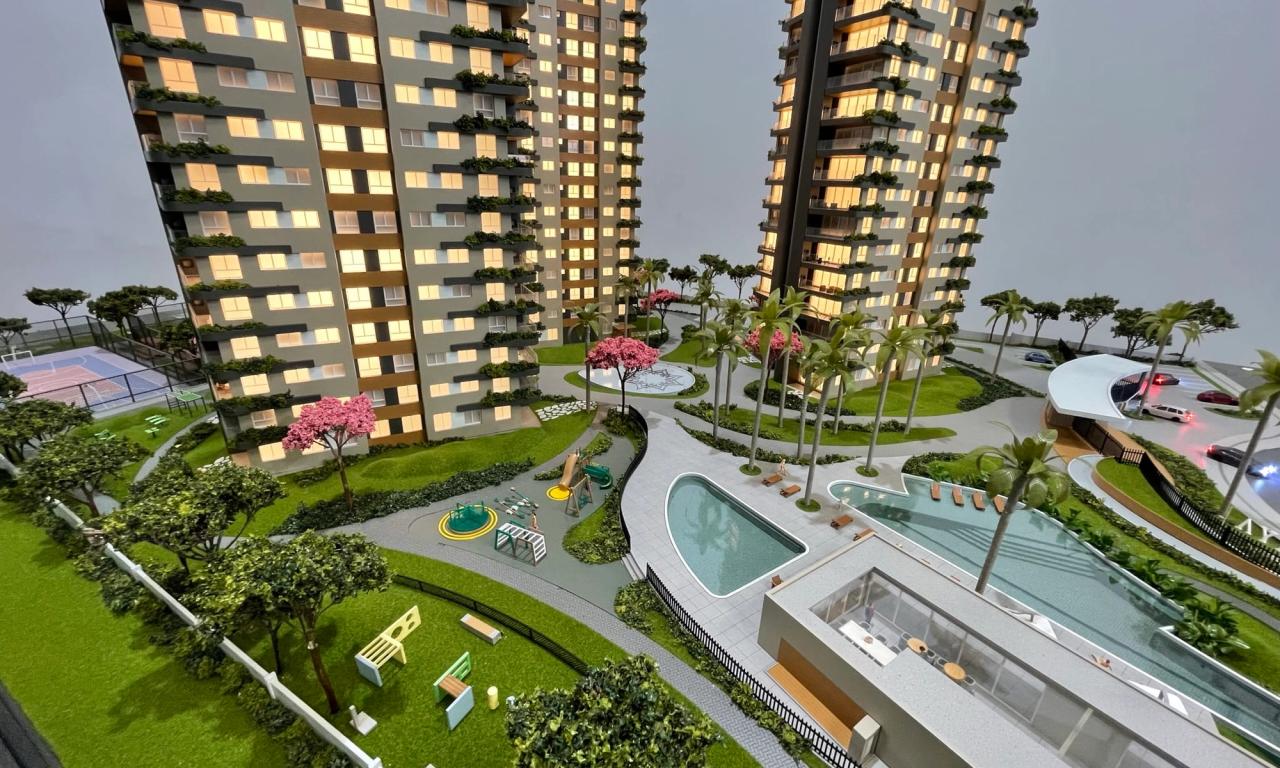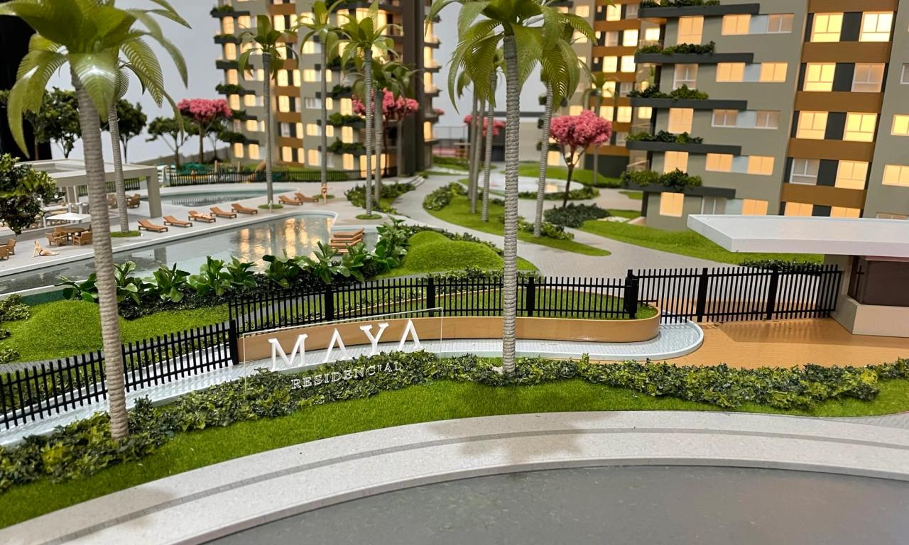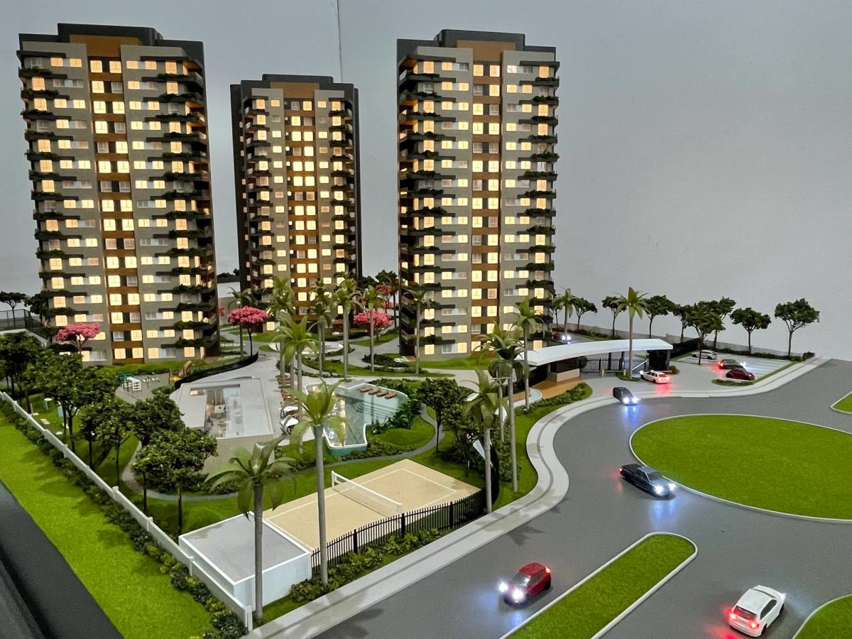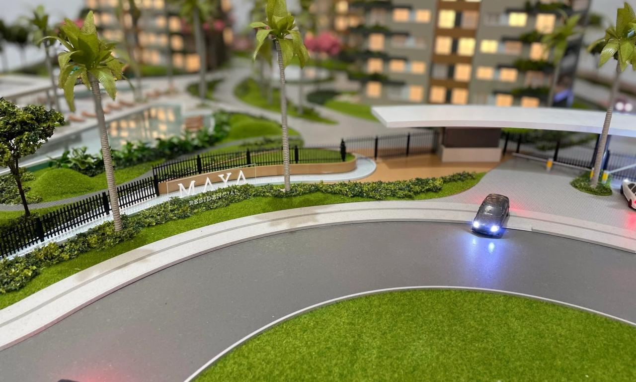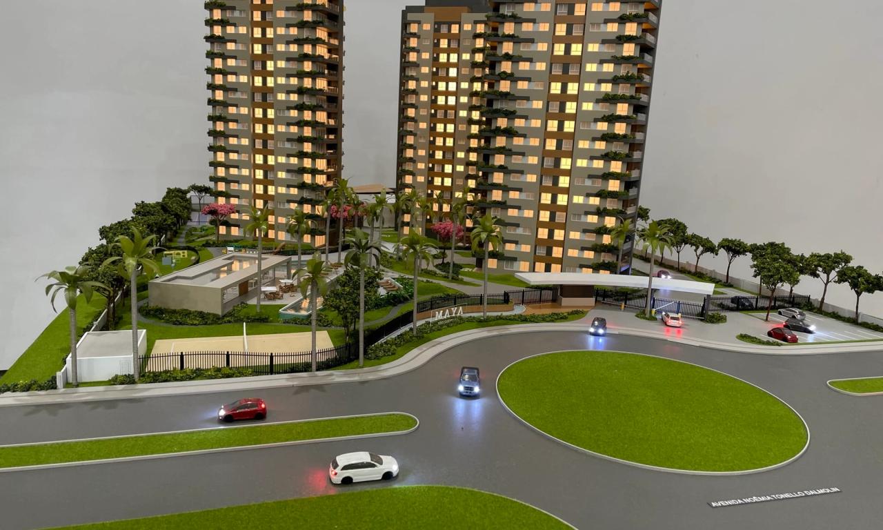 O Maya conta com 3 torres que encantam pelo cuidado na implantação. Mesmo em uma escala reduzida de 1/75, a maquete traz um rico visual que ressalta a qualidade dos equipamentos, mobiliários e paisagismo presentes no projeto.