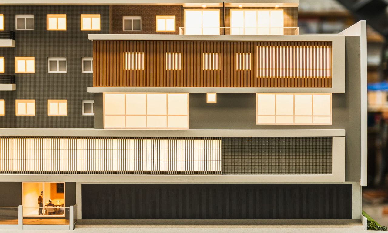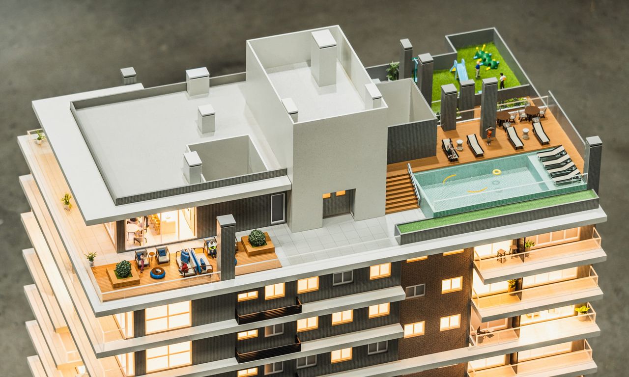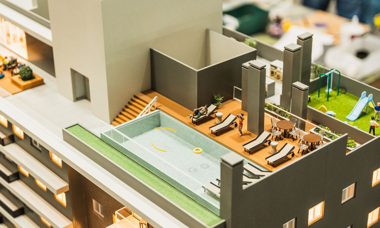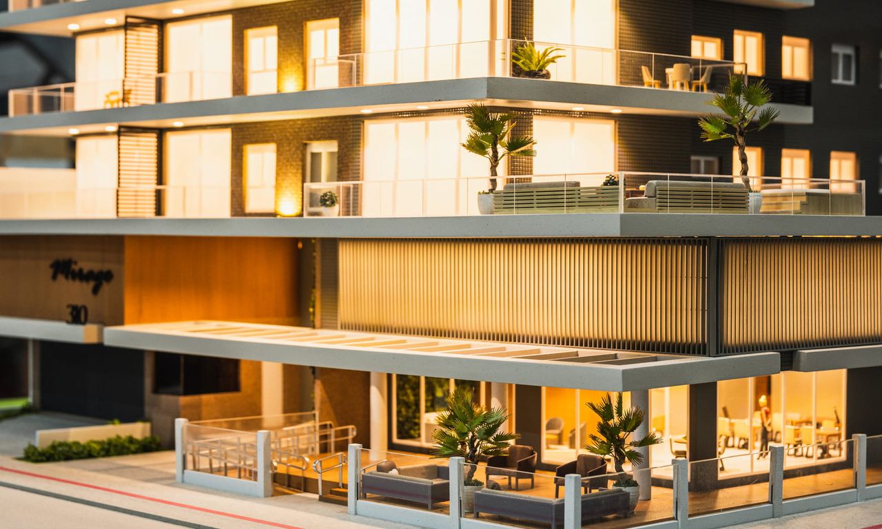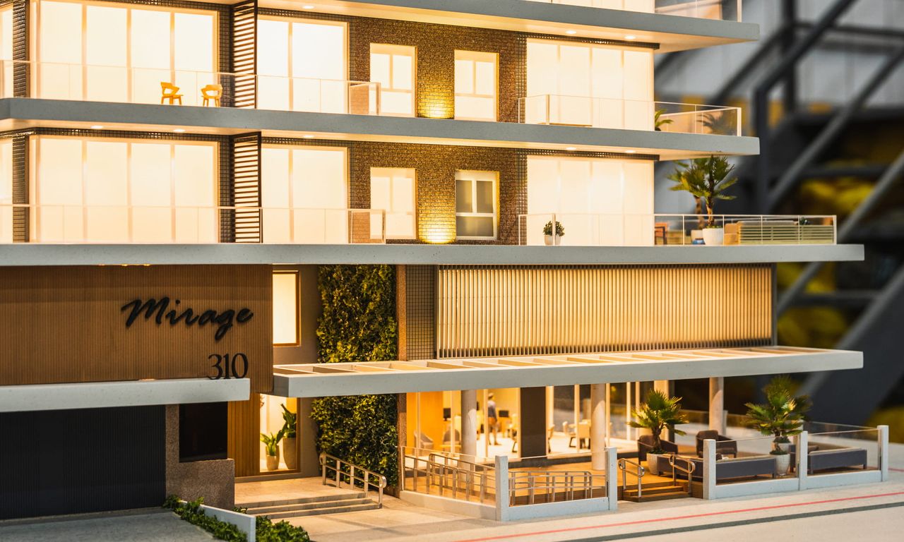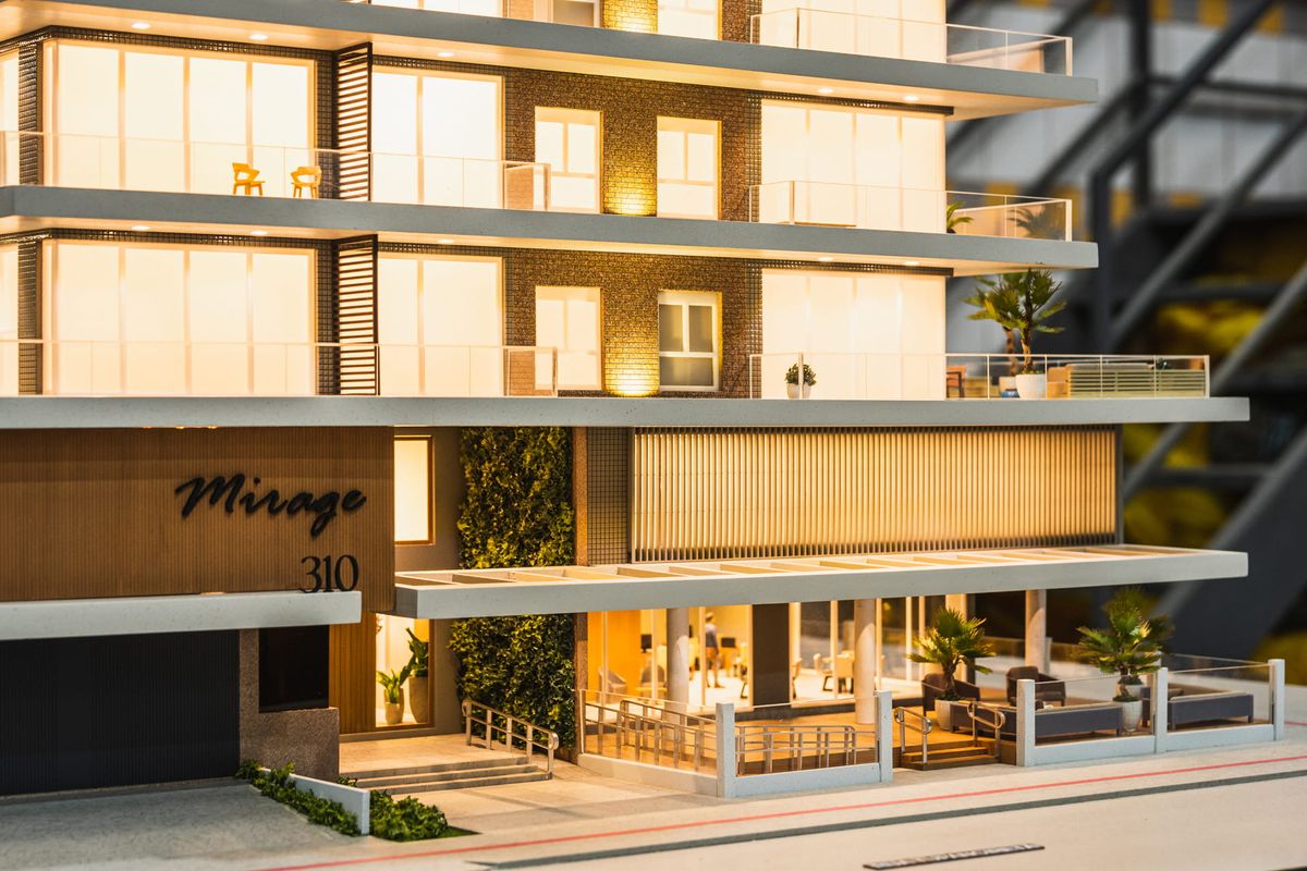 O Mirage é um empreendimento na praia que como a maioria dos empreendimentos no nosso litoral, tem um trabalho forte de pastilhas. Neste caso ainda foi associado com os brises e o resultado ficou bem interessante. O empreendimento conta com uma área condominial no térreo, rooftop, além das sacadas e alguns apartamentos mobiliados. Podemos dizer que essa maquete foi representada na alta temporada do verão, bem movimentada.