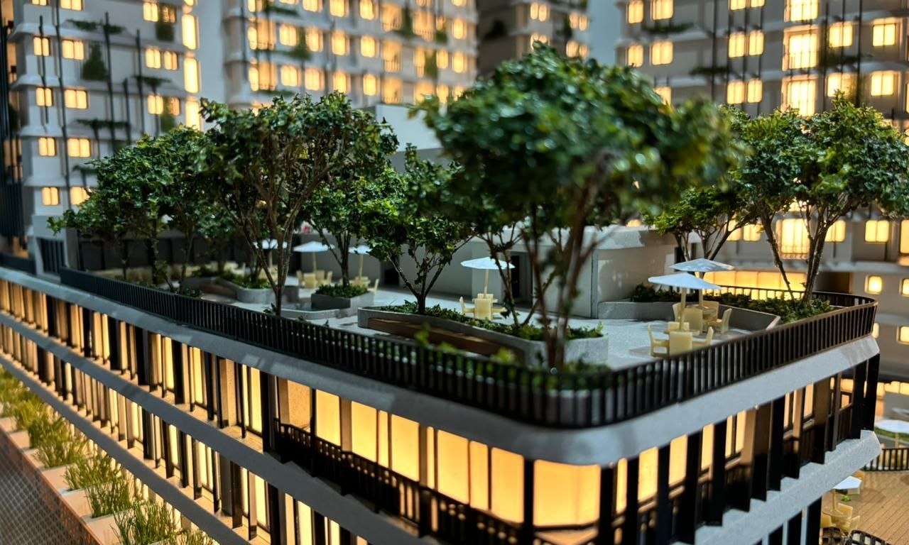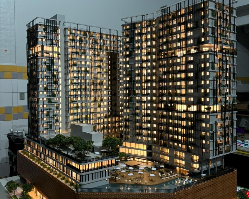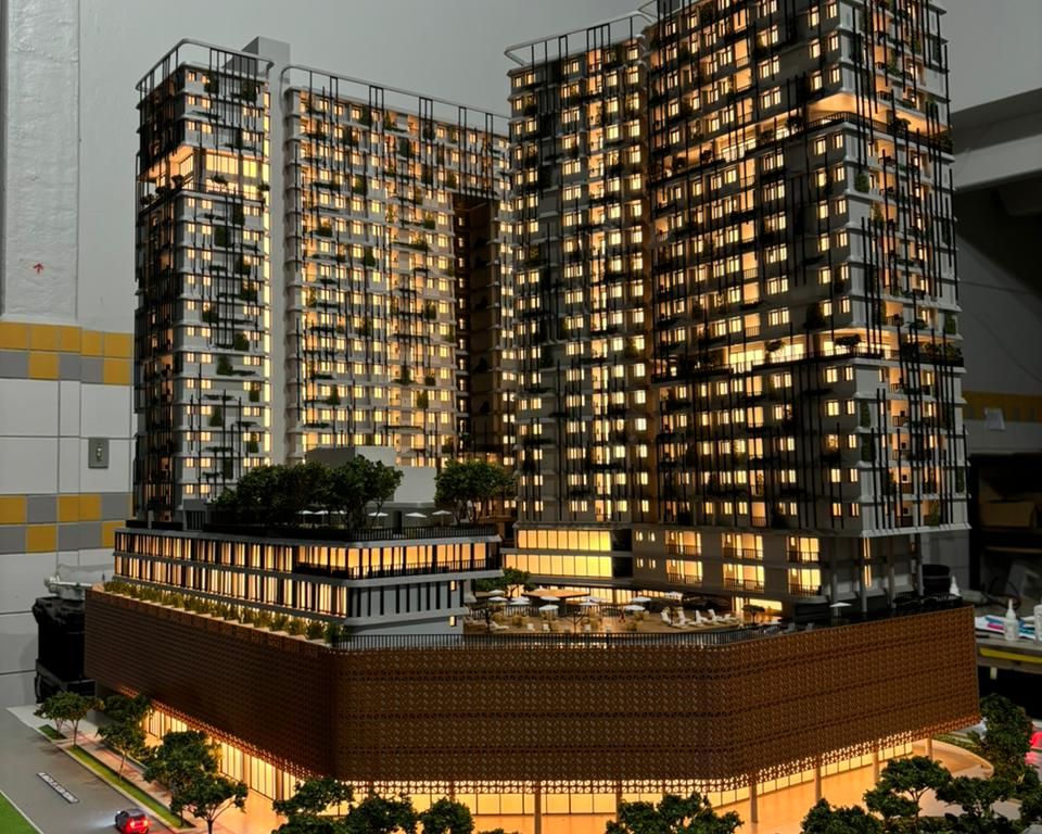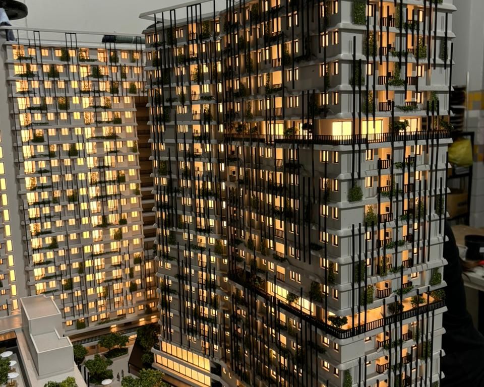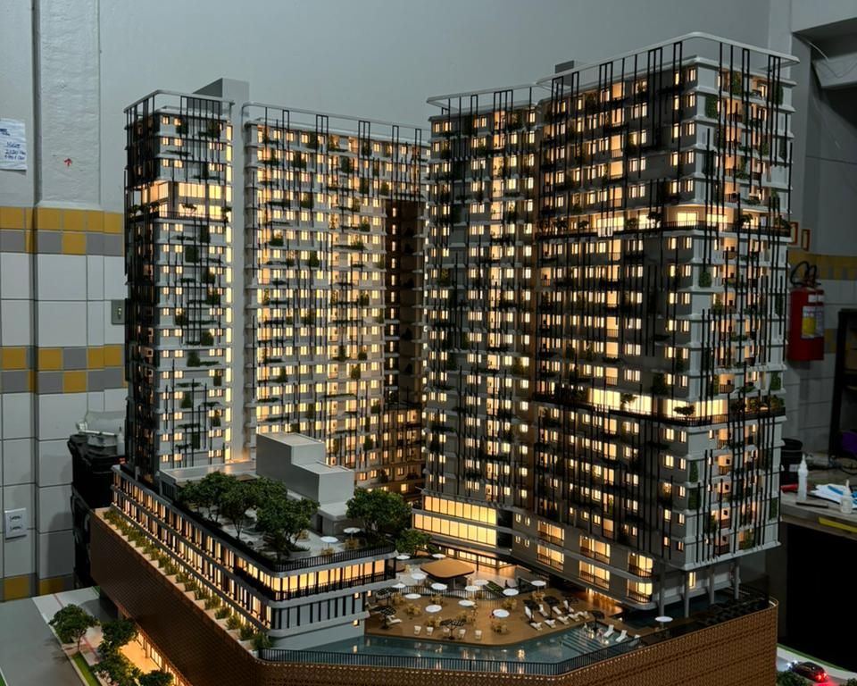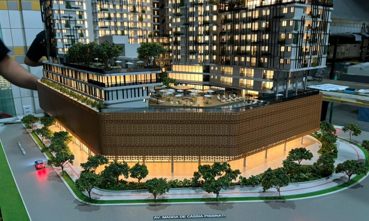 A arquitetura do Parque Sinop se destaca por suas duas torres majestosas e uma área condominial central cheia de elementos verticais e vazados, que conferem uma estética única e sofisticada. Os treliçados e os inúmeros elementos vazados na fachada são meticulosamente replicados na maquete, resultando em uma obra que chama a atenção e mantém o observador intrigado por todos os detalhes minuciosos.