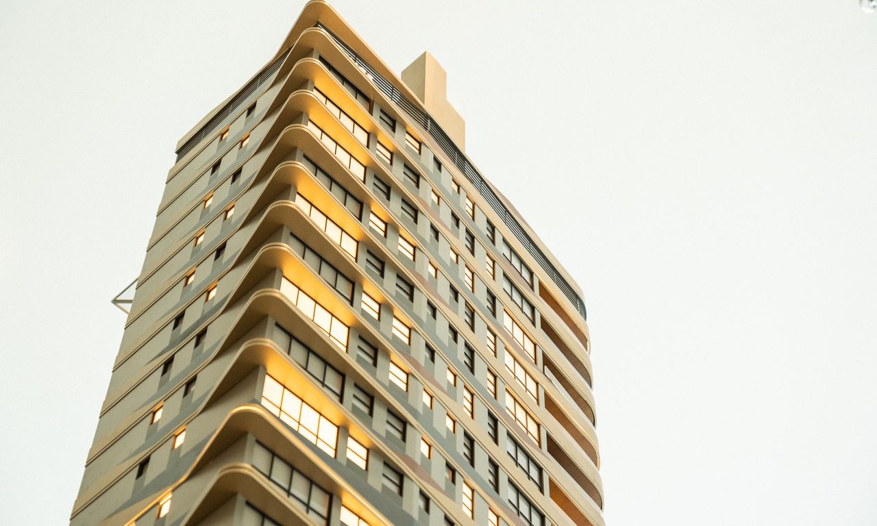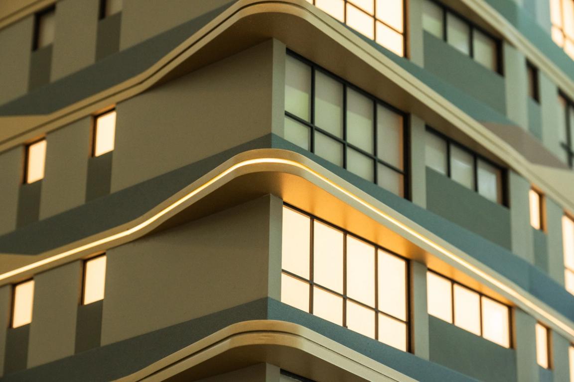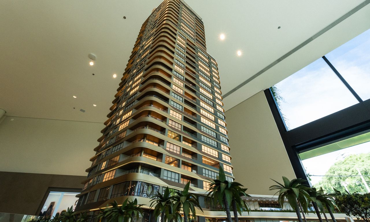 A arquitetura é marcada por formas arredondadas, sem ângulos retos evidentes, o que confere fluidez e movimento à torre. As fachadas recebem rasgos de iluminação com fita de LED contínua, que percorre o edifício e dialoga com os tons dourados e amadeirados escolhidos para o projeto. O resultado é uma composição visual extremamente elegante e contemporânea.