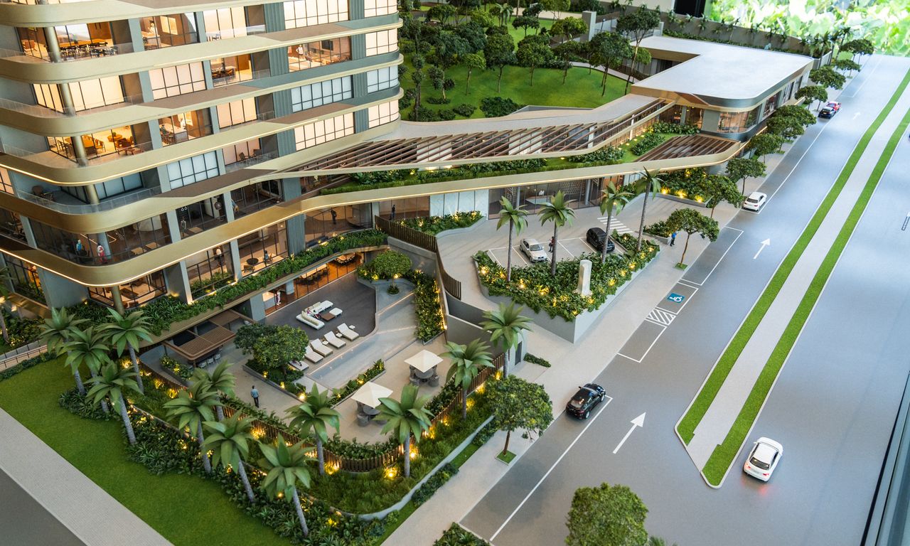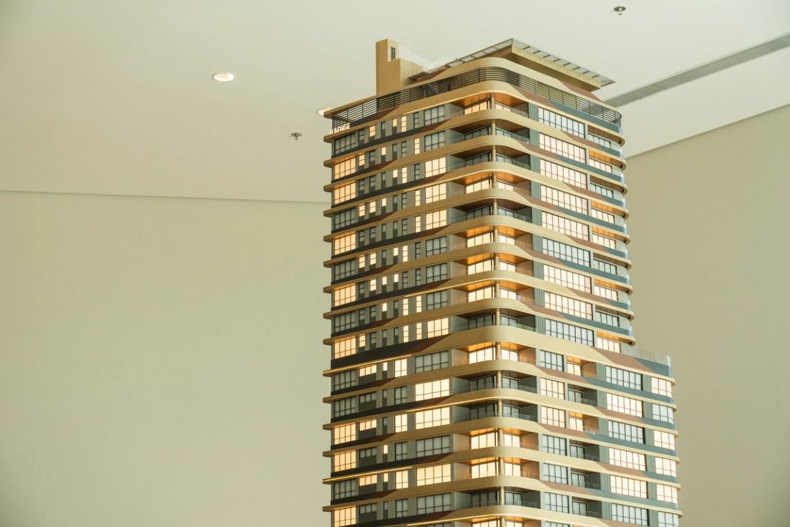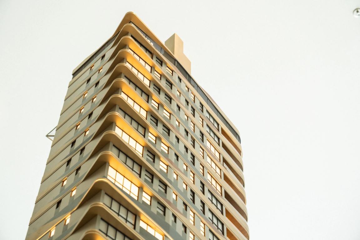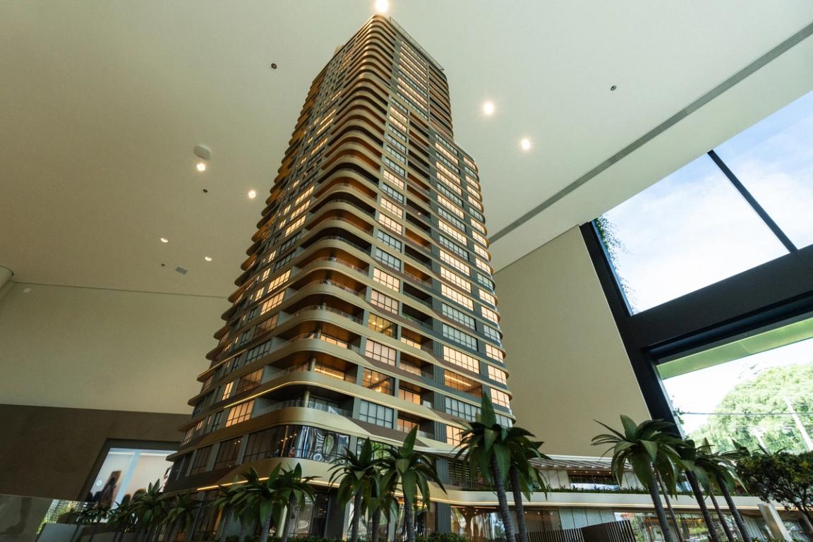 A arquitetura é marcada por formas arredondadas, sem ângulos retos evidentes, o que confere fluidez e movimento à torre. As fachadas recebem rasgos de iluminação com fita de LED contínua, que percorre o edifício e dialoga com os tons dourados e amadeirados escolhidos para o projeto. O resultado é uma composição visual extremamente elegante e contemporânea.
