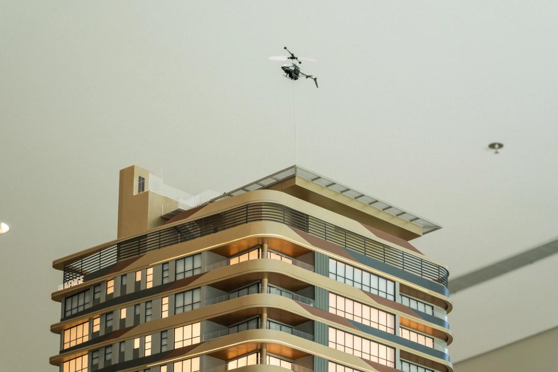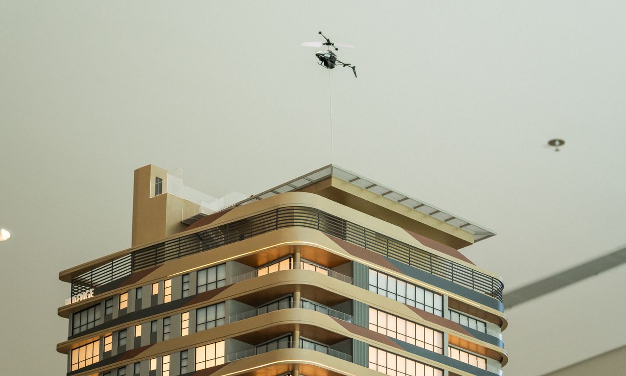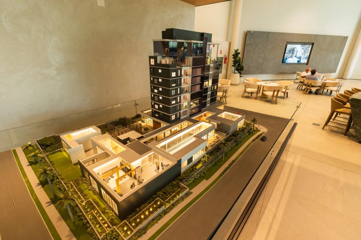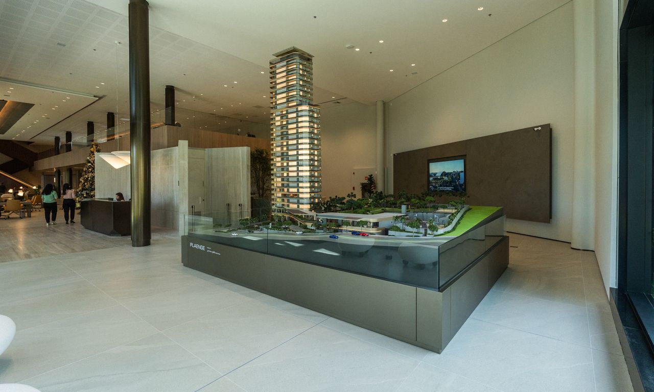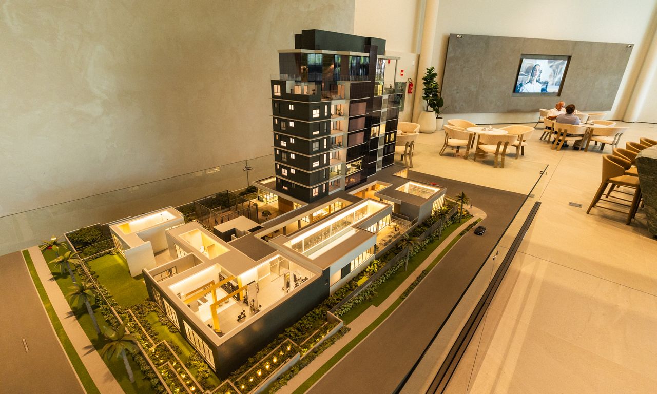 E como diferencial marcante, a maquete conta com a automação de um helicóptero que decola e pousa no heliponto, reforçando o caráter icônico e tecnológico do empreendimento.
