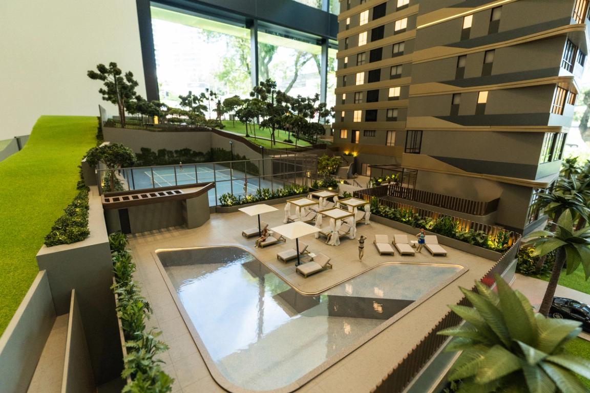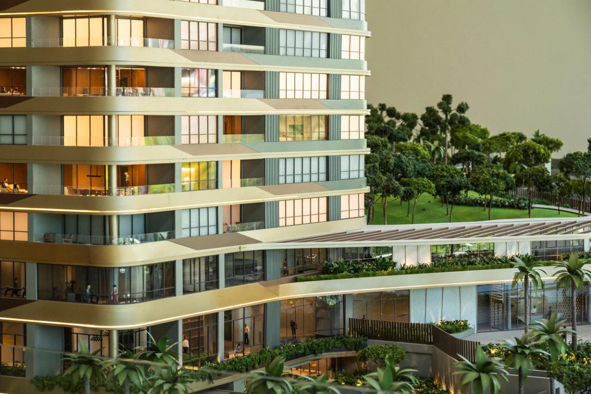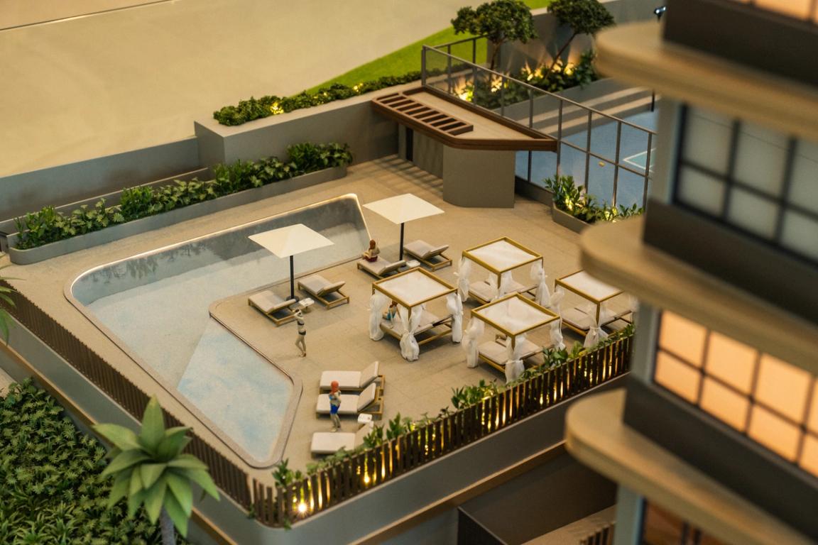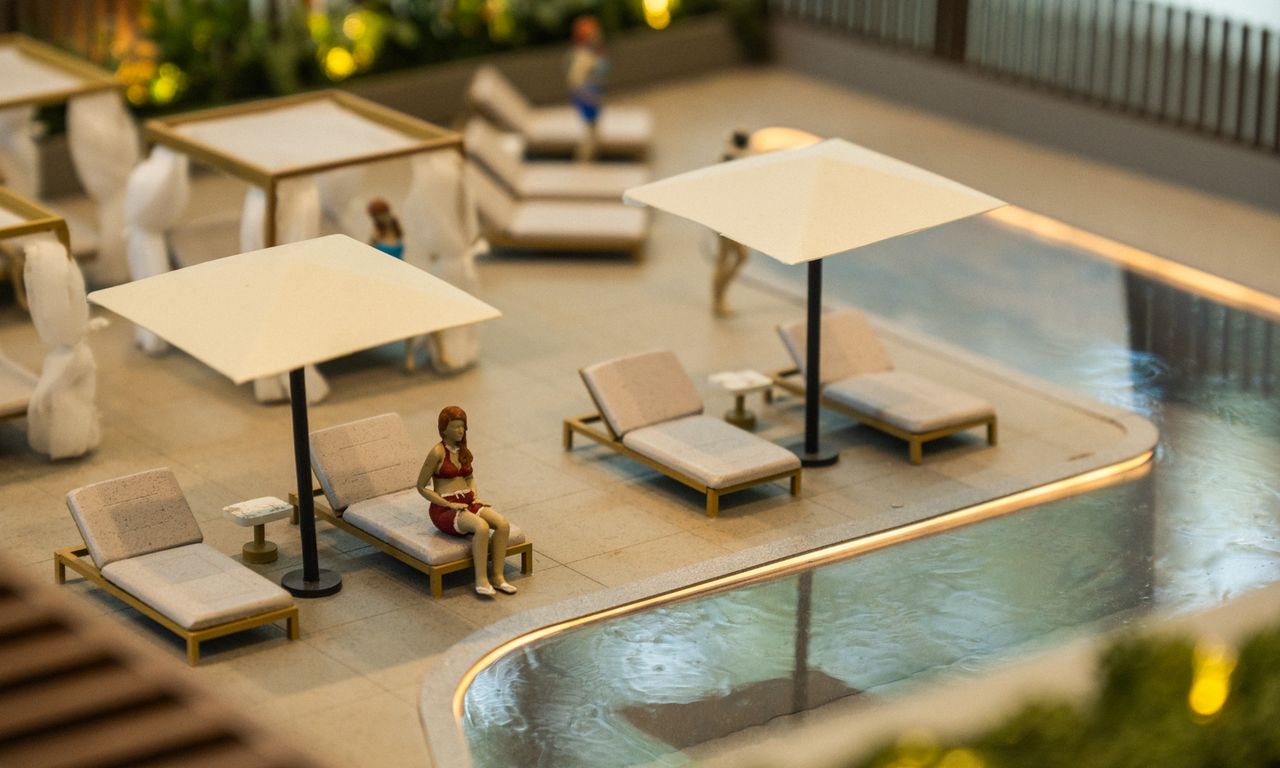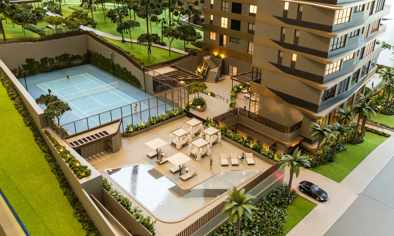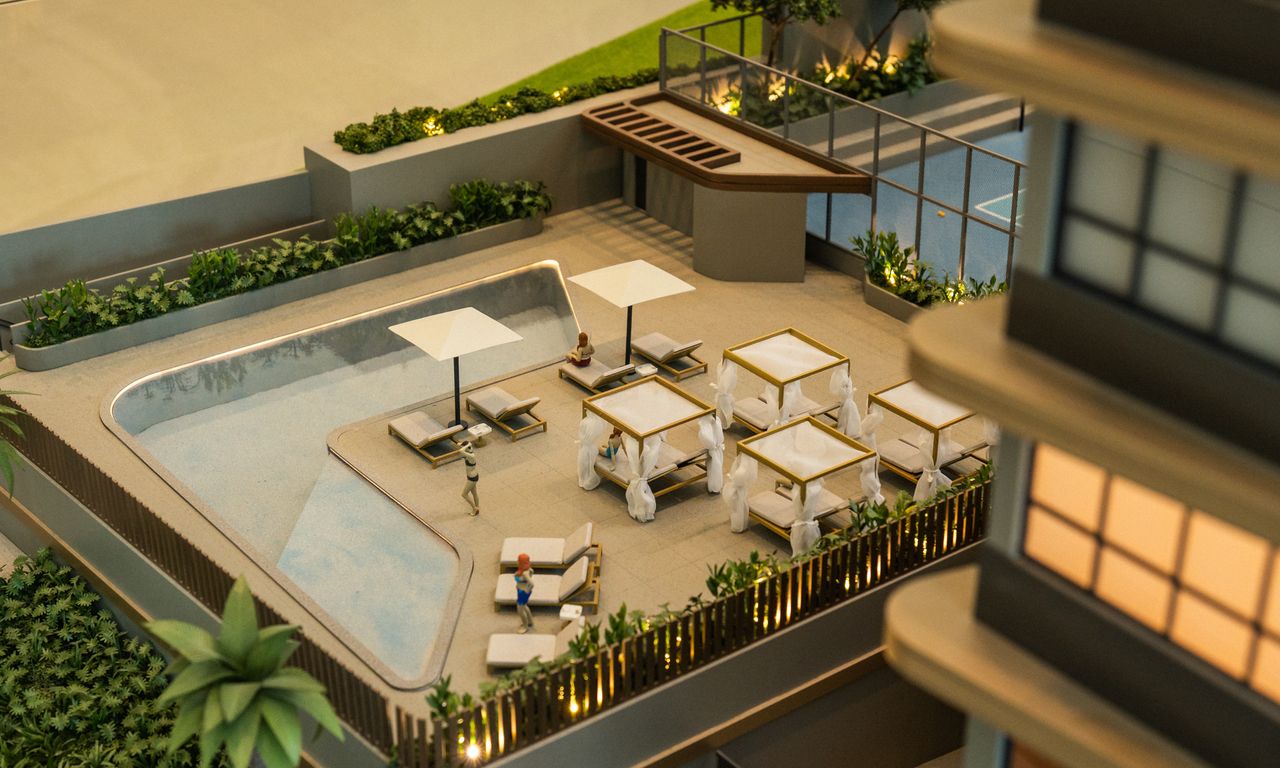 A iluminação é protagonista: área condominial, paisagismo, apartamentos e piscina recebem tratamento luminotécnico detalhado, criando uma leitura cênica da maquete. Essa riqueza luminosa está diretamente conectada à automação total do modelo.