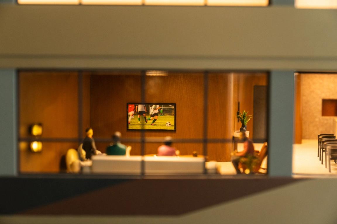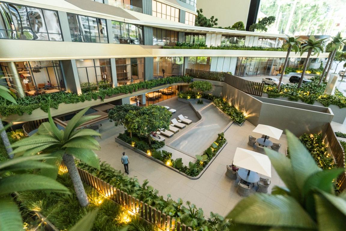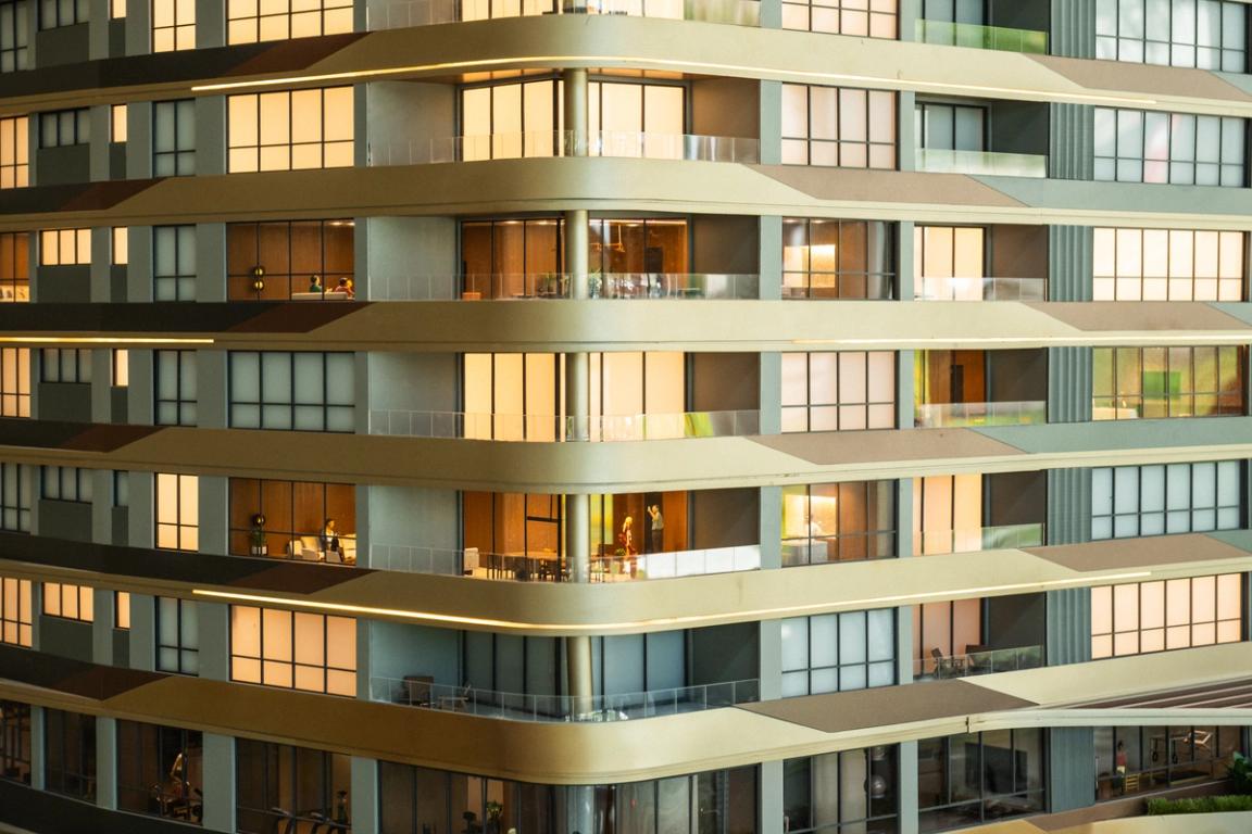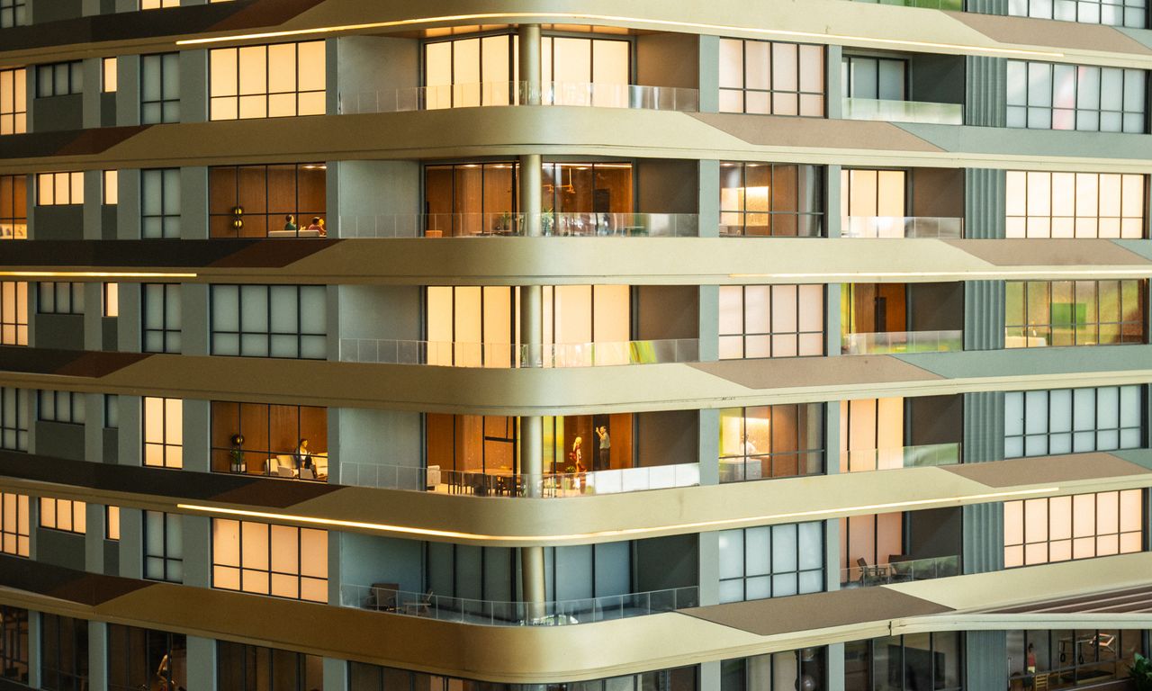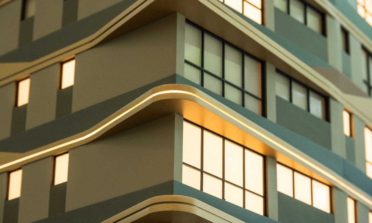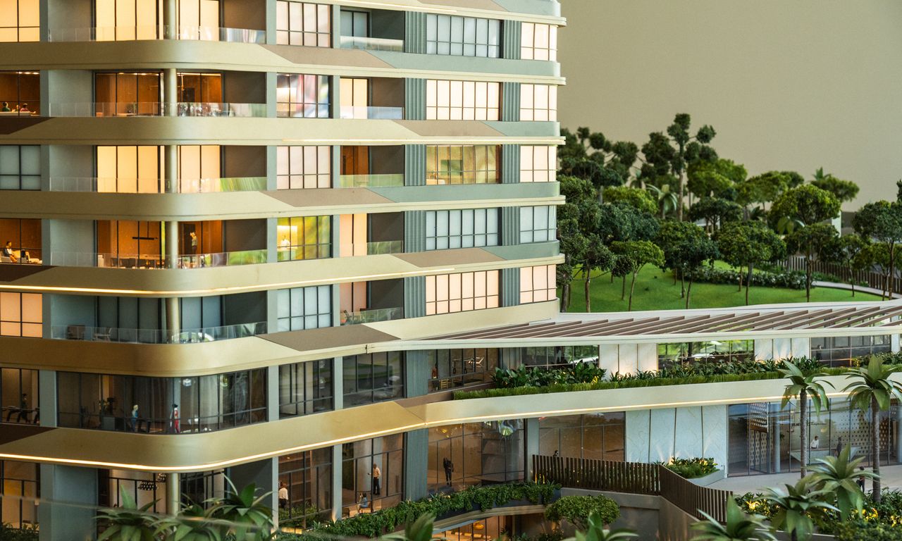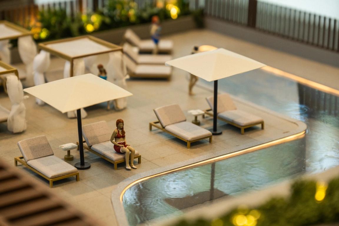 A iluminação é protagonista: área condominial, paisagismo, apartamentos e piscina recebem tratamento luminotécnico detalhado, criando uma leitura cênica da maquete. Essa riqueza luminosa está diretamente conectada à automação total do modelo.