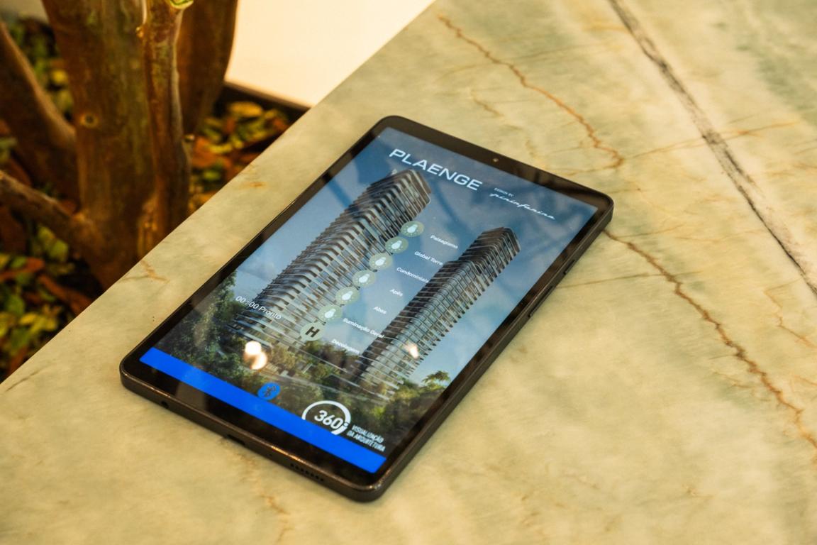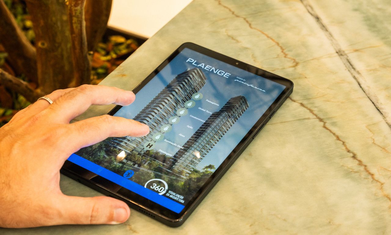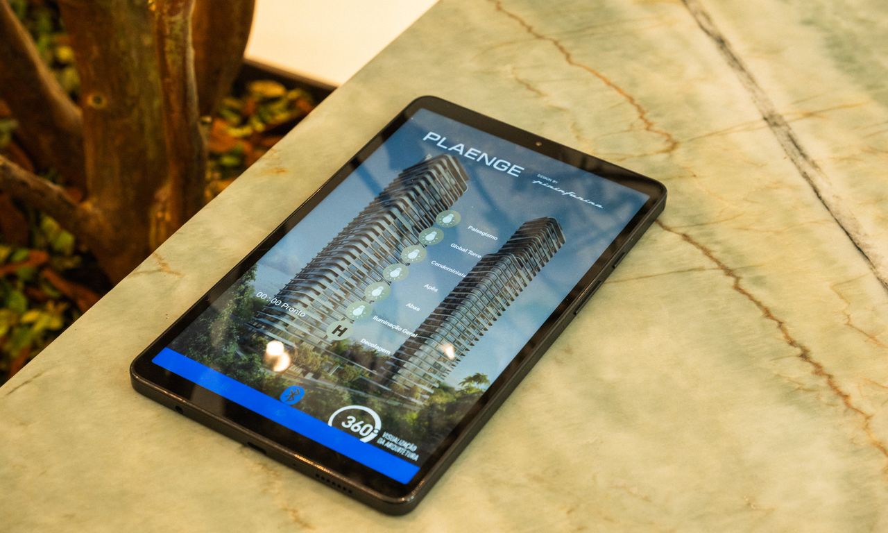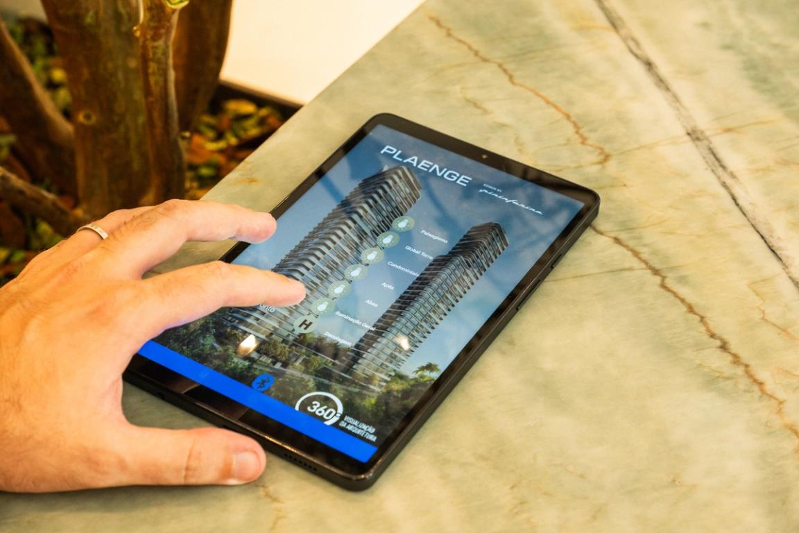 Por meio de um tablet, o usuário pode acionar diferentes cenários, ativando iluminação por setores — paisagismo, áreas comuns e unidades — tornando a experiência interativa e envolvente.