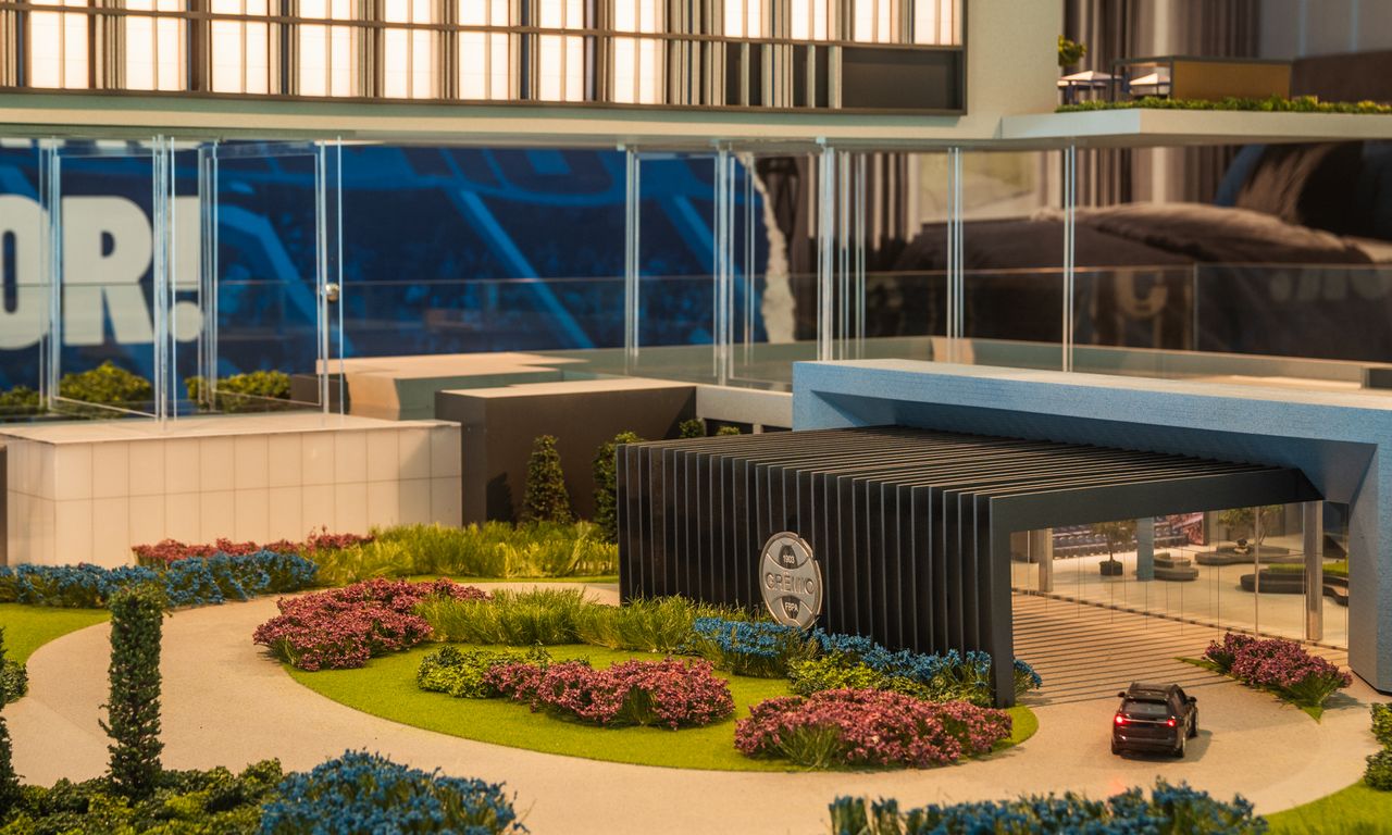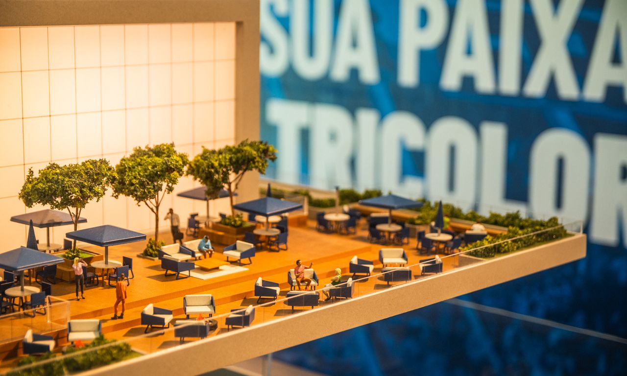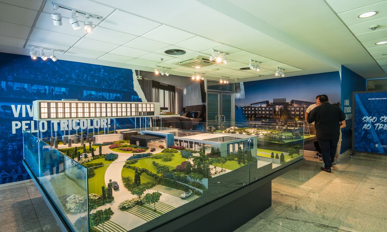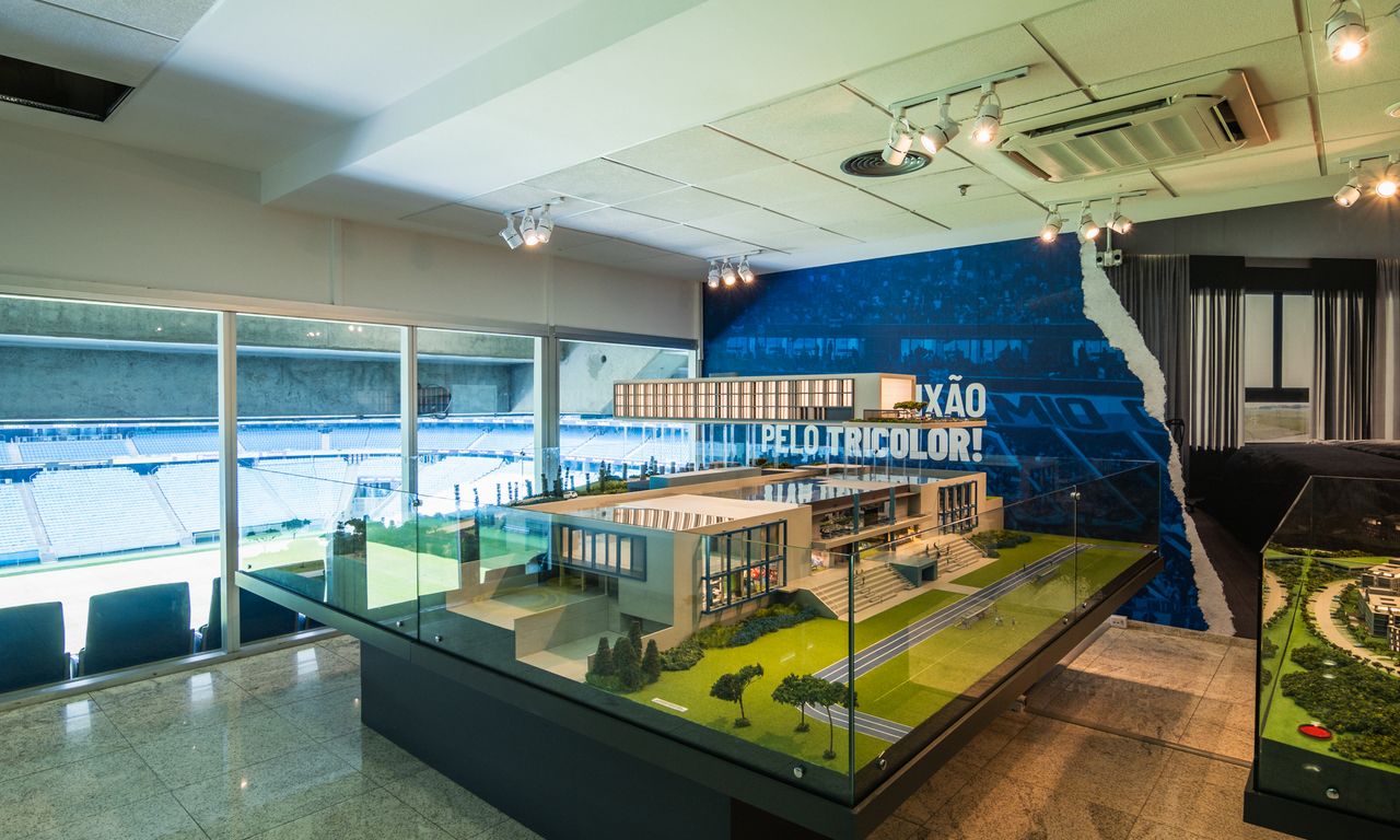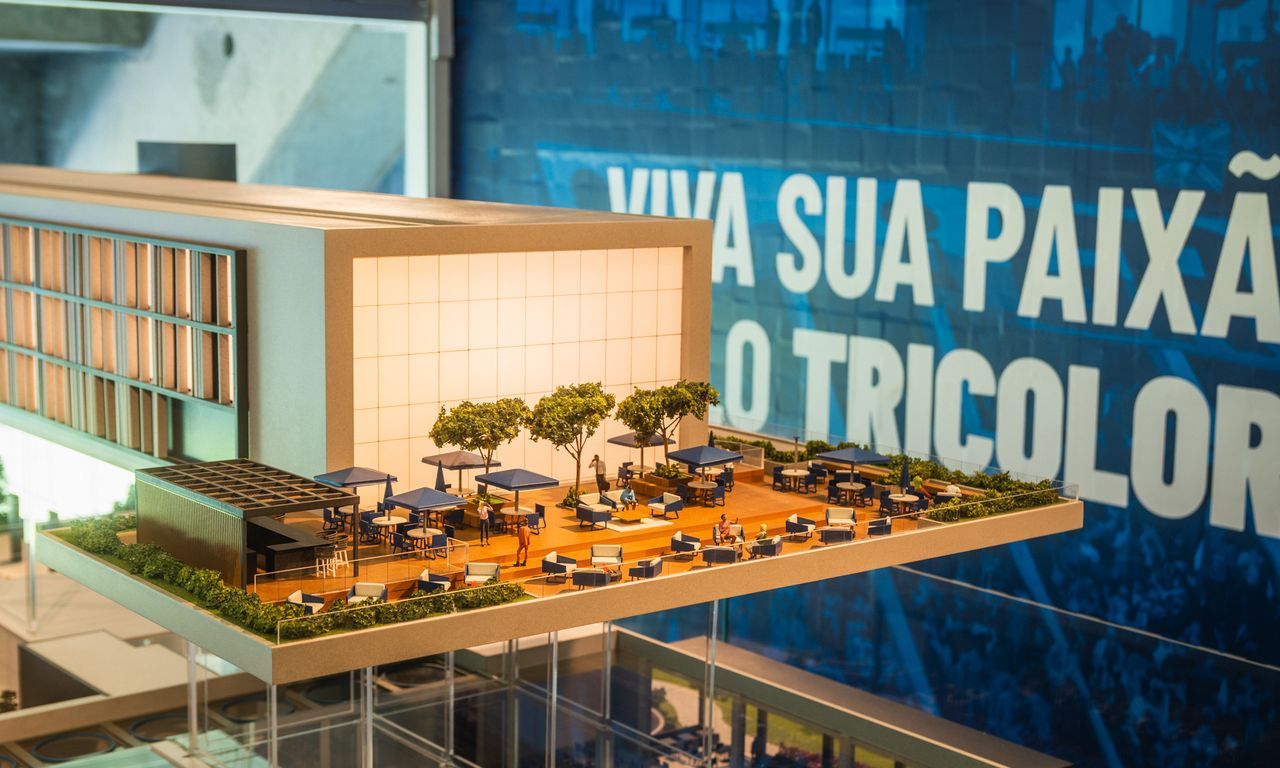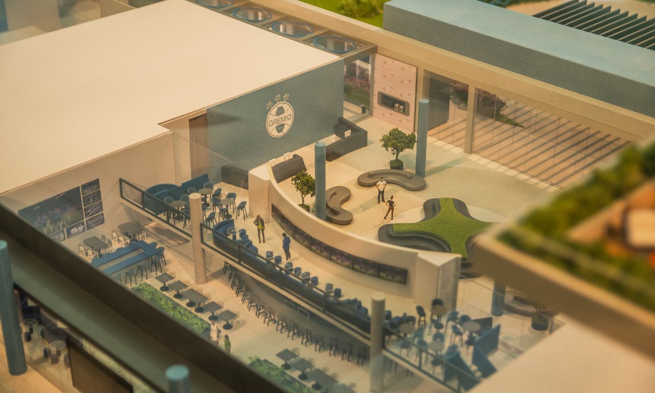 Clube Condominial: Esta parte da maquete mostra detalhadamente os interiores do clube, incluindo um restaurante, sala de jogos, terraço e uma área de arquibancada com vista para o campo de futebol. A decoração interna segue a temática do Grêmio, com detalhes que ressaltam a cultura e a paixão pelo clube.