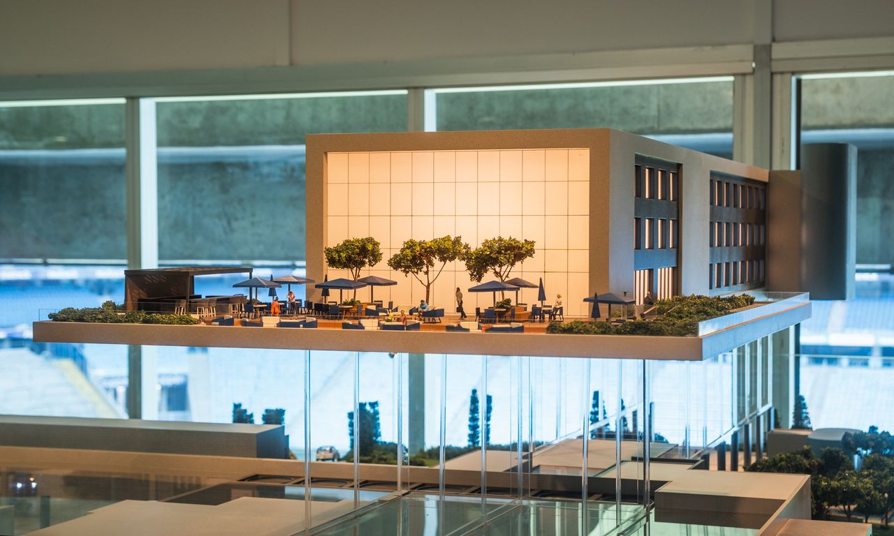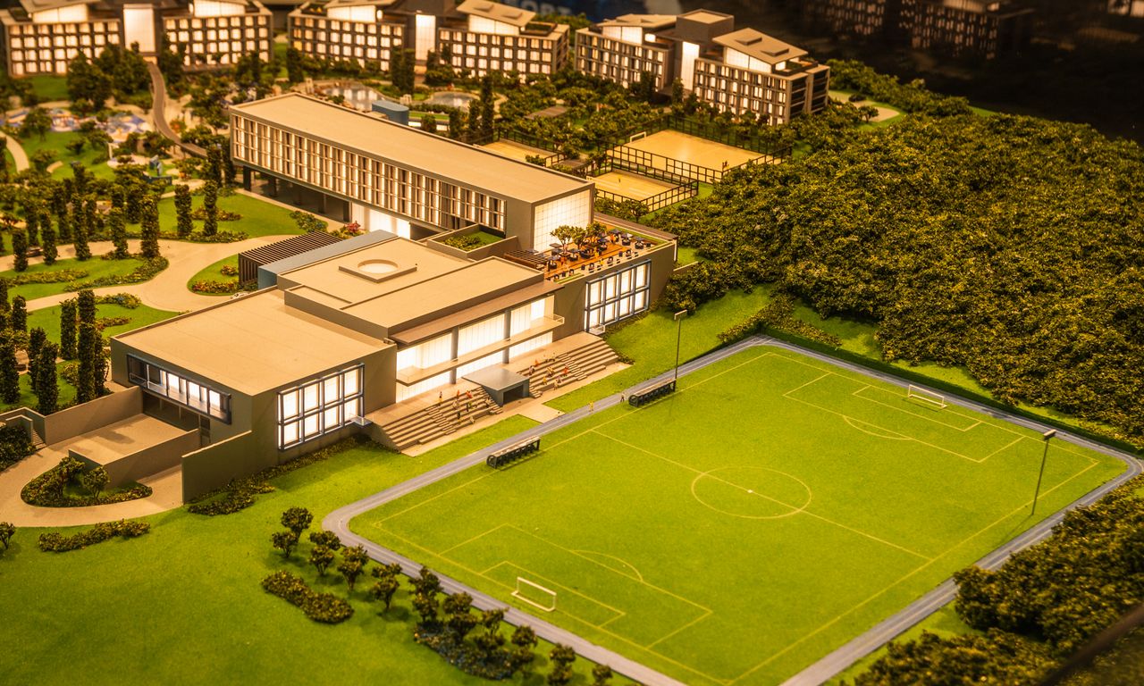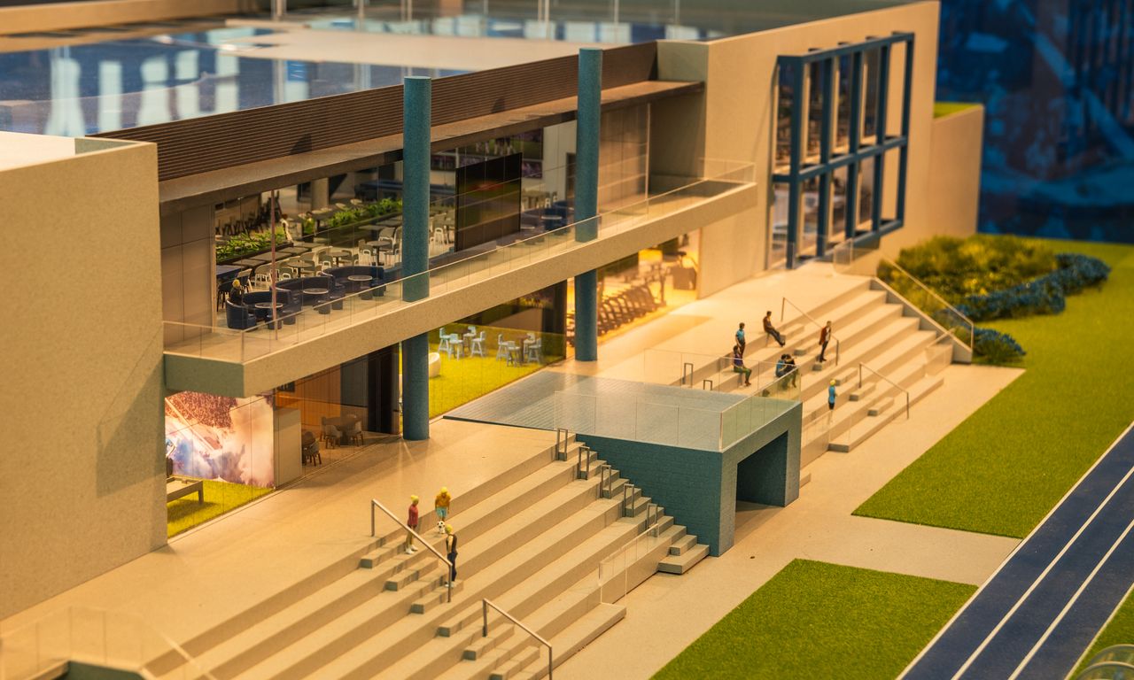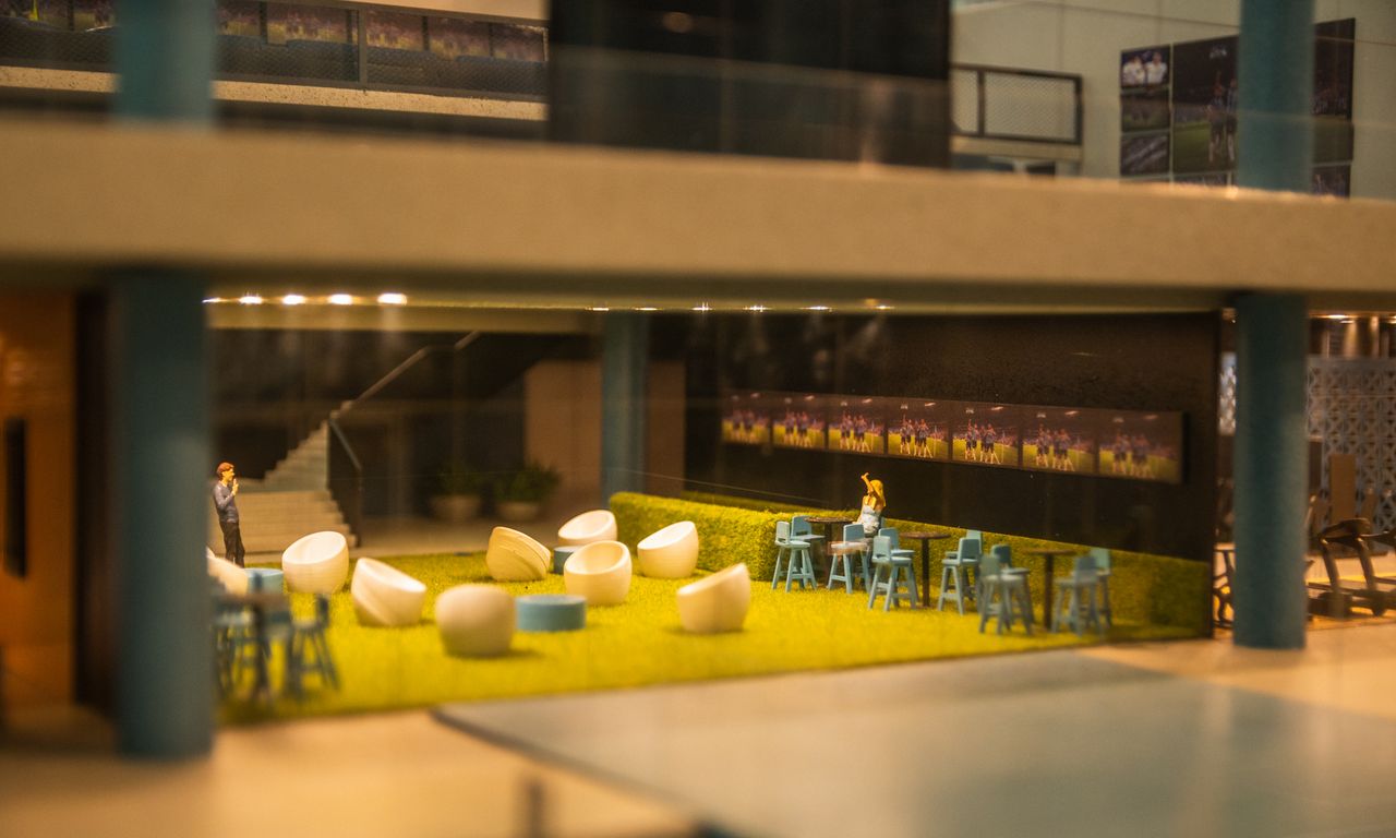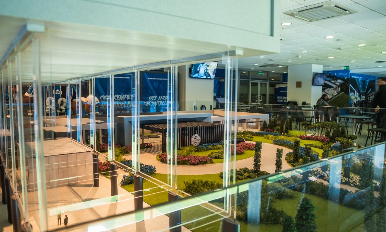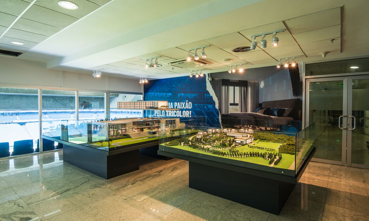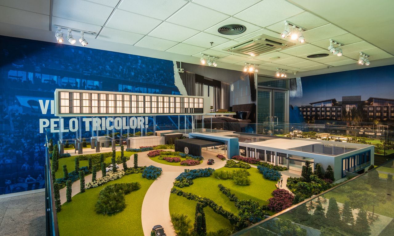 Clube Condominial: Esta parte da maquete mostra detalhadamente os interiores do clube, incluindo um restaurante, sala de jogos, terraço e uma área de arquibancada com vista para o campo de futebol. A decoração interna segue a temática do Grêmio, com detalhes que ressaltam a cultura e a paixão pelo clube.