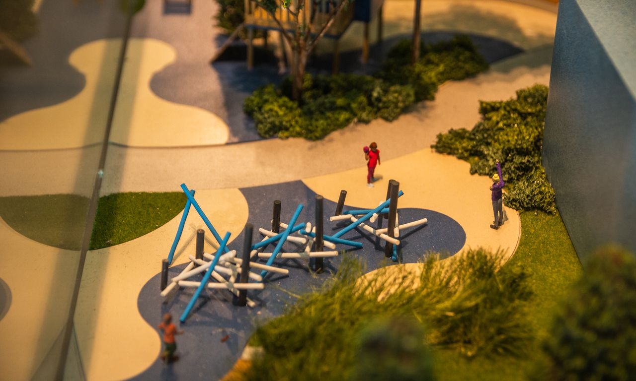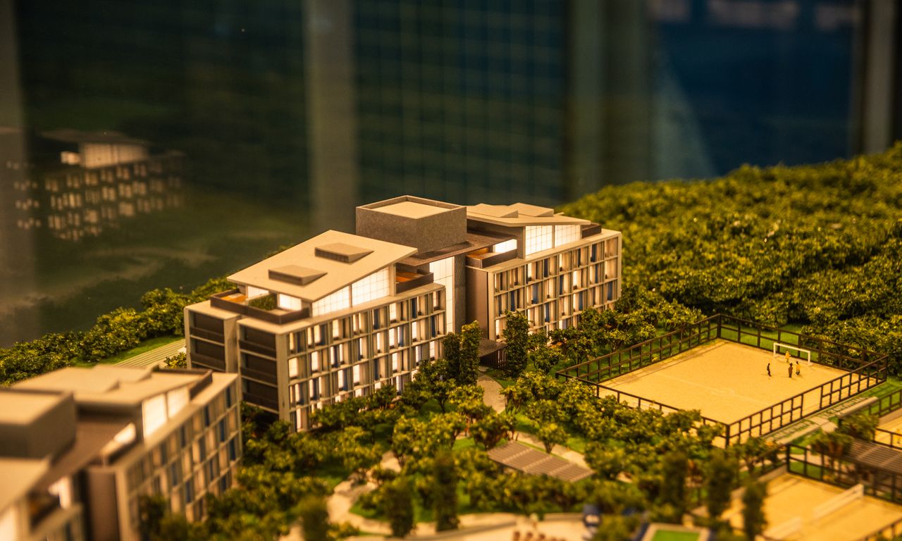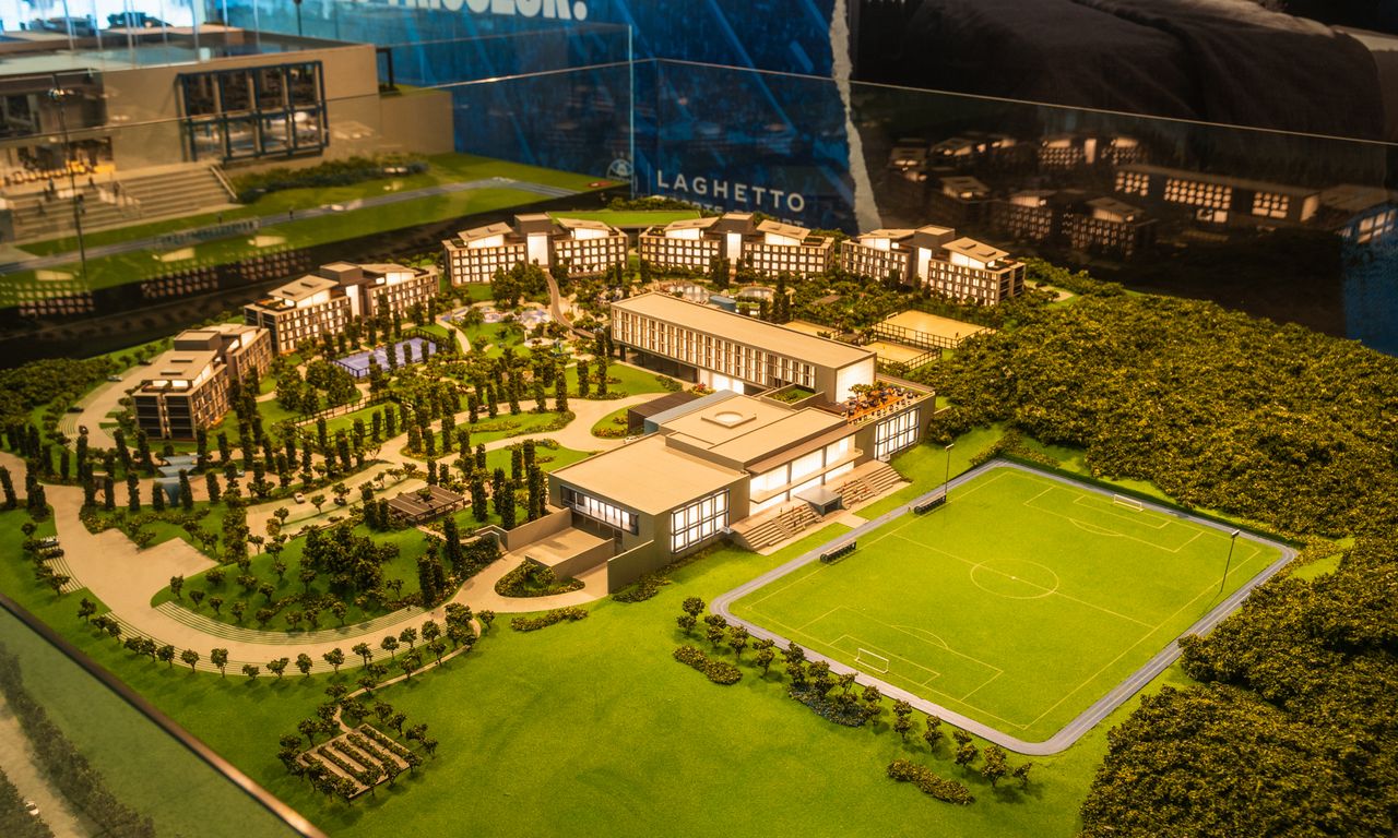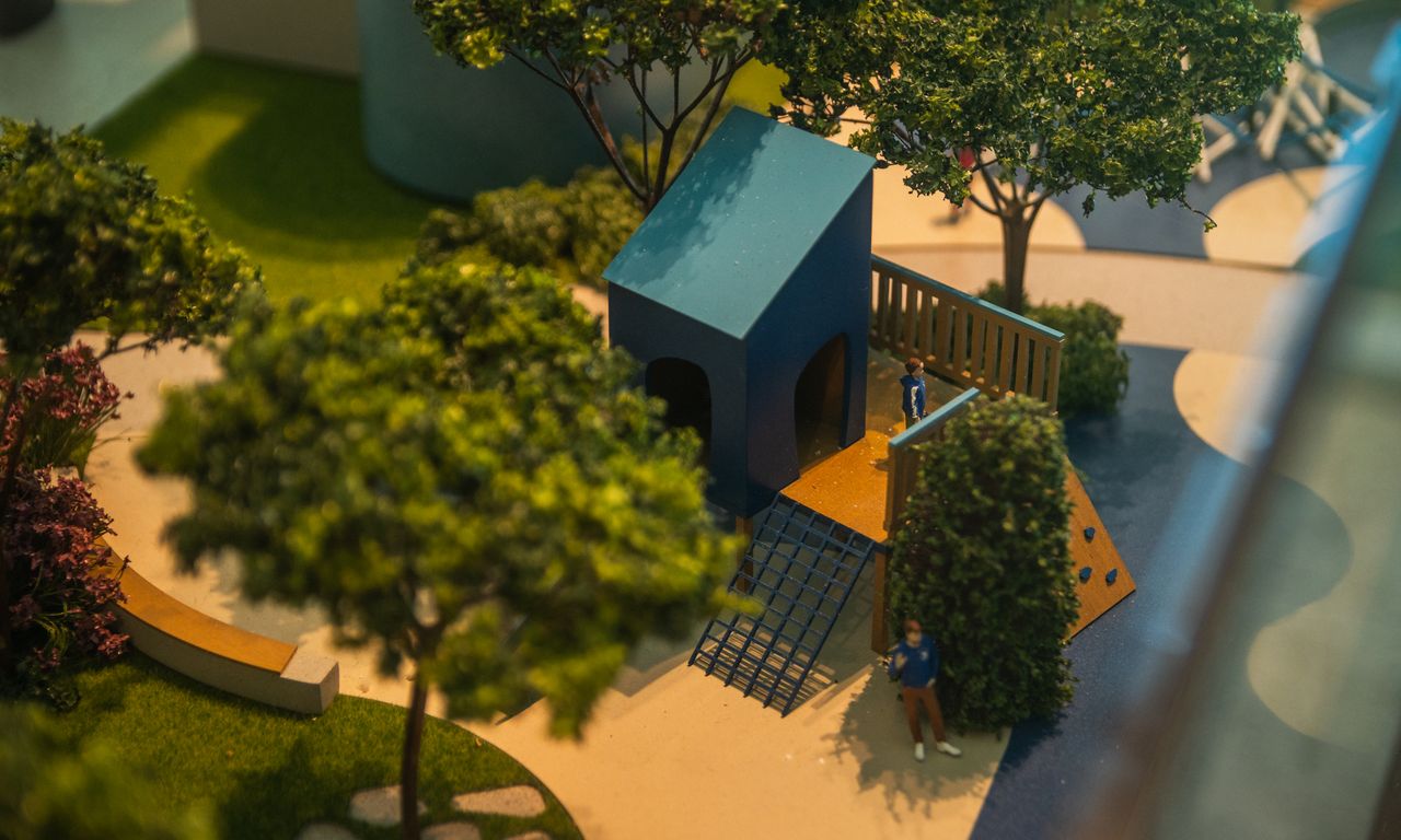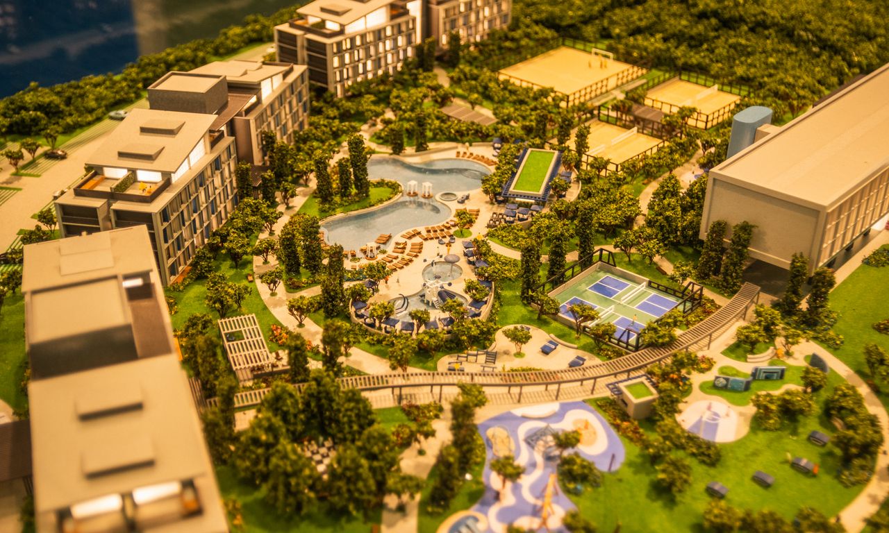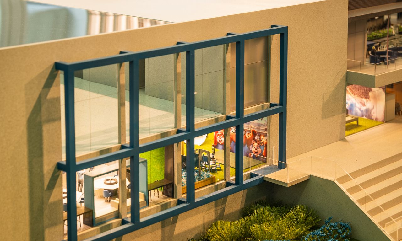 Clube Condominial: Esta parte da maquete mostra detalhadamente os interiores do clube, incluindo um restaurante, sala de jogos, terraço e uma área de arquibancada com vista para o campo de futebol. A decoração interna segue a temática do Grêmio, com detalhes que ressaltam a cultura e a paixão pelo clube.