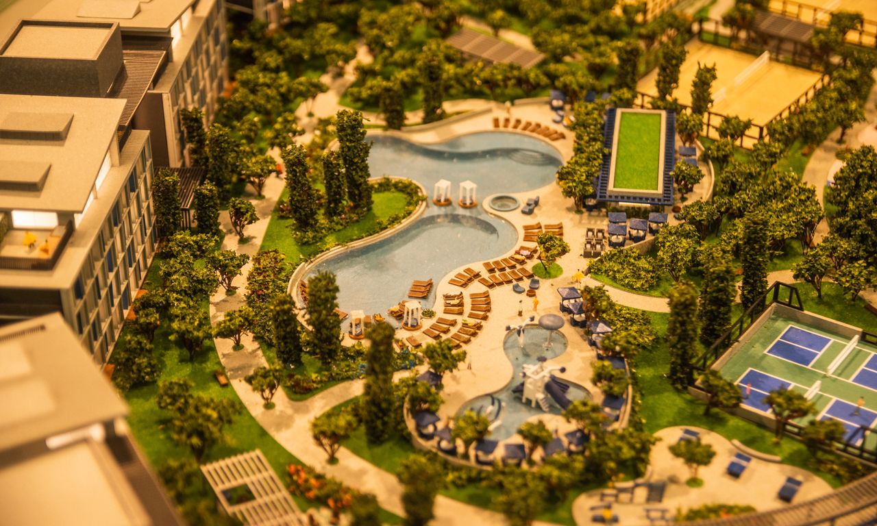 Torre do Resort: A torre do resort é uma estrutura imponente, cercada por áreas de lazer que incluem piscinas e jardins. A vegetação foi cuidadosamente trabalhada para dar uma sensação de um ambiente natural e relaxante.