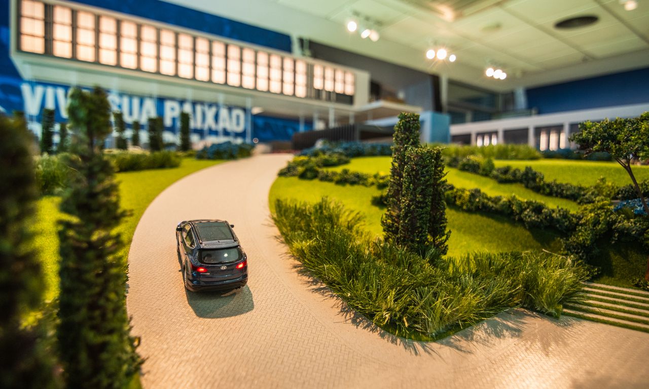 Estádio de Futebol: A maquete apresenta um estádio com arquibancadas, permitindo a visualização dos jogos em andamento. Este espaço é decorado predominantemente nas cores azul e branco, simbolizando a identidade do Grêmio.
