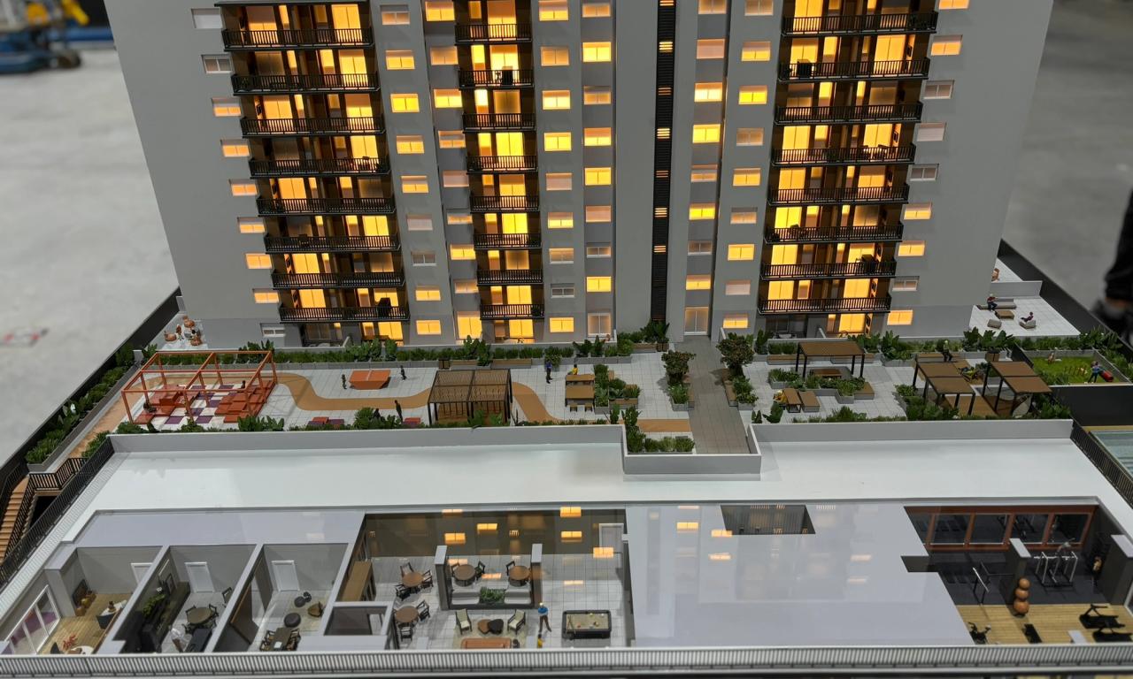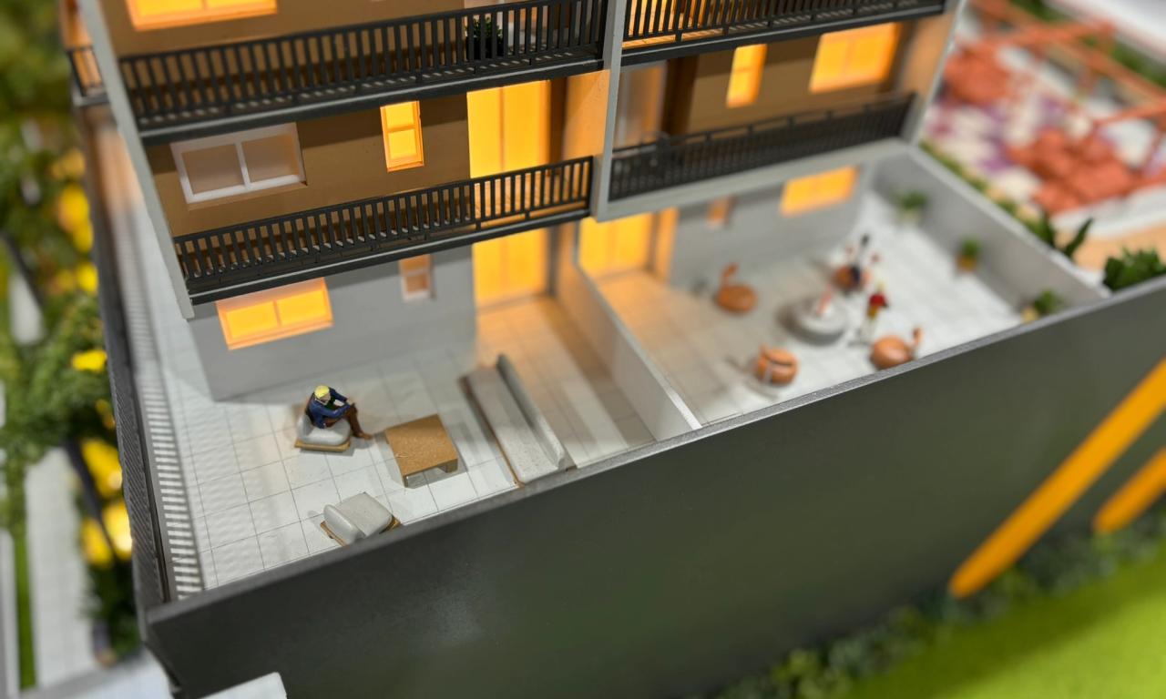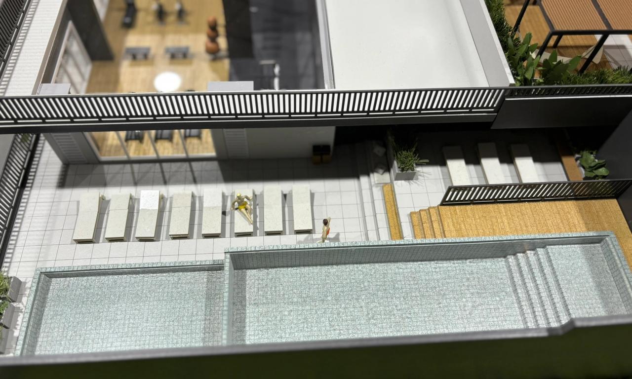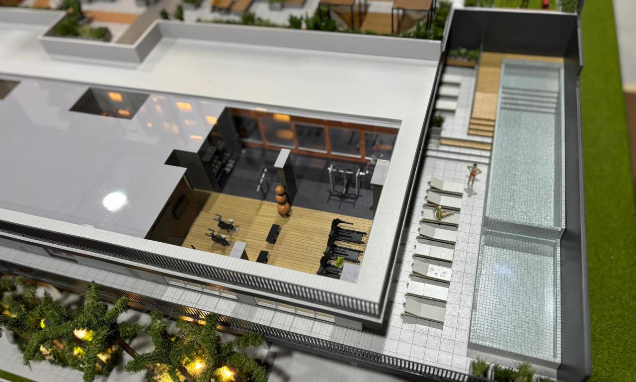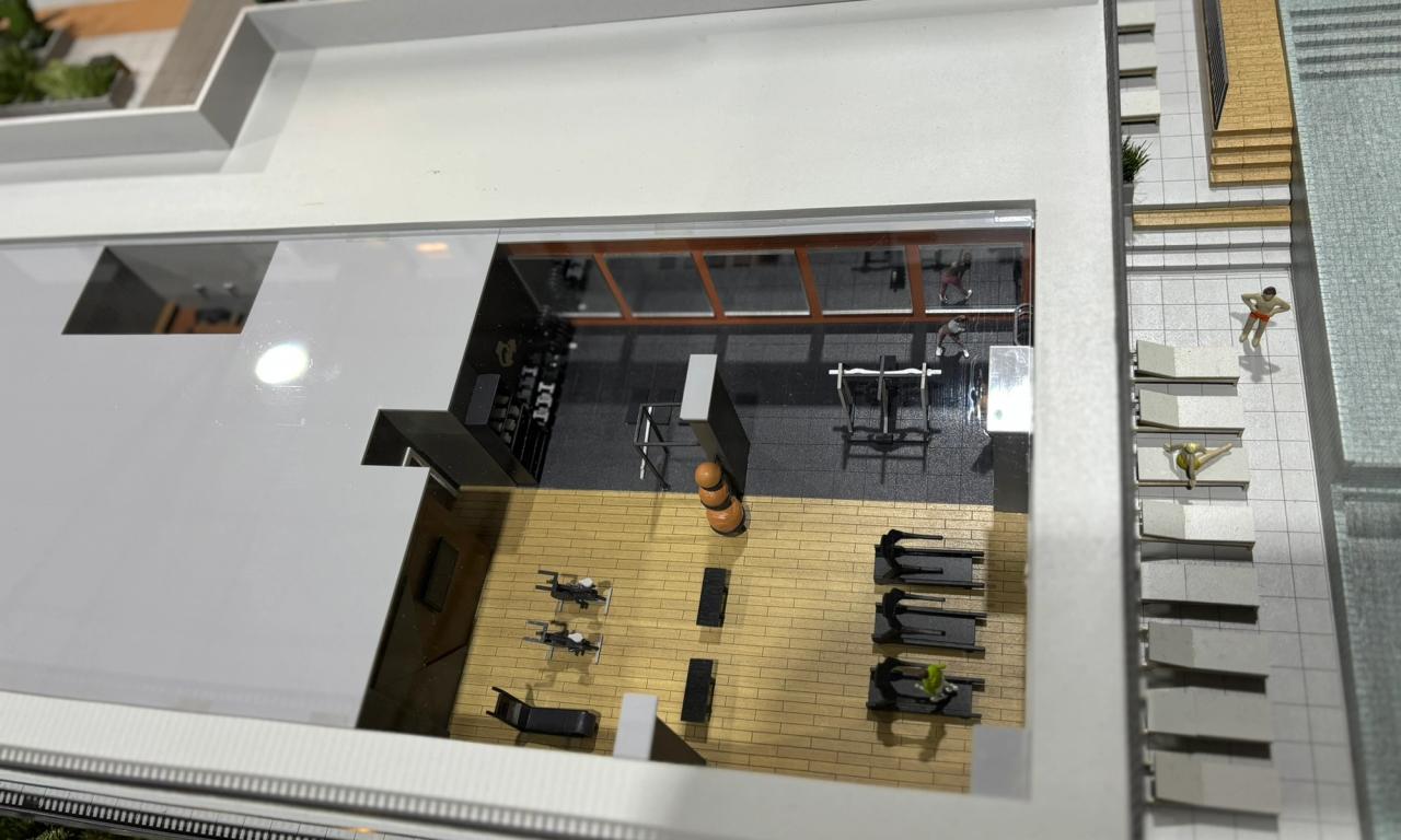 O empreendimento conta com duas torres , onde representamos uma torre completa e a outra cortada. Essa escolha permitiu que as áreas condominiais do segundo pavimento e o miolo central entre as torres fossem facilmente visualizados, garantindo uma experiência detalhada e funcional na apresentação do projeto.