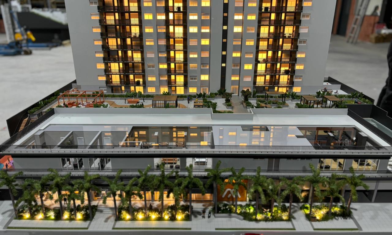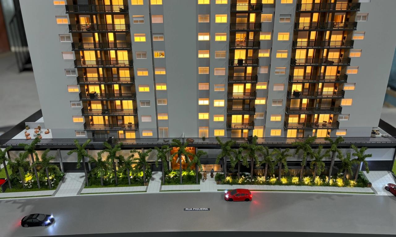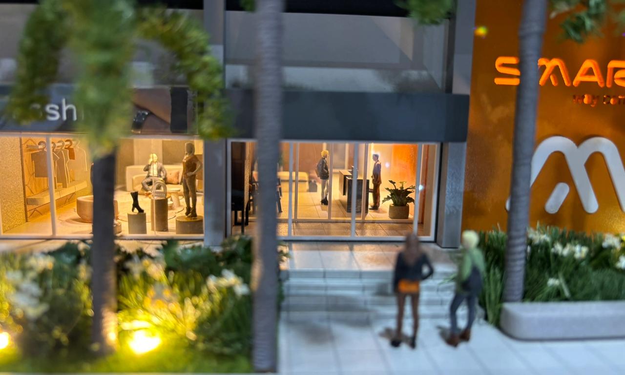 Localizado na praia, o empreendimento Smart Camboriú traz uma proposta jovem, vibrante e descontraída. Nossa maquete foi projetada para destacar esses elementos, evidenciando a riqueza de iluminação da fachada, o logotipo colorido e divertido, além das diversas lojas no térreo, todas mobiliadas para proporcionar uma visão completa do projeto.