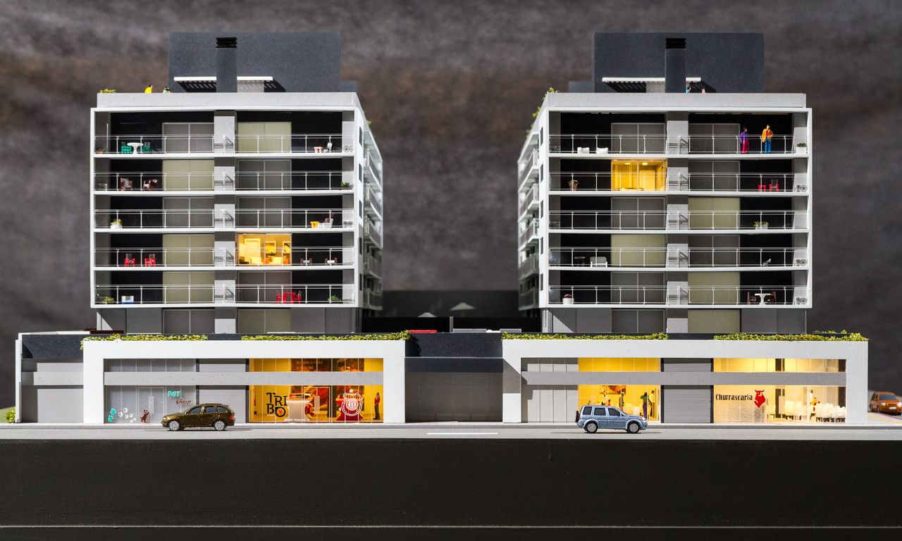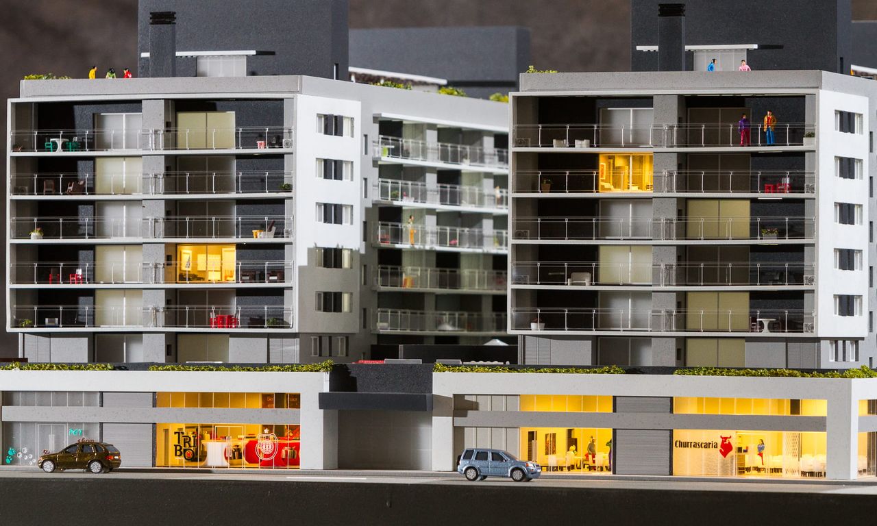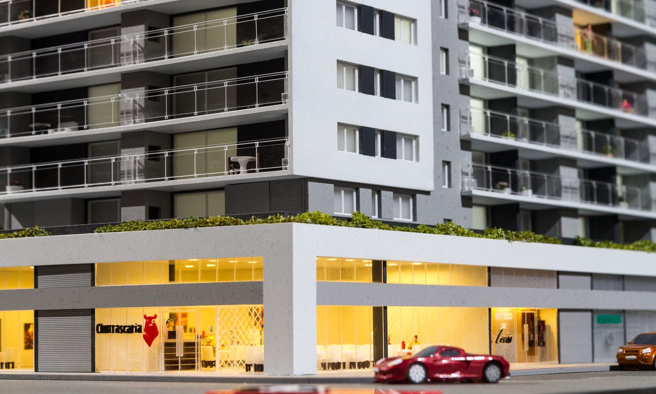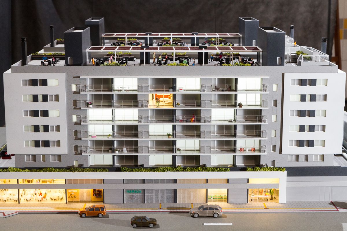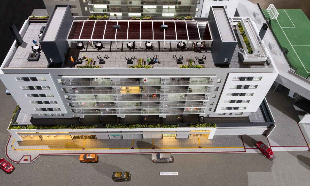 Como o projeto ocupa 100% do lote em sua base,nesta maquete houve um extensivo trabalho de humanização das sacadas e terraços, além do roof top com churrasqueiras e uma pequena arquibancada voltada para o estádio Bento Freitas.