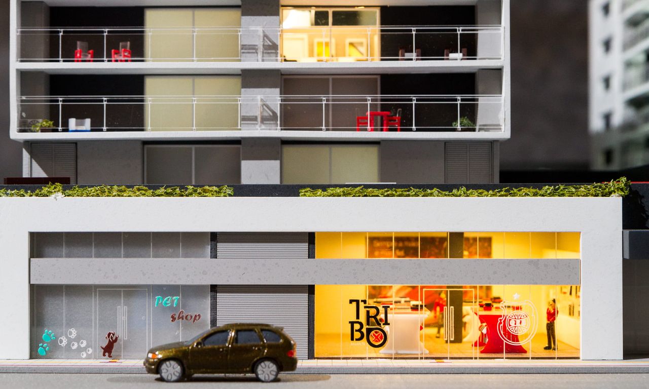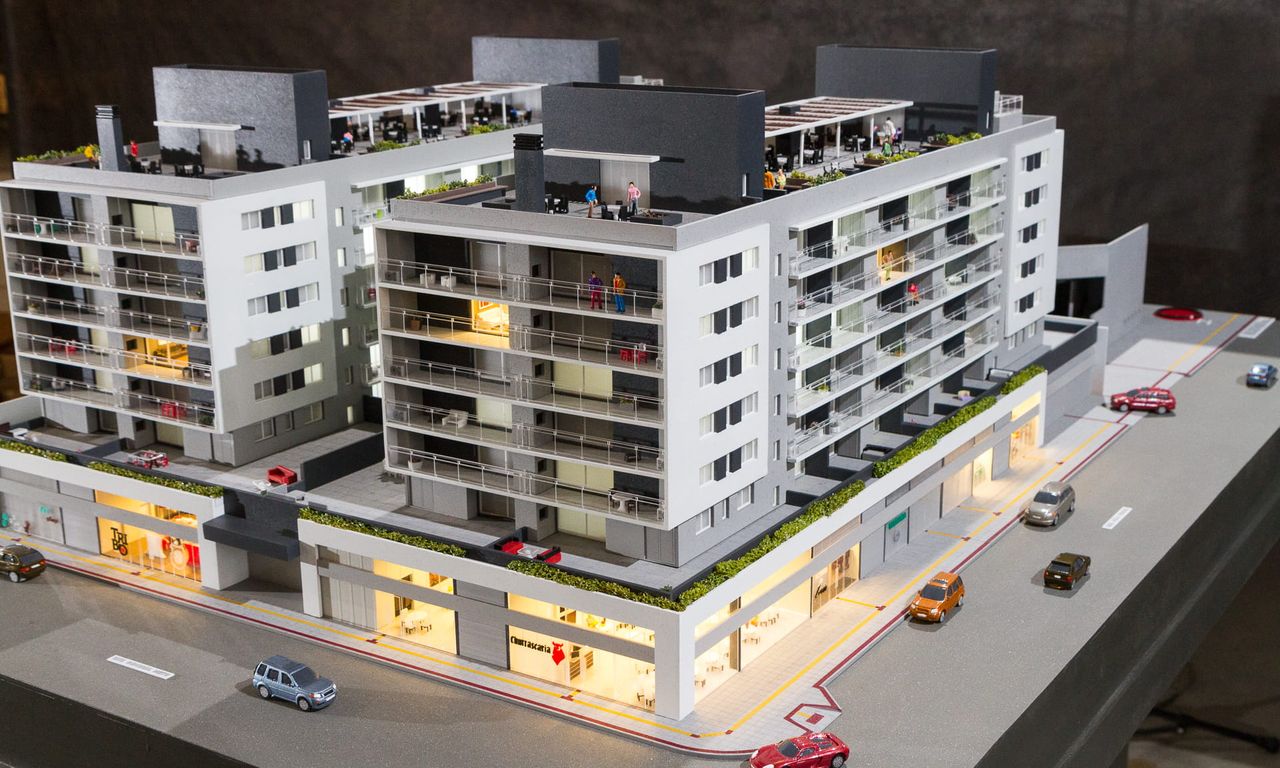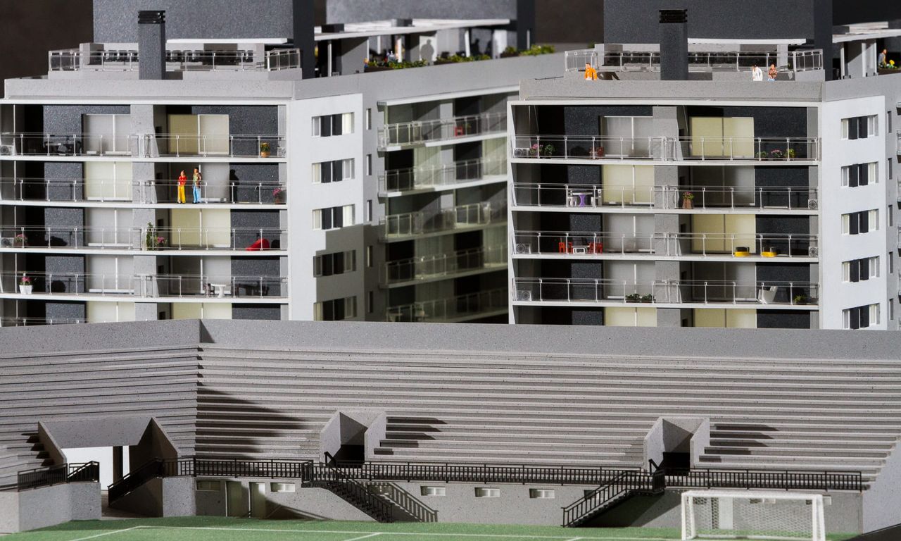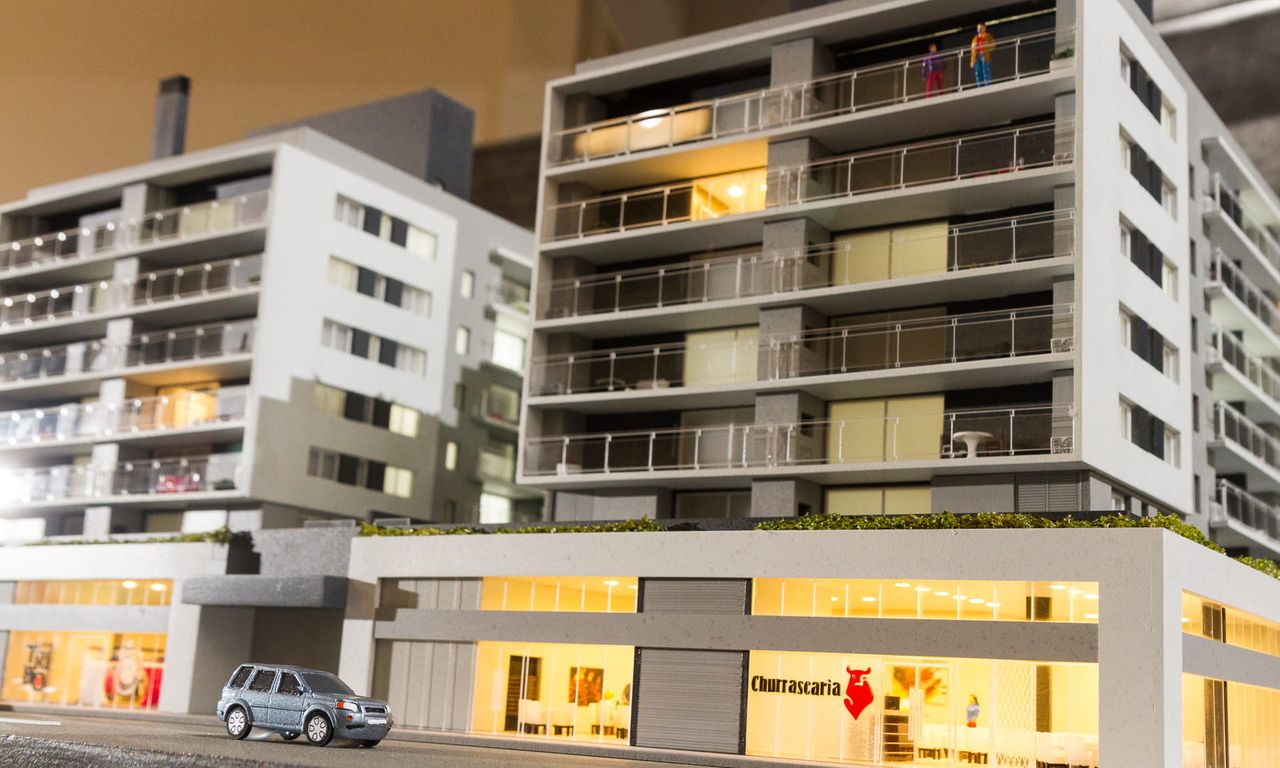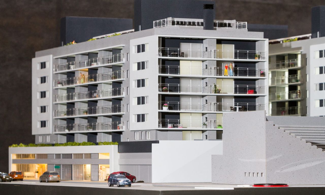 Como o projeto ocupa 100% do lote em sua base,nesta maquete houve um extensivo trabalho de humanização das sacadas e terraços, além do roof top com churrasqueiras e uma pequena arquibancada voltada para o estádio Bento Freitas.