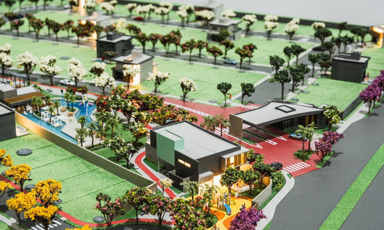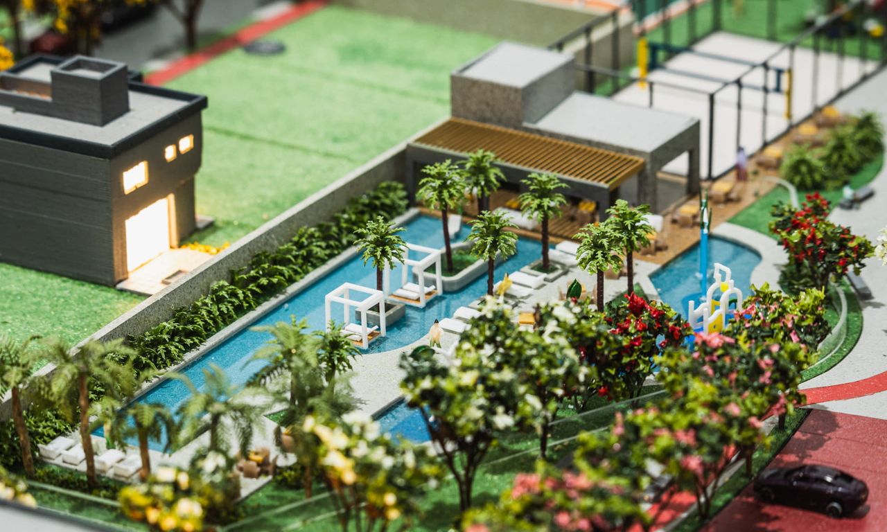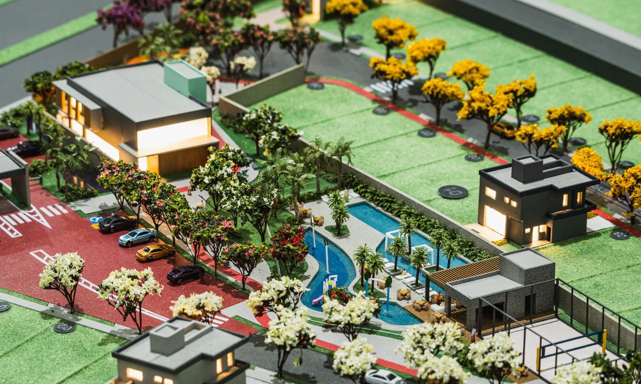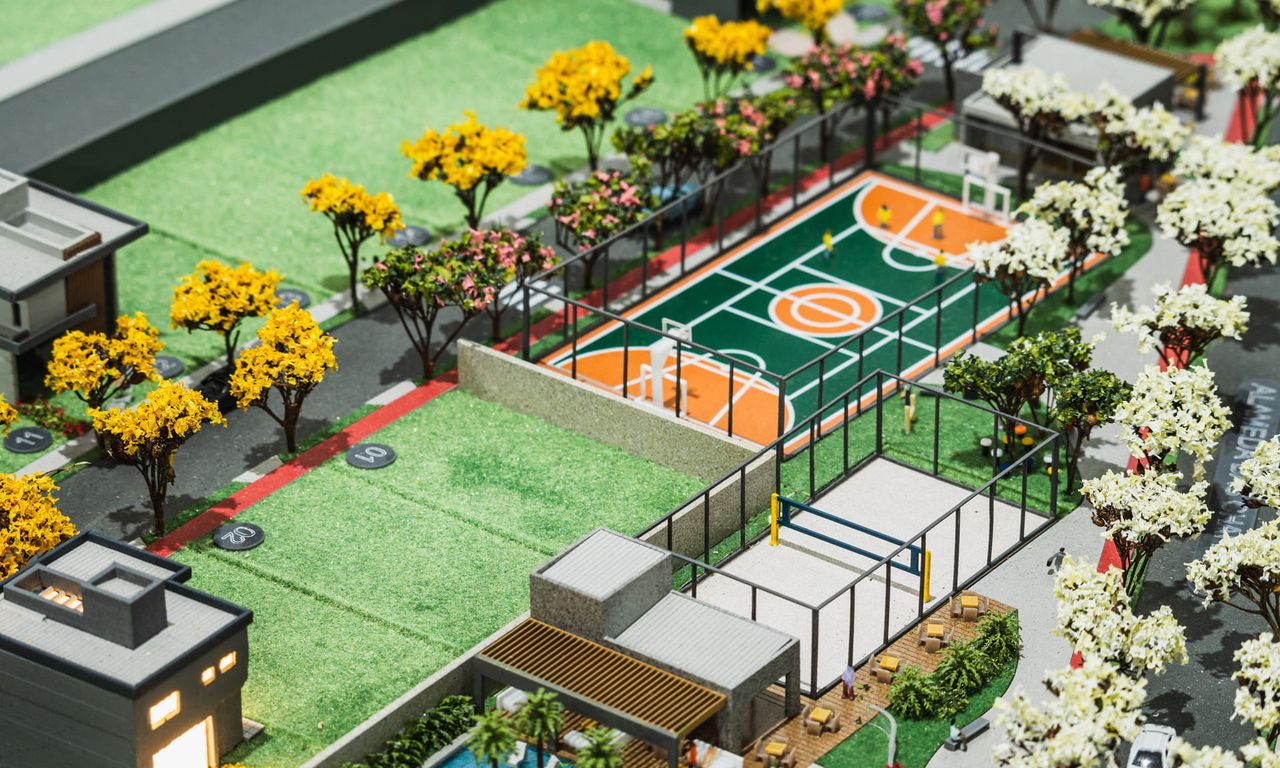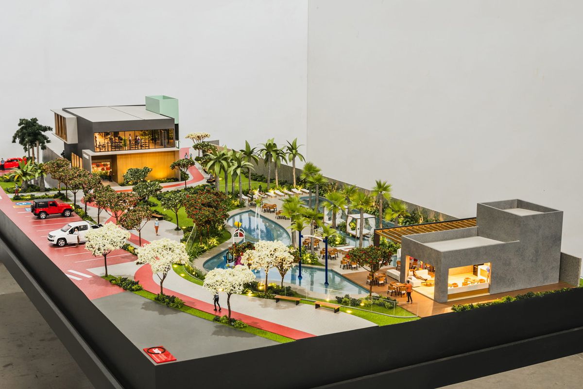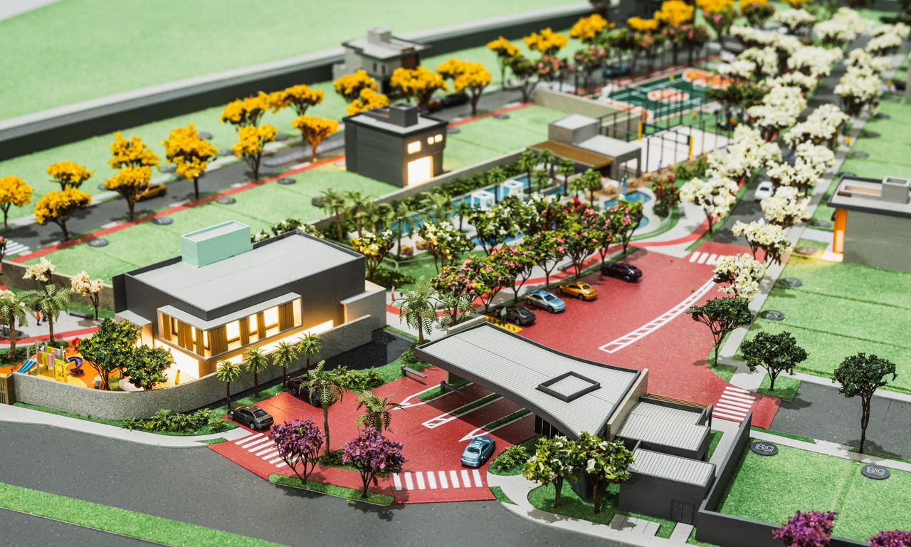 Neste projeto foram feitas duas maquetes, o do empreendimento completo e a ampliação. Aqui vamos falar do projeto na íntegra. Com escala 1/200, conseguimos representar todo o empreendimento de forma detalhada e precisa. Nossa maquete dá destaque especial para a parte do clube, que é a cereja do bolo. Mesmo com uma escala reduzida, conseguimos representar com fidelidade os brinquedos do parque aquático, a piscina, o playground e a vegetação ao redor. O detalhamento da maquete é impressionante: nós diferenciamos as árvores de acordo com seu porte e coloração, além de mobiliar a área do clube com peças que tornam o ambiente ainda mais agradável.