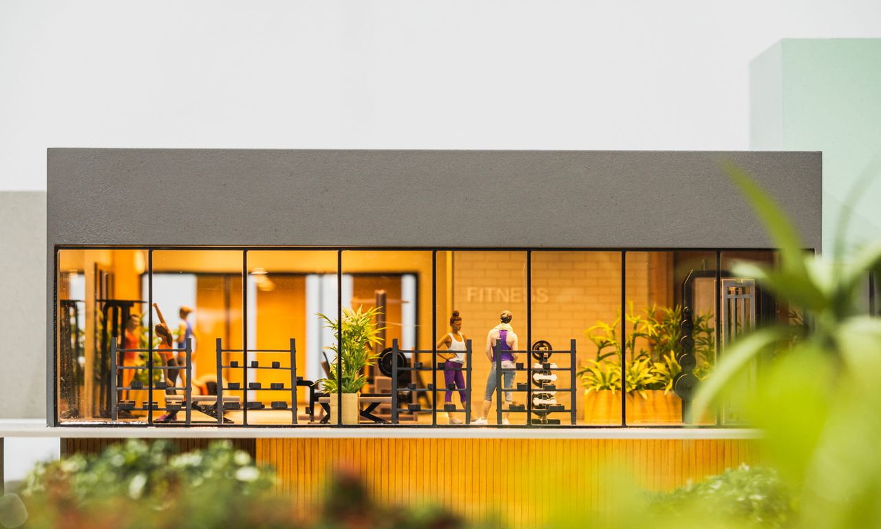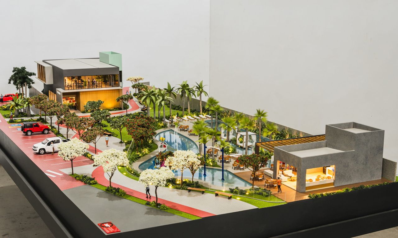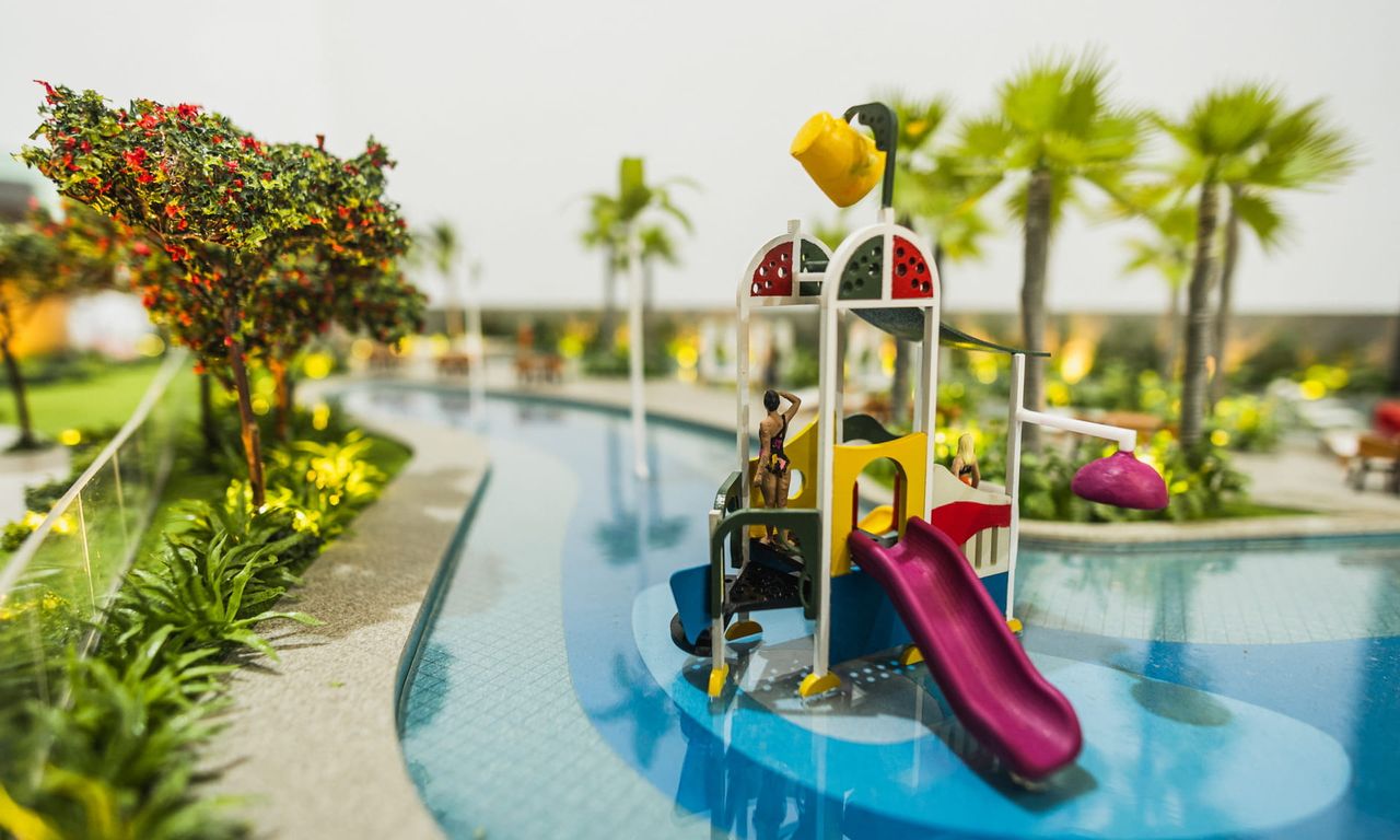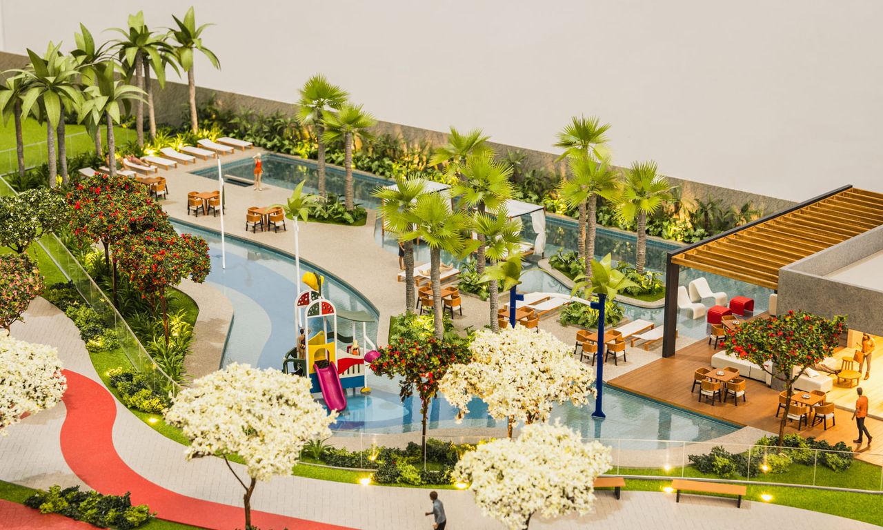 A ampliação do clube é o grande destaque deste empreendimento e a parte da piscina, conseguimos seguir todo o projeto de interiores, com mobiliários e iluminação que deixam o ambiente ainda mais charmoso e sofisticado. Os brinquedos nas piscinas e playgrounds foram detalhados com cuidado, e os mobiliários ao redor da piscina foram escolhidos a dedo para criar um ambiente confortável e relaxante. Para tornar a maquete ainda mais realista, usamos diferentes espécies de palmeiras e materiais como concreto aparente, madeira e texturas variadas.