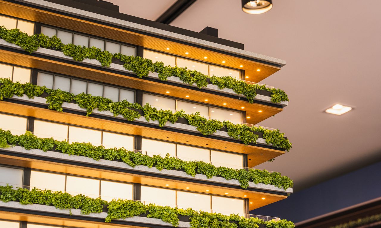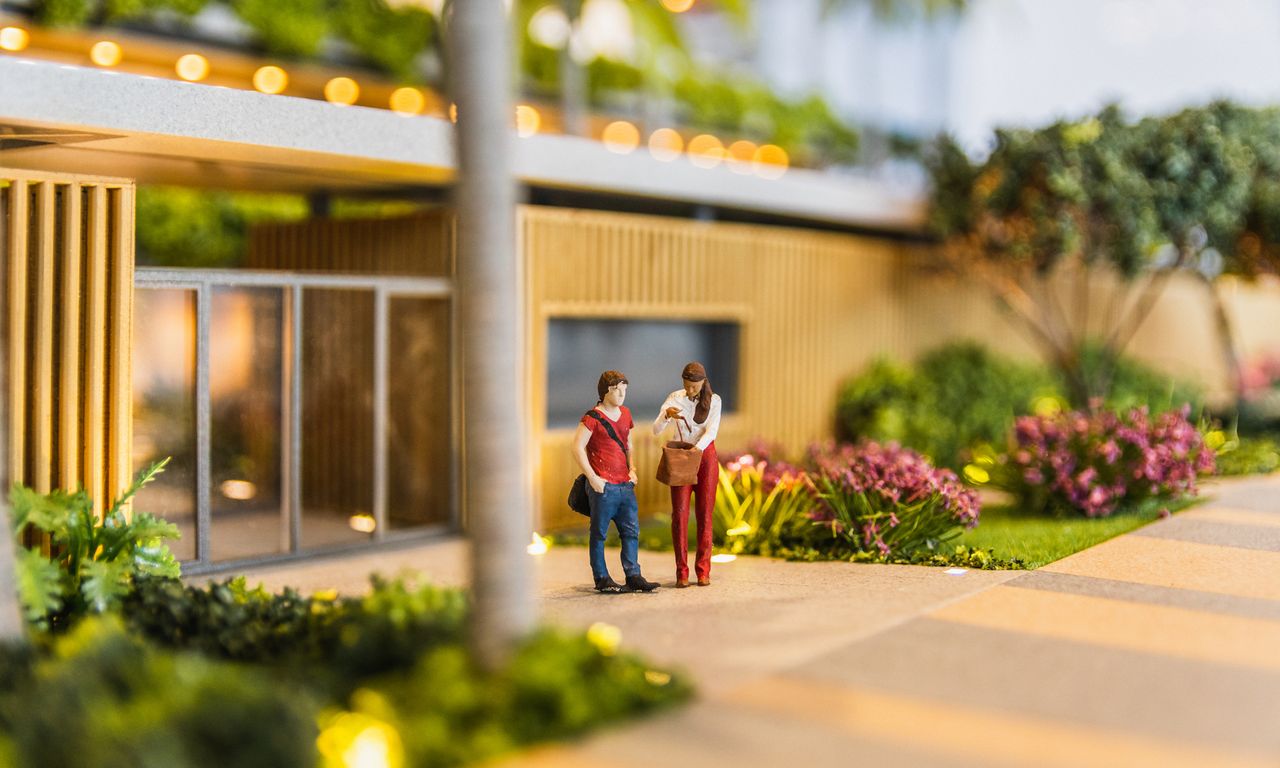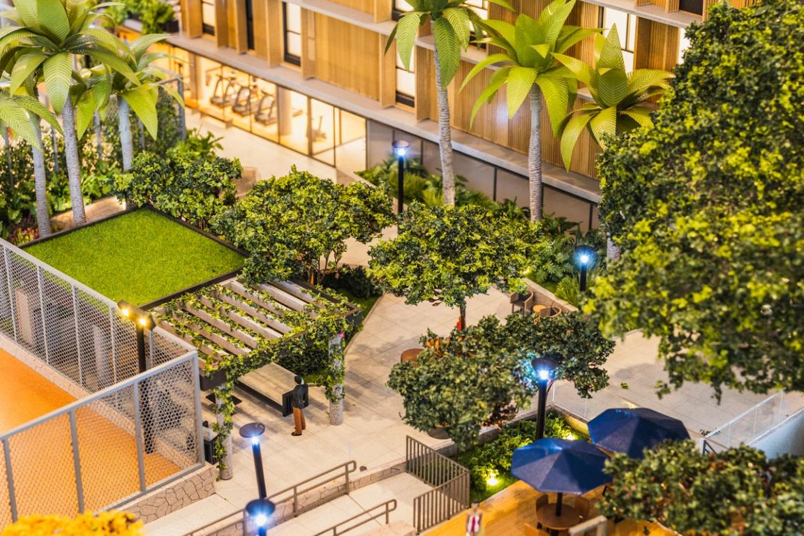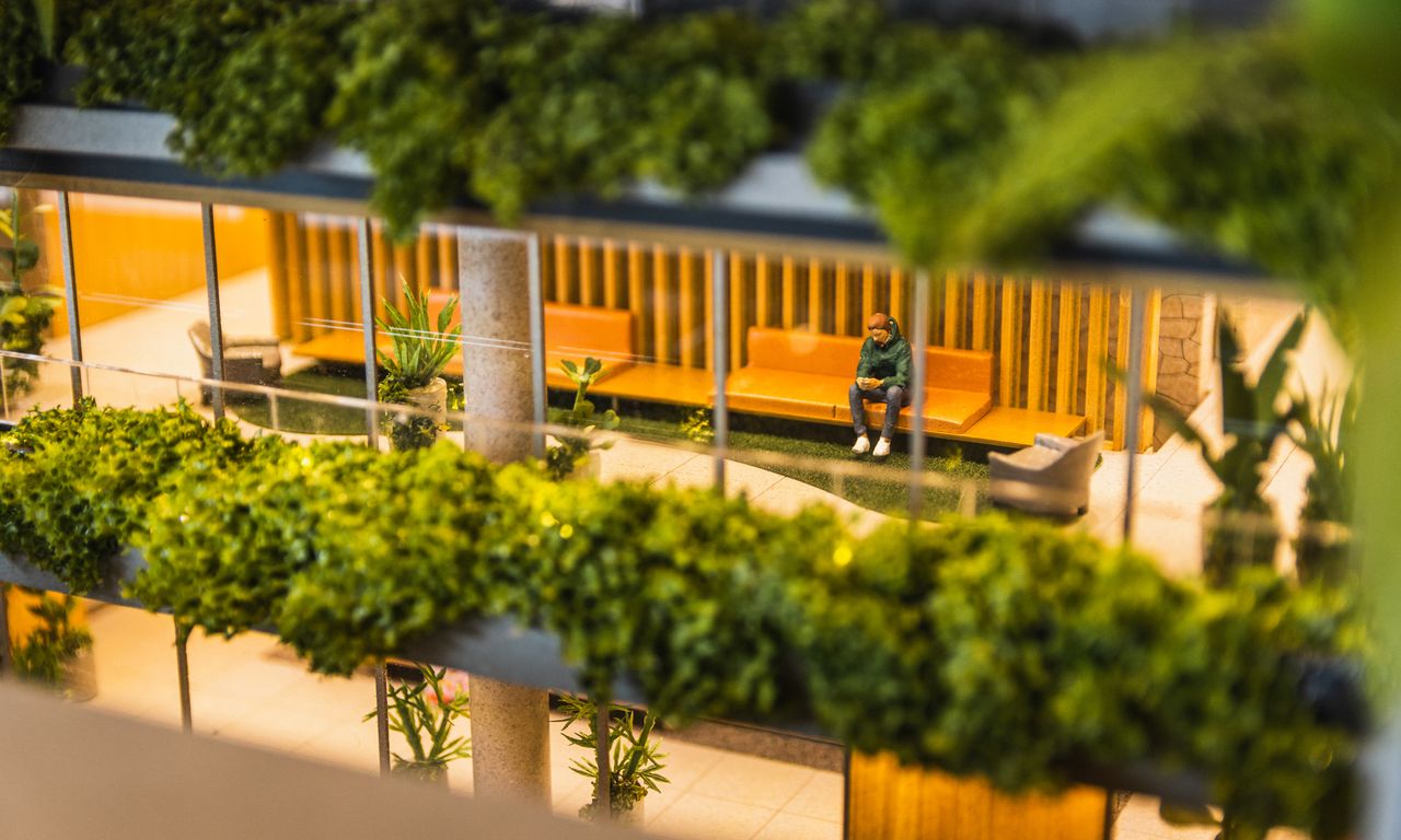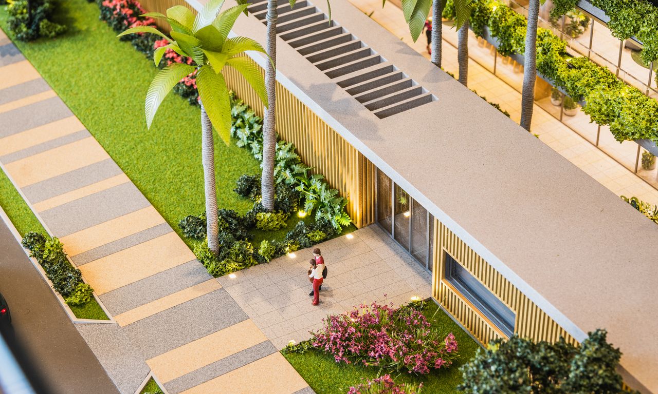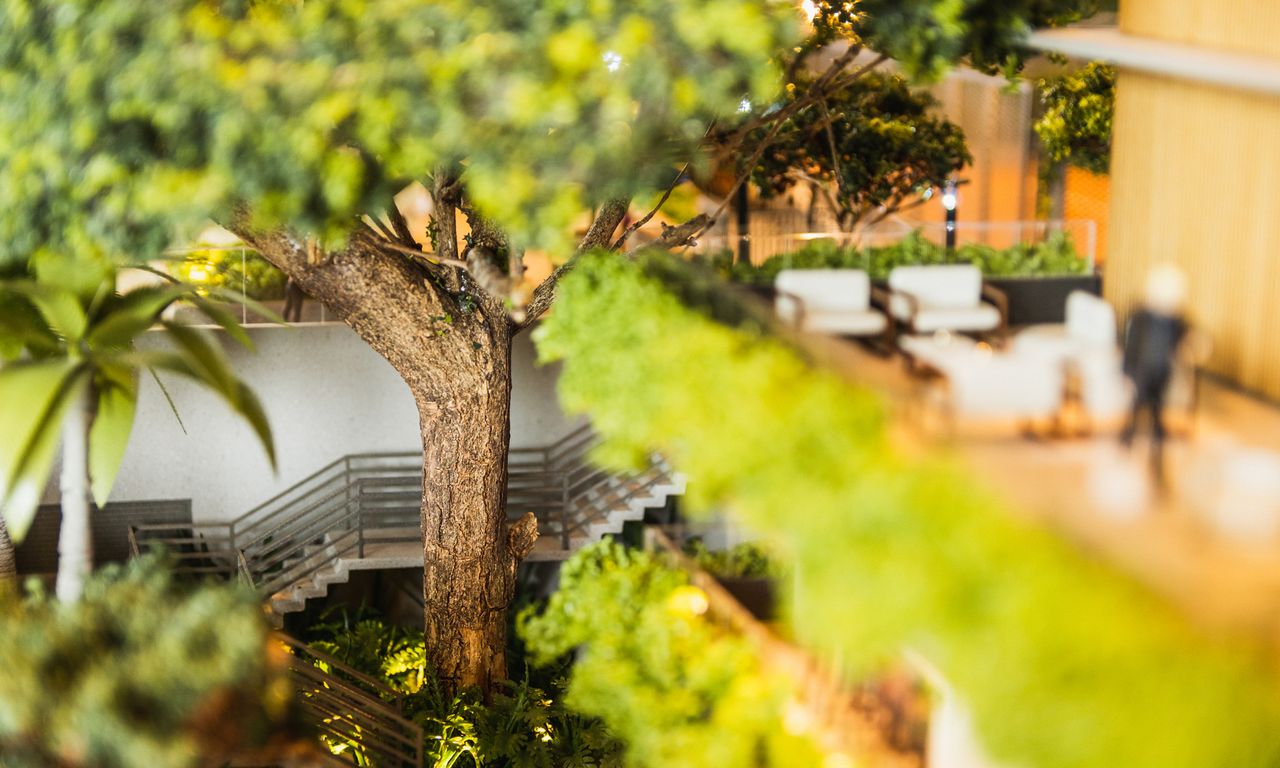 Uma preocupação importante do cliente foi a preservação de uma figueira existente no terreno. A maquete destaca a posição da árvore, que foi mantida e preservada no projeto. Todo esse cuidado e atenção aos detalhes resultou em uma maquete impressionante, que transmite a sensação de estar realmente vivendo no empreendimento.