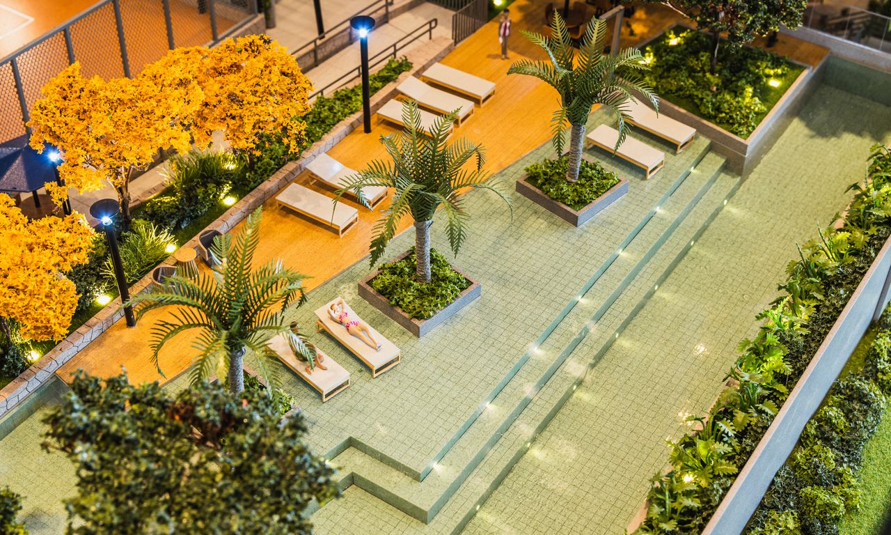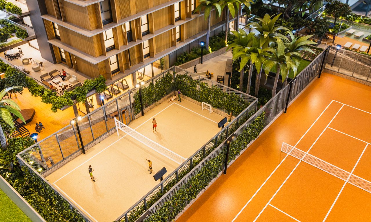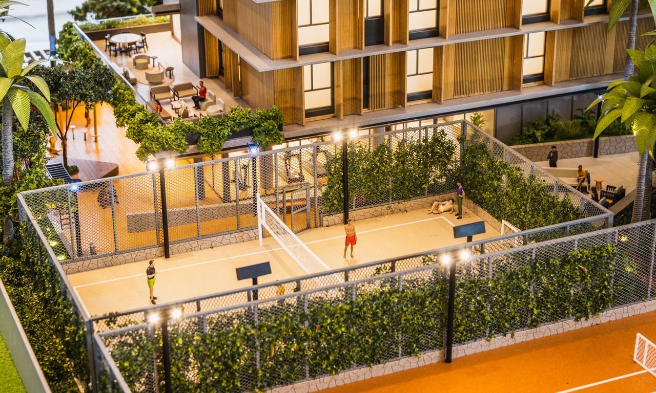 A implantação do empreendimento é semelhante a um clube, com muitas áreas de convívio, como quadras e piscina. A maquete foi pensada de forma a destacar essas áreas, com cenas de pessoas jogando, brincando e aproveitando os espaços. A ambientação interna também foi cuidadosamente planejada, com ambientes sociais mobiliados que aproveitam os grandes vãos das esquadrias.