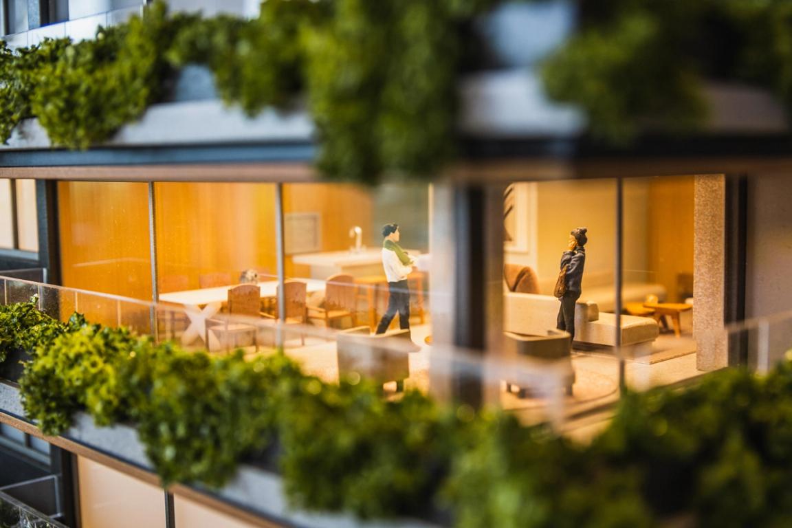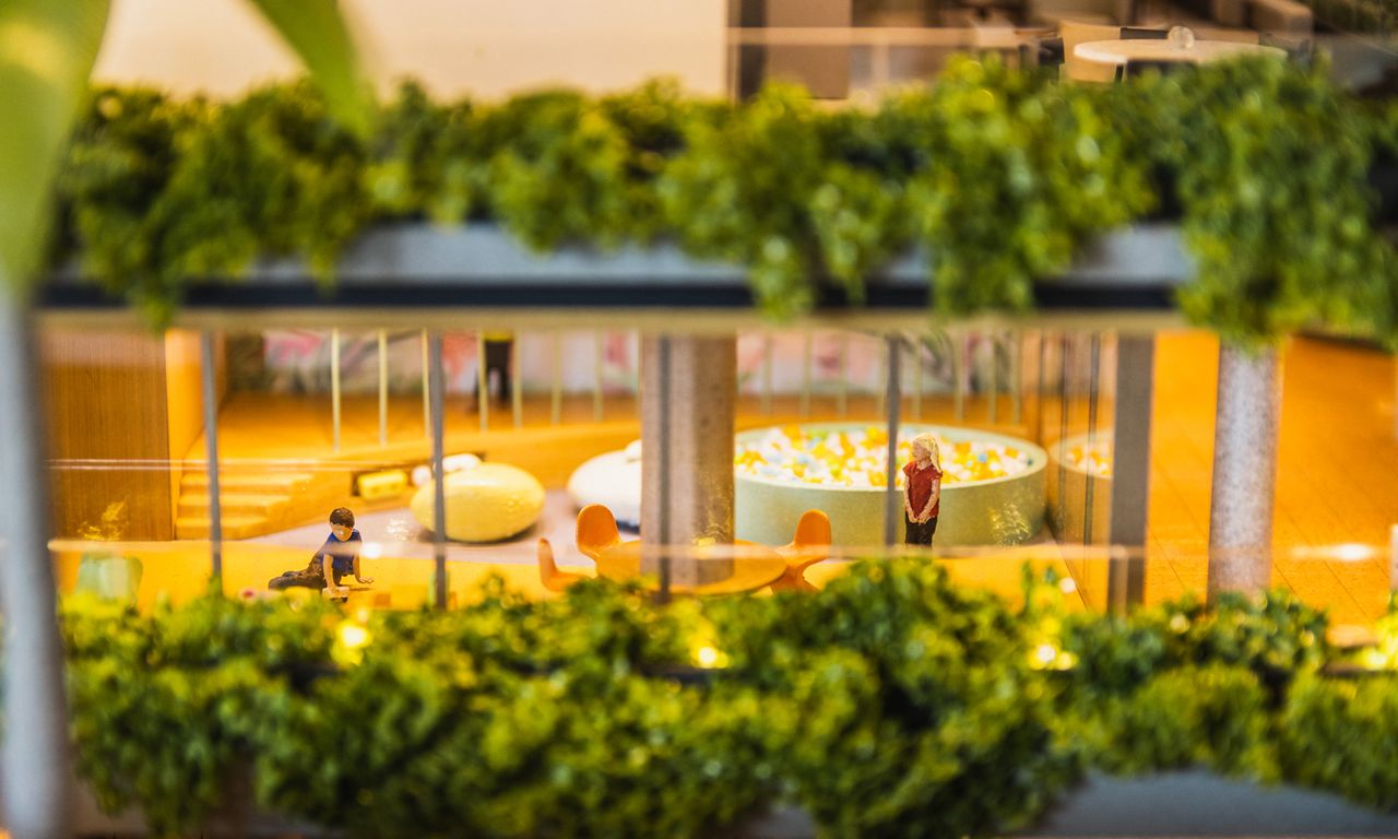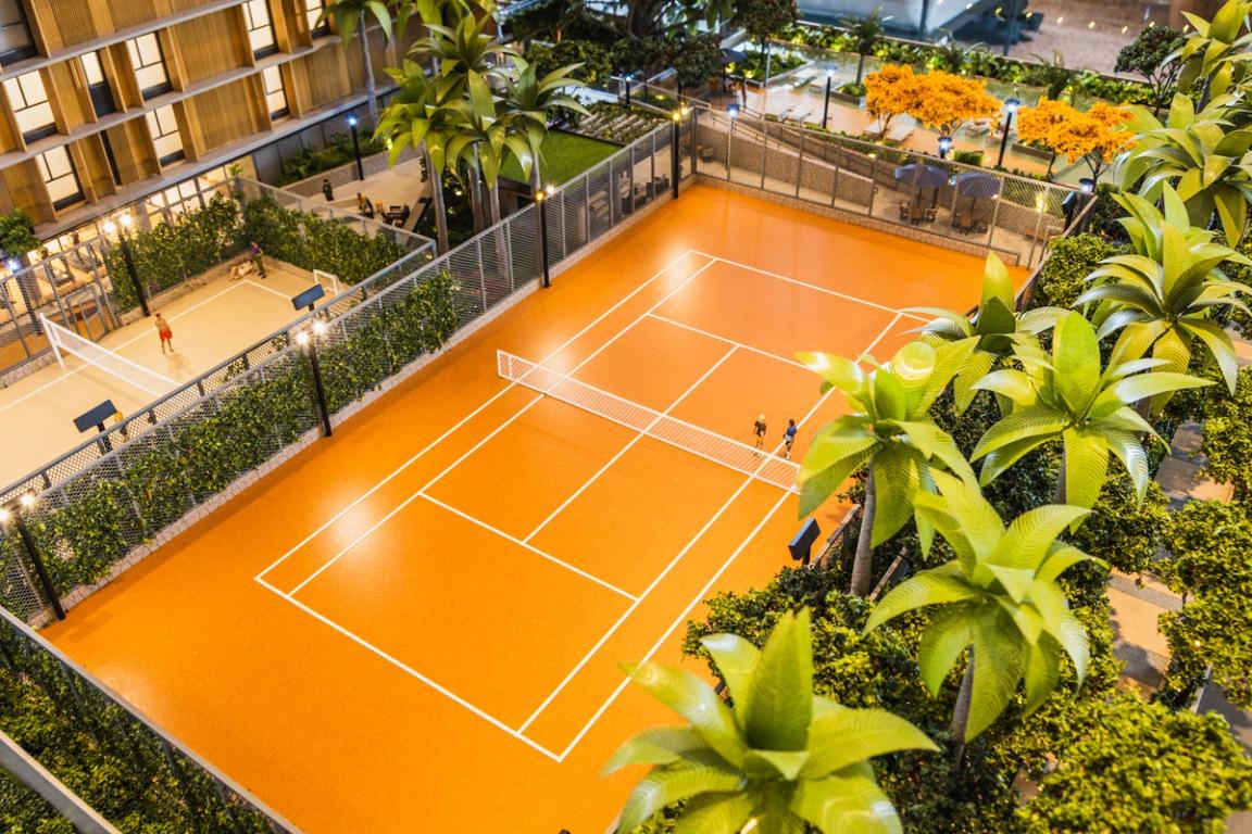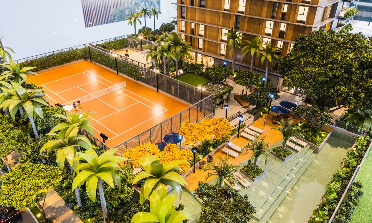 A implantação do empreendimento é semelhante a um clube, com muitas áreas de convívio, como quadras e piscina. A maquete foi pensada de forma a destacar essas áreas, com cenas de pessoas jogando, brincando e aproveitando os espaços. A ambientação interna também foi cuidadosamente planejada, com ambientes sociais mobiliados que aproveitam os grandes vãos das esquadrias.