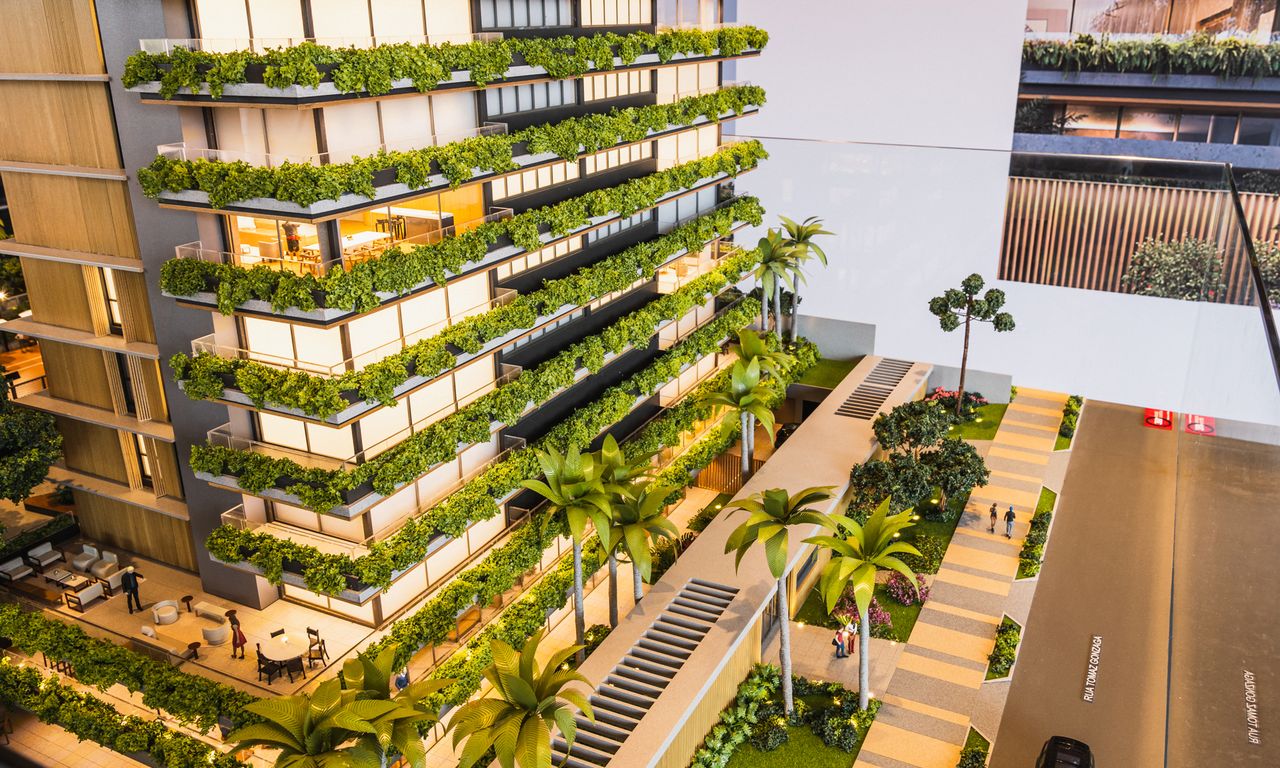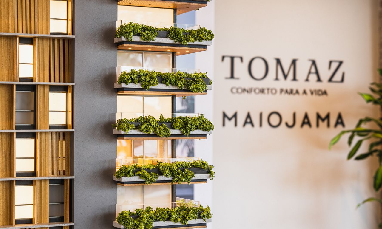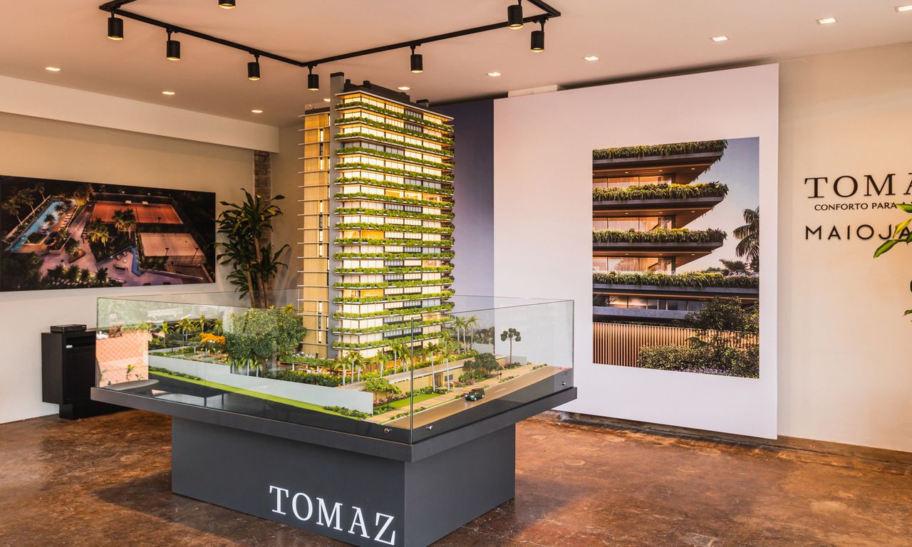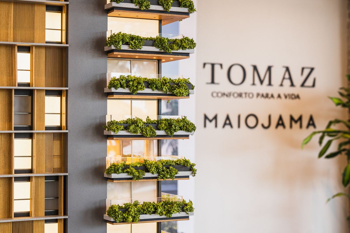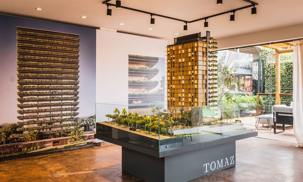 O empreendimento Tomaz é um projeto que se destaca por sua essência natural, baseado em elementos como vegetação, mata nativa e iluminação natural. A maquete do projeto é rica em detalhes e apresenta muita vegetação, o que confere uma atmosfera verde e densa ao projeto. Além disso, o arquiteto valorizou muito a iluminação natural e o uso de elementos vazados, como brises, que permitem a passagem da luz de forma sutil e elegante.