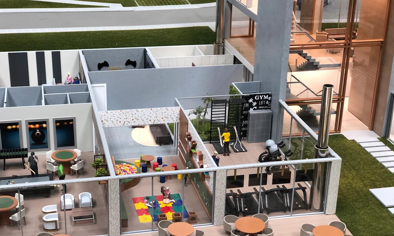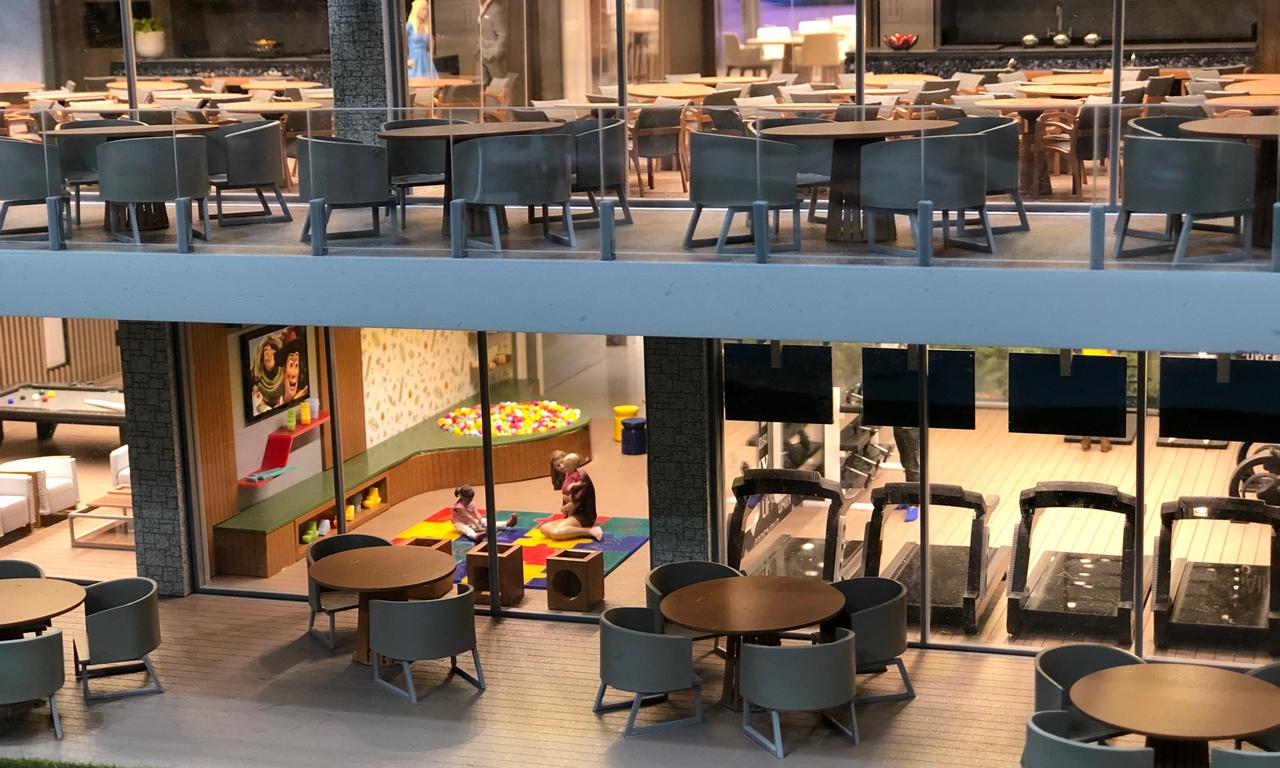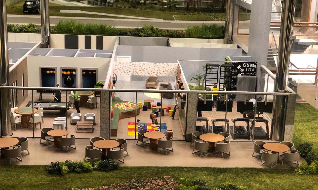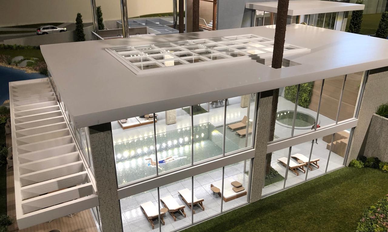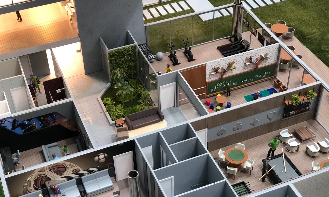 O requinte e riqueza deste projeto pediam uma ampliação da área do clube. 3 pavimentos com 2 pontos de automação permitem mostrar todos os ambientes internos e mobiliados. O projeto ajudou muito, mas sem sombra de dúvidas o Time da 360º foi a fundo em todos os requintes e detalhes de mobiliários, iluminação e humanização, deixando a maquete um show a parte na sala de vendas.