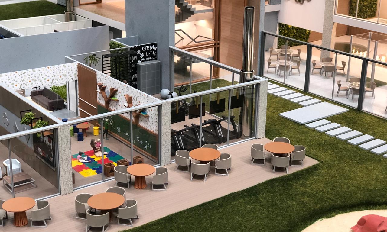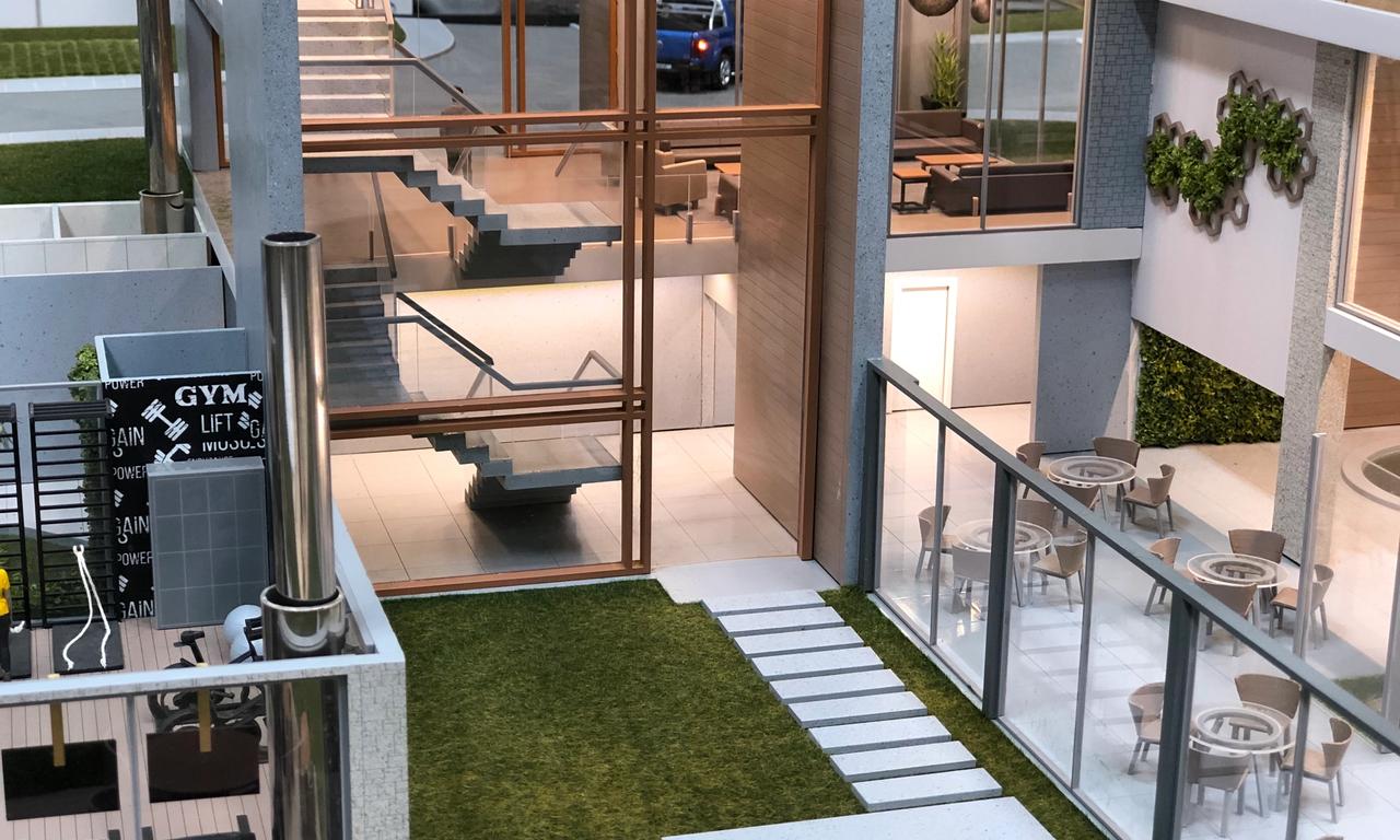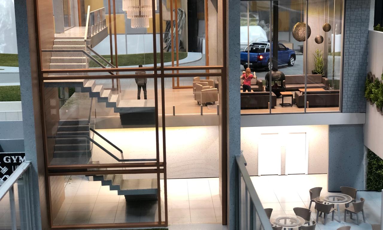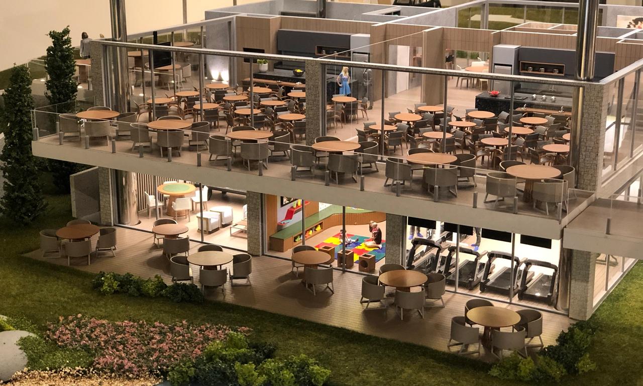 O requinte e riqueza deste projeto pediam uma ampliação da área do clube. 3 pavimentos com 2 pontos de automação permitem mostrar todos os ambientes internos e mobiliados. O projeto ajudou muito, mas sem sombra de dúvidas o Time da 360º foi a fundo em todos os requintes e detalhes de mobiliários, iluminação e humanização, deixando a maquete um show a parte na sala de vendas.