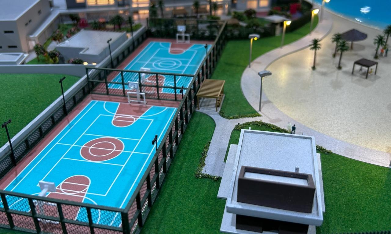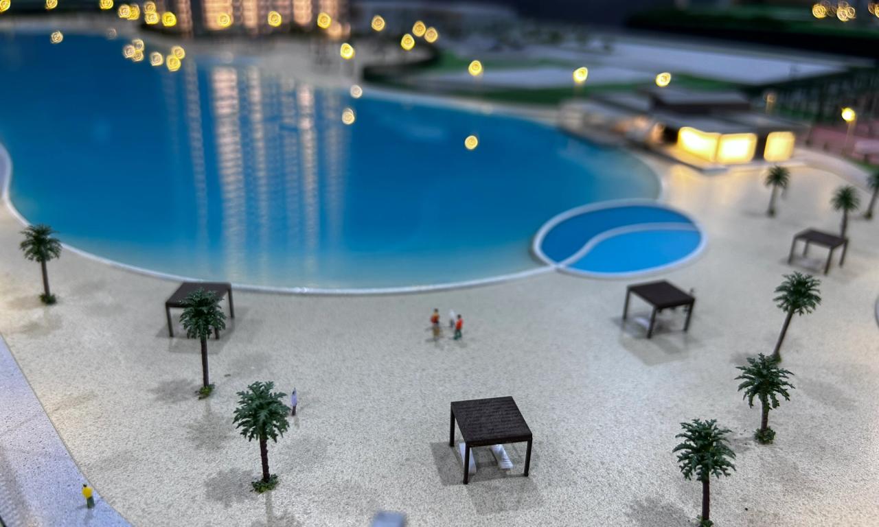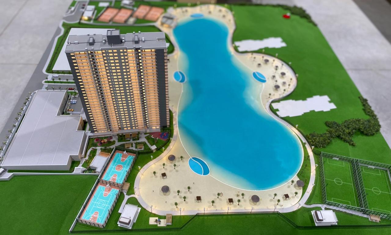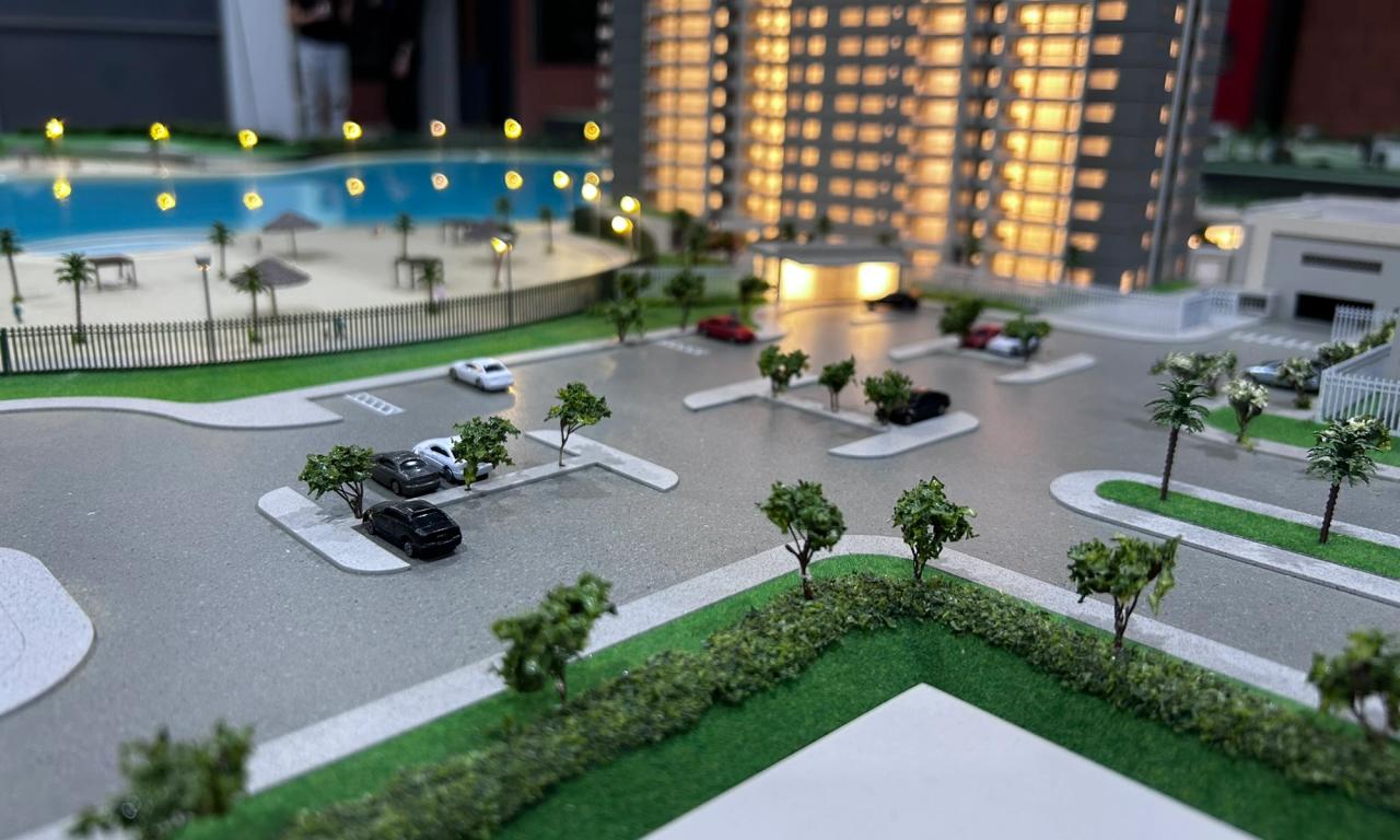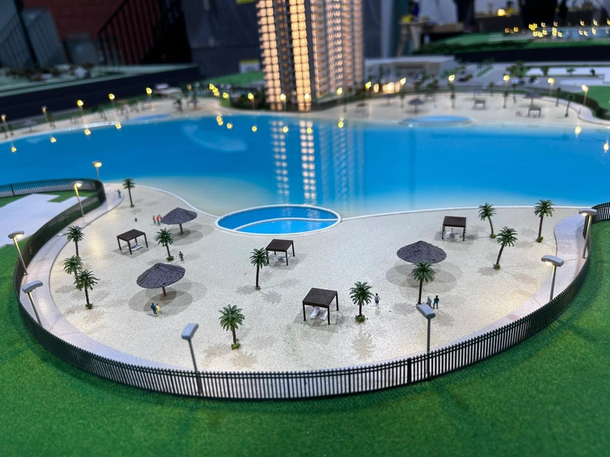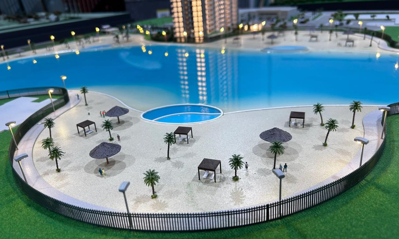A maquete destaca elementos marcantes como a praia artificial , com uma representação de água que transmite a atmosfera de um resort, além de circulações com elementos vazados, postes iluminados e cenários cuidadosamente representados. Mesmo com o tamanho compacto, conseguimos preservar a essência de elegância e inovação do projet.o