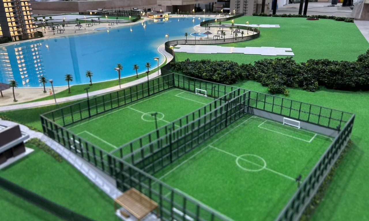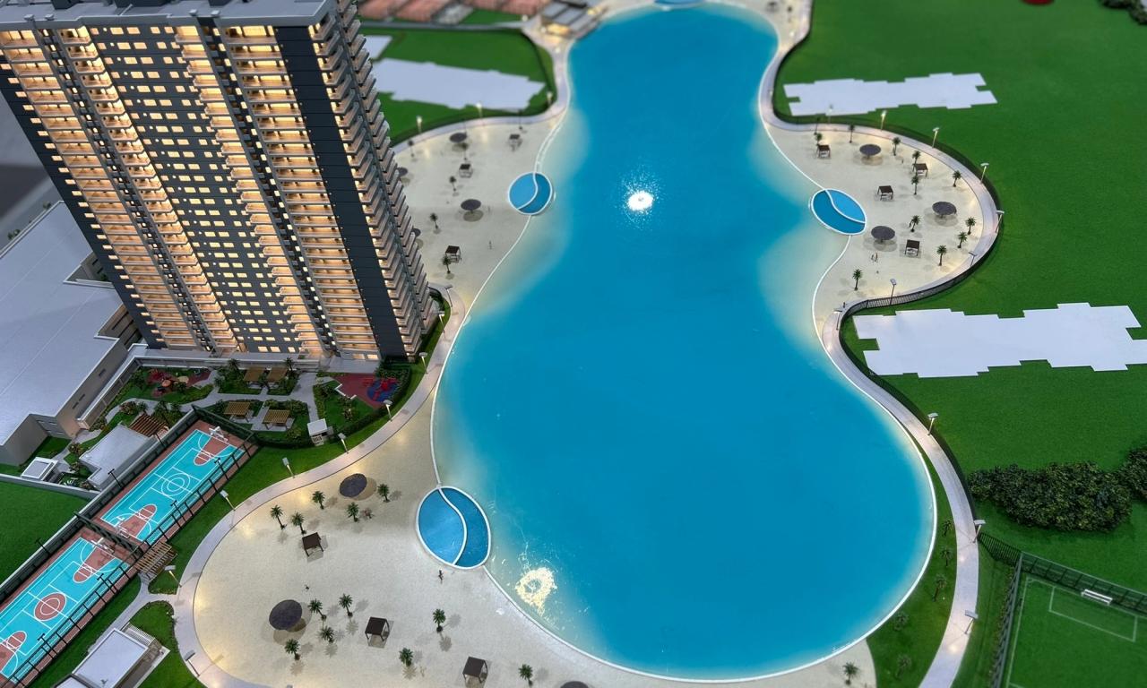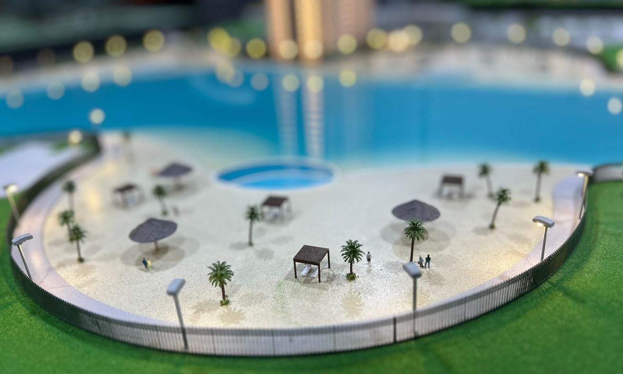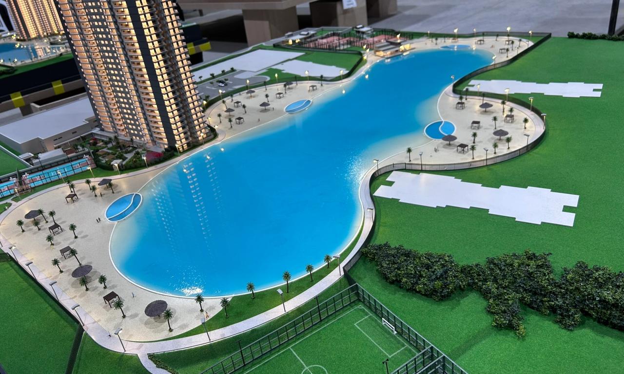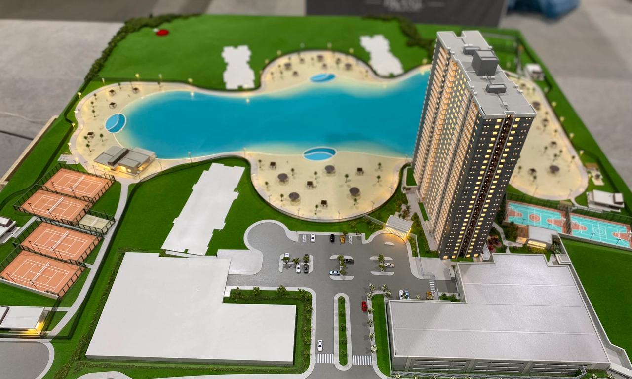 A maquete destaca elementos marcantes como a praia artificial , com uma representação de água que transmite a atmosfera de um resort, além de circulações com elementos vazados, postes iluminados e cenários cuidadosamente representados. Mesmo com o tamanho compacto, conseguimos preservar a essência de elegância e inovação do projet.o
