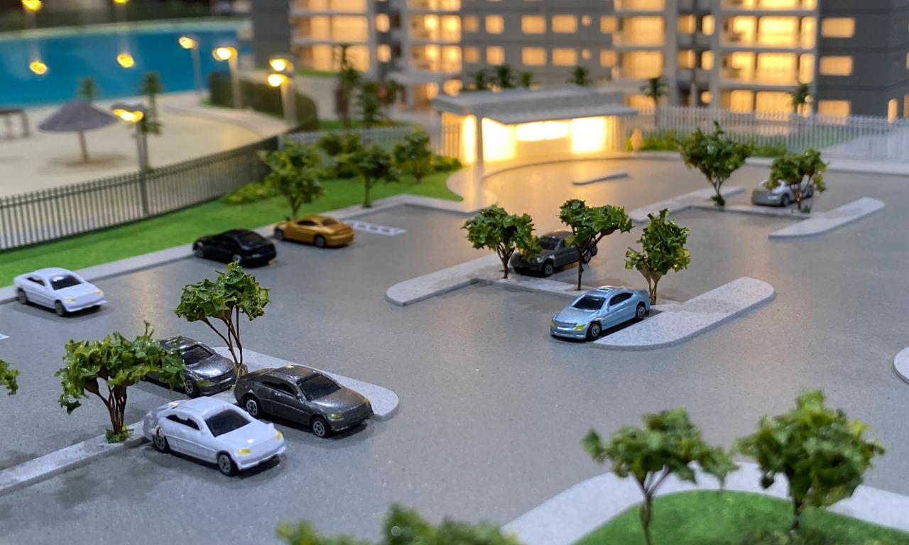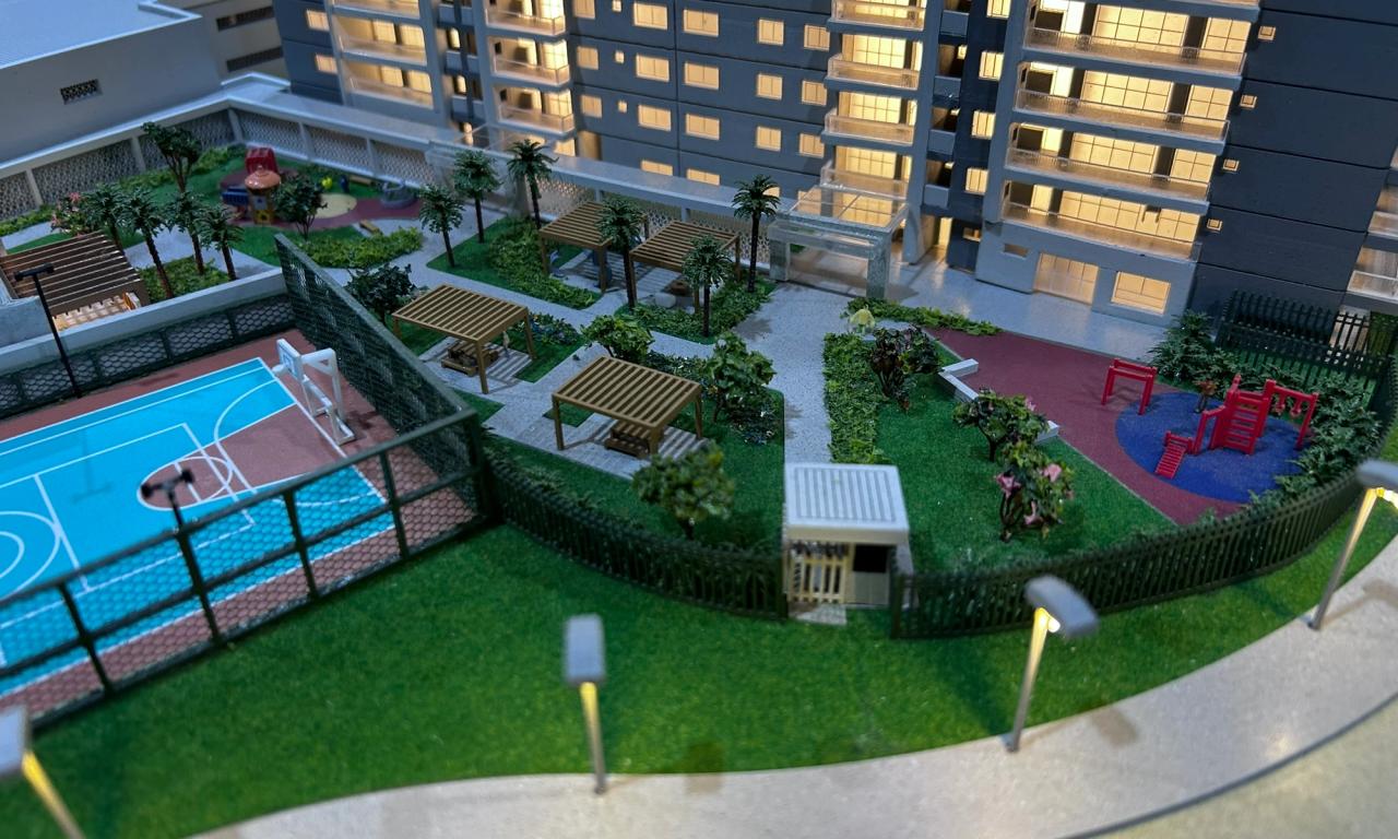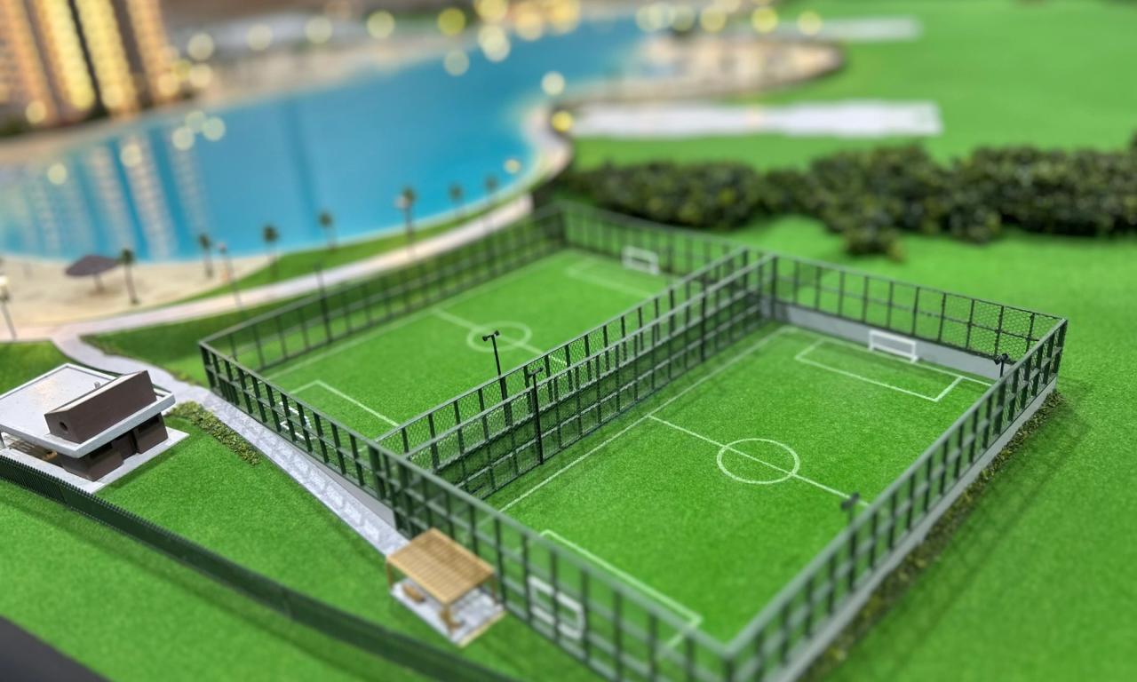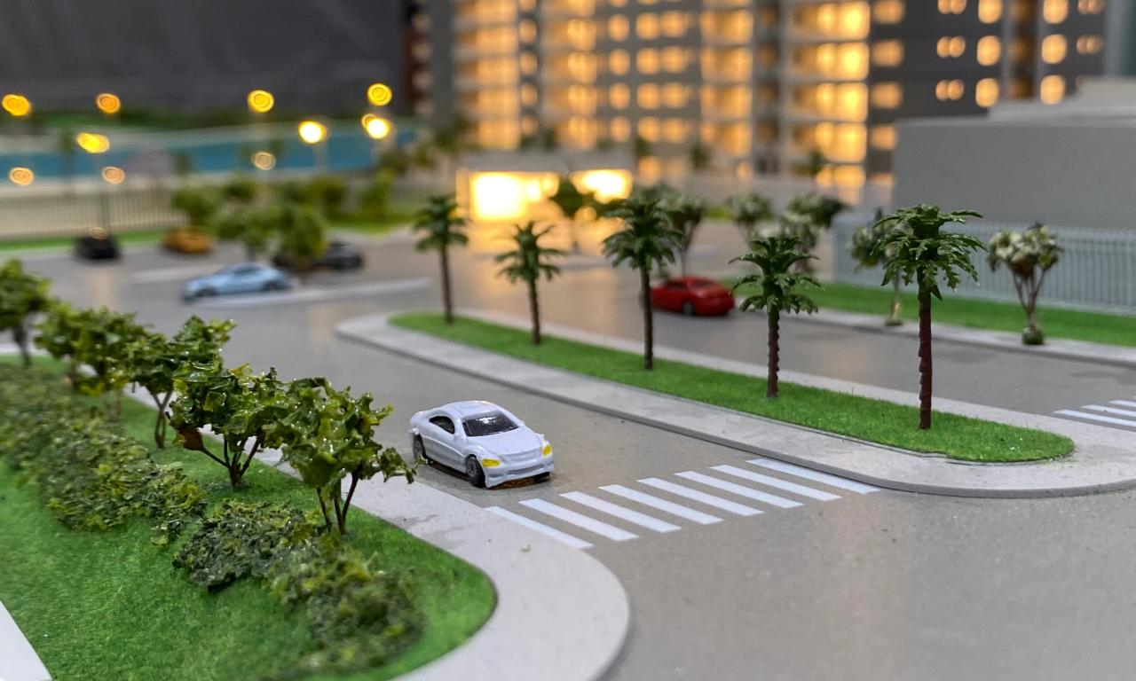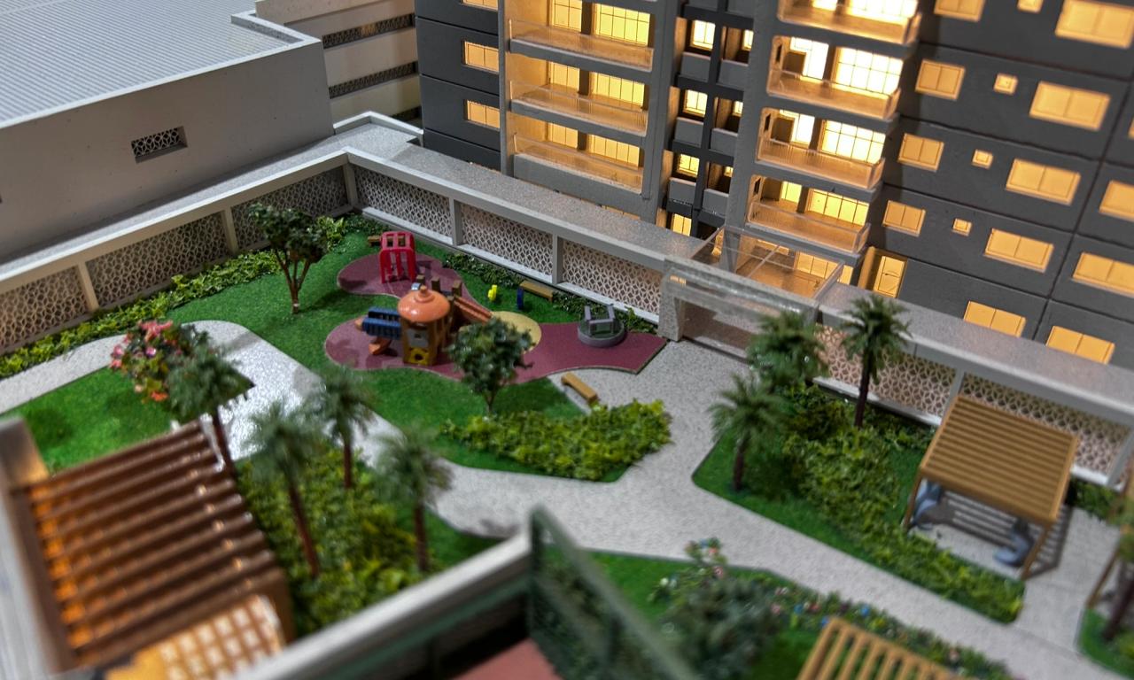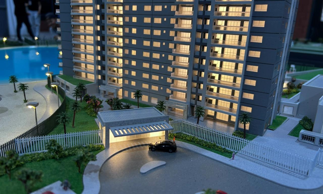 A maquete destaca elementos marcantes como a praia artificial , com uma representação de água que transmite a atmosfera de um resort, além de circulações com elementos vazados, postes iluminados e cenários cuidadosamente representados. Mesmo com o tamanho compacto, conseguimos preservar a essência de elegância e inovação do projet.o